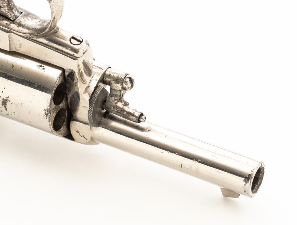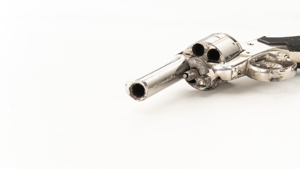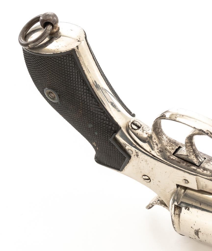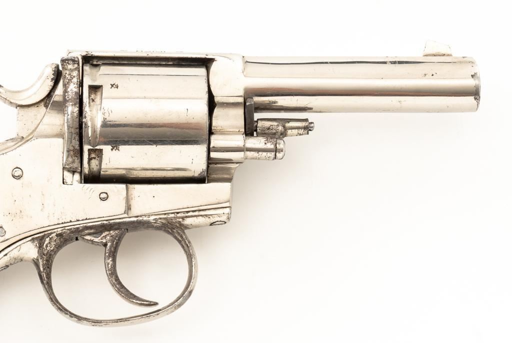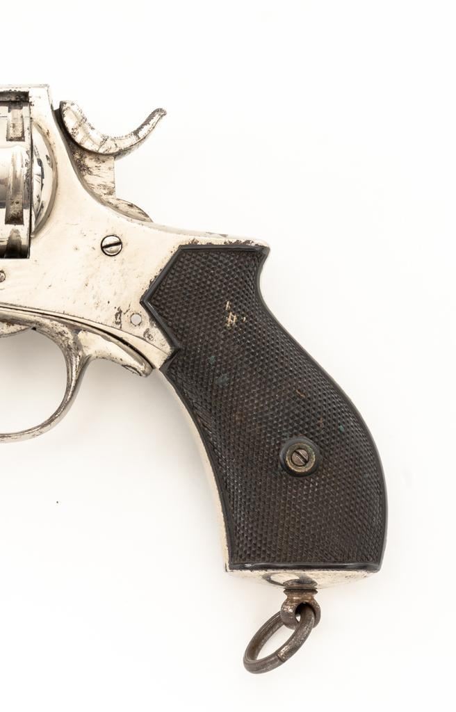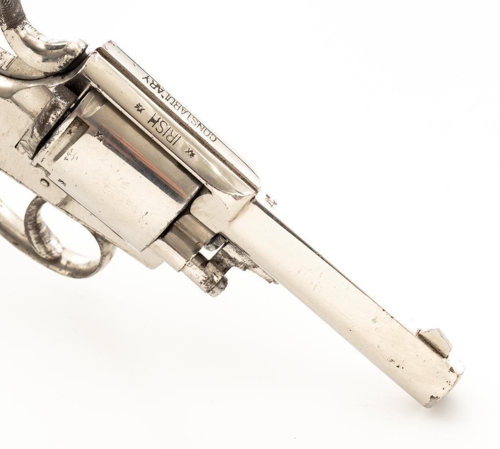 Irish Constabulary Marked Solid Frame Double Action Revolver with Holster, #NVSN, .380 Long cal., 3.25'' barrel, nickel finish, checkered grips, blade front sight, fixed rear sight with ''V''-notch and swiveling lanyard ring. The unmarked brown leather flap holster is in fair condition with overall wear and cracking. All stitching and fittings are present. Pistol is marked ''IRISH CONSTABULARY'' on top of the frame with an ''8 with arrow'' symbol on the left side, and numerous crowned ''(scepter)'' stamps to the frame, barrel, and cylinder. Additionally, there is a ''V'' stamped on top of the barrel. Condition overall is good, showing wear, flaking, and patina to the nickel. Grips are very good with light wear to the checkering. Action cycles smoothly in single and double action. The head is missing from the ejector rod and the assembly is jammed in the stored position. Bore and chambers are good, showing areas of patina with clear rifling. Est.: $250-$450. (Antique)