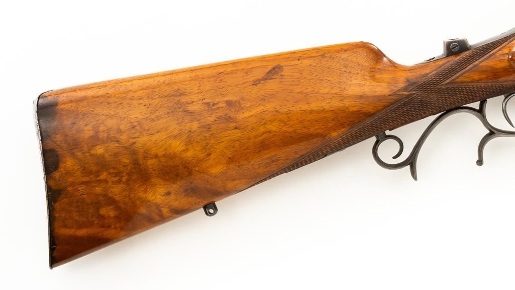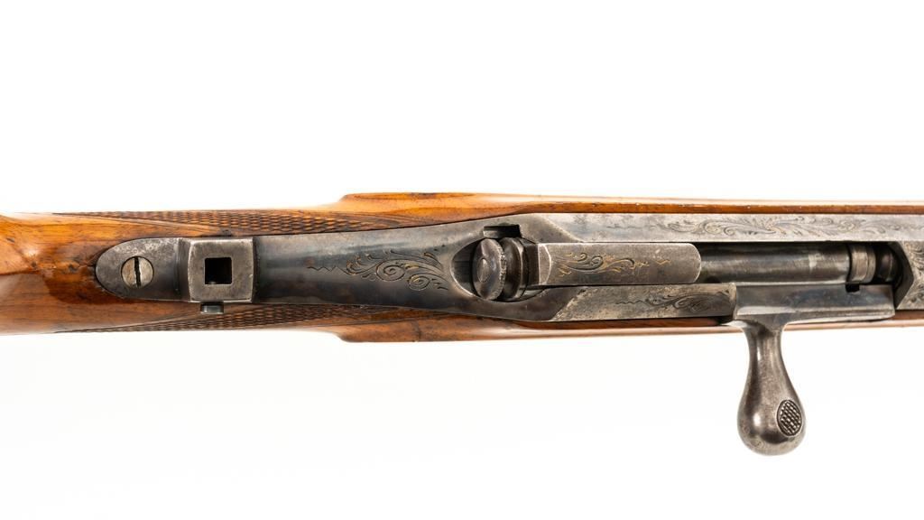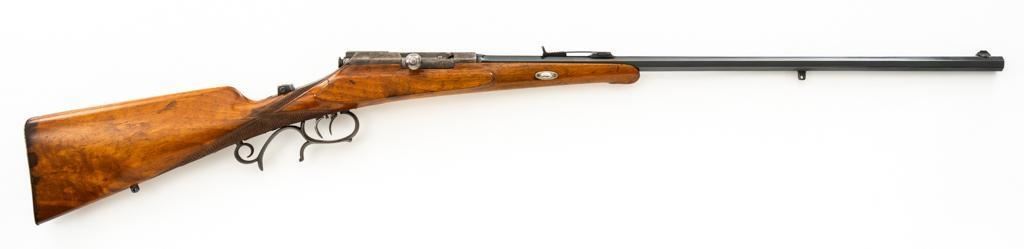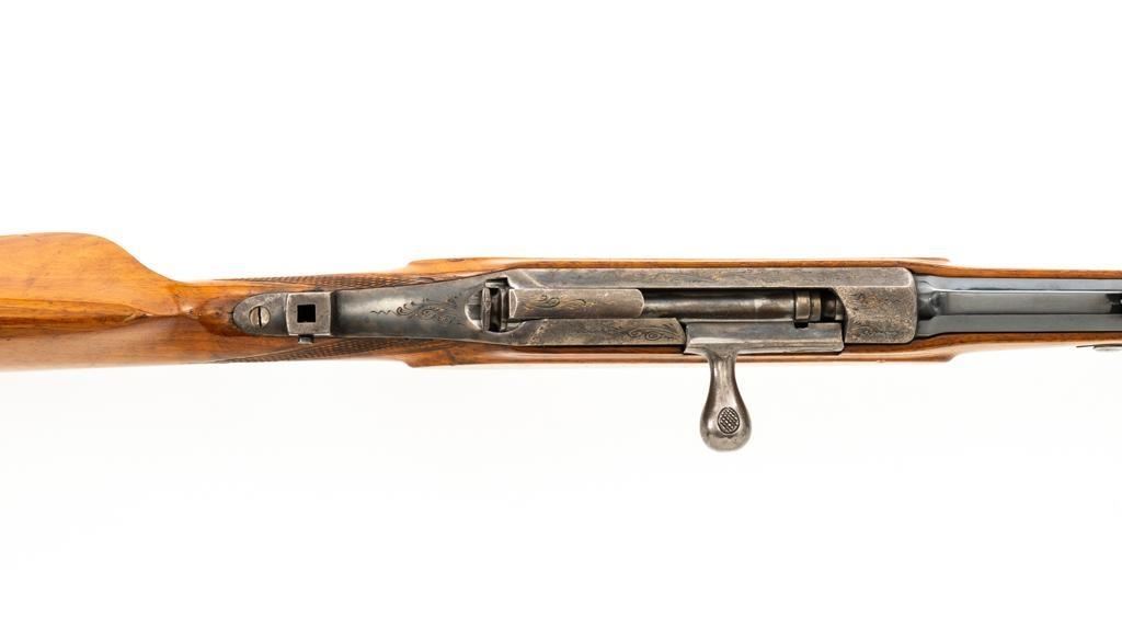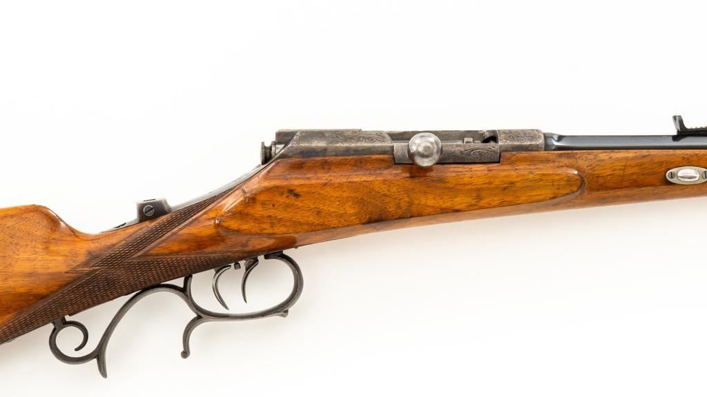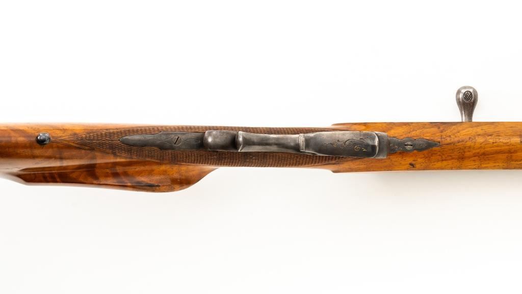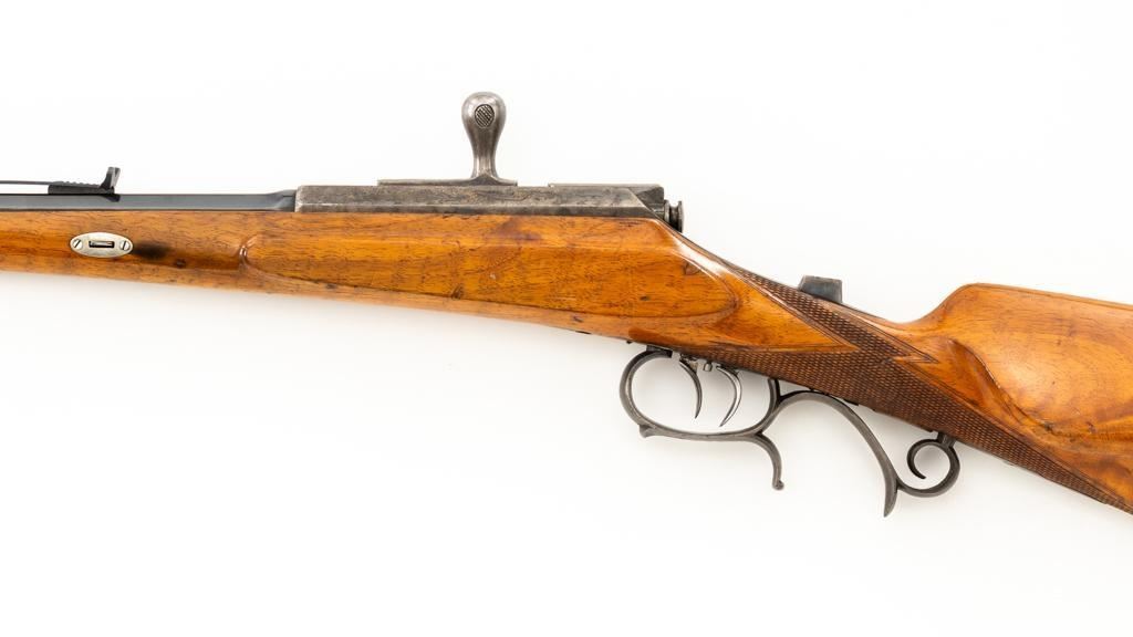 German/Austrian Stalking Rifle, #1164, 8.15x46mm cal., 26'' octagon blued barrel, color case hardened receiver, adjustable double set-triggers, blade with gold bead front sight and semi-buckhorn style rear sight. One-piece checkered hardwood stock with cheekpiece, un-checkered palm-swell forend, rear sling stud, and polished nickel buttplate. Underside of barrel with ''BUG'' proofs, also stamped ''172,28/9.065/1164''. Receiver is stamped with ''(Crown) B'' and ''(Crown)U''. Receiver, upper tang, and trigger guard have been lightly engraved with remnants of gold fill. Mfg'd circa 1893-1939. Overall condition of this rifle is fine, retaining approx. 95%-96% of its re-blued finish, and approx. 80% of the muted case colors; colors on the trigger guard have mostly toned to a gray/brown patina. Metal surfaces with scattered light handling marks. Stock has been refinished and shows scattered shallow surface dents and scratches; checkering is clean. Buttplate sits slightly proud of the stock at the toe and there is scattered oil staining at the butt. Metal to wood fit is very good. Action functions well. Bore rates very good overall with well-defined rifling. Est.: $500-$700 (C&R/PPT)