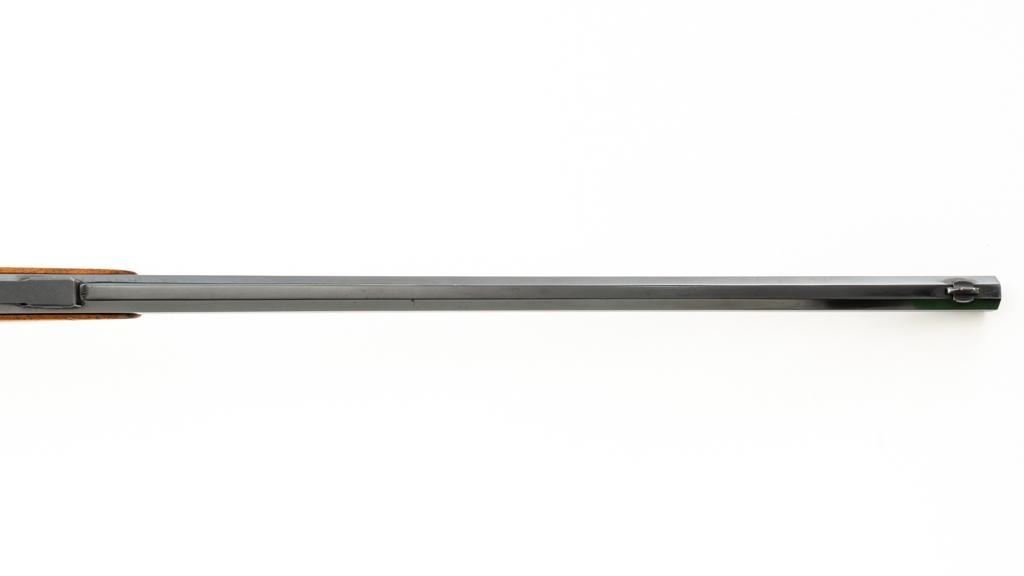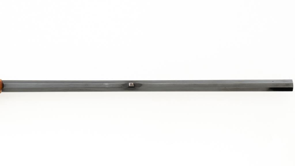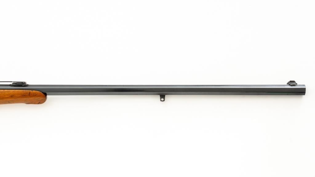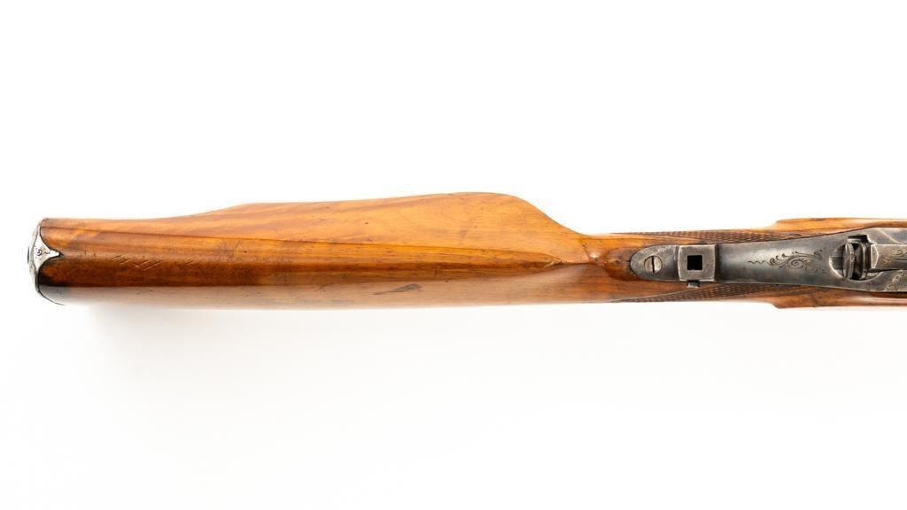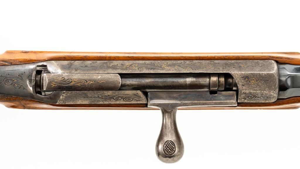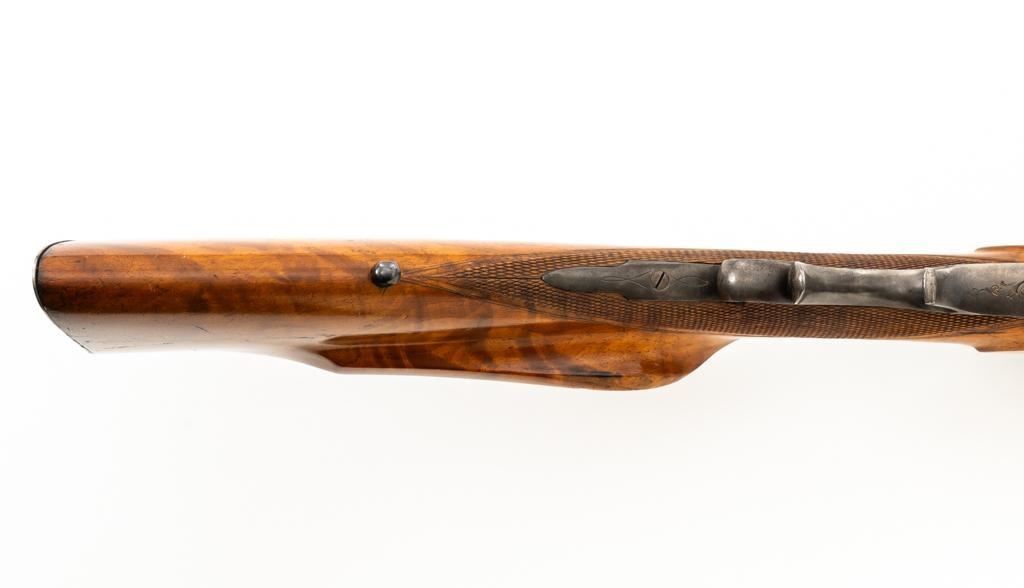 German/Austrian Stalking Rifle, #1164, 8.15x46mm cal., 26'' octagon blued barrel, color case hardened receiver, adjustable double set-triggers, blade with gold bead front sight and semi-buckhorn style rear sight. One-piece checkered hardwood stock with cheekpiece, un-checkered palm-swell forend, rear sling stud, and polished nickel buttplate. Underside of barrel with ''BUG'' proofs, also stamped ''172,28/9.065/1164''. Receiver is stamped with ''(Crown) B'' and ''(Crown)U''. Receiver, upper tang, and trigger guard have been lightly engraved with remnants of gold fill. Mfg'd circa 1893-1939. Overall condition of this rifle is fine, retaining approx. 95%-96% of its re-blued finish, and approx. 80% of the muted case colors; colors on the trigger guard have mostly toned to a gray/brown patina. Metal surfaces with scattered light handling marks. Stock has been refinished and shows scattered shallow surface dents and scratches; checkering is clean. Buttplate sits slightly proud of the stock at the toe and there is scattered oil staining at the butt. Metal to wood fit is very good. Action functions well. Bore rates very good overall with well-defined rifling. Est.: $500-$700 (C&R/PPT)