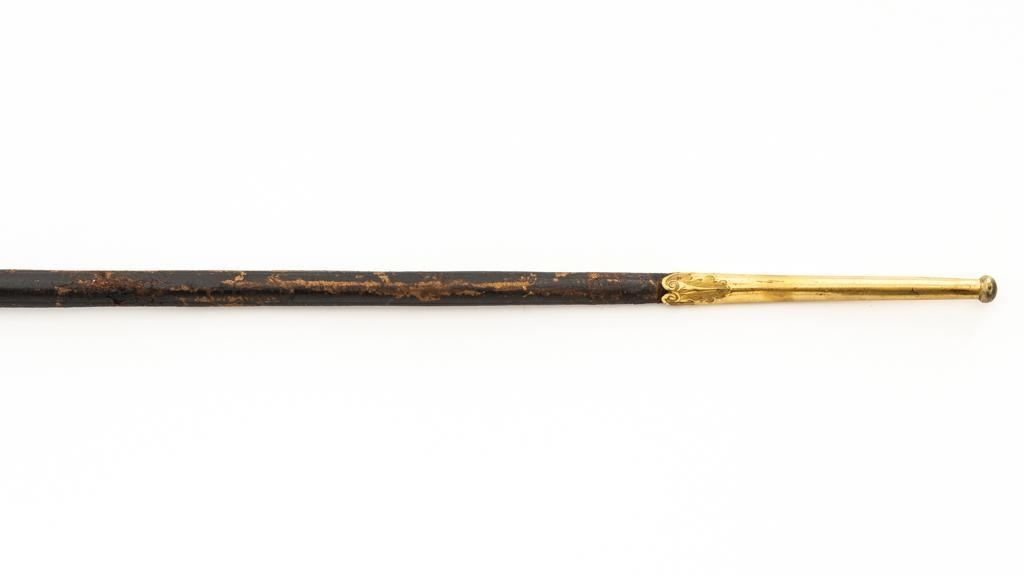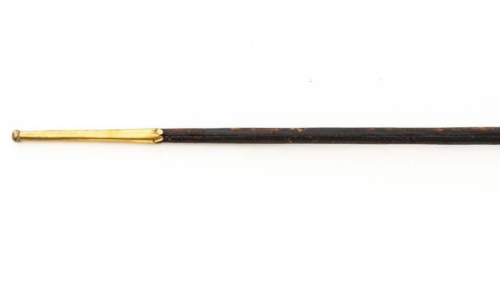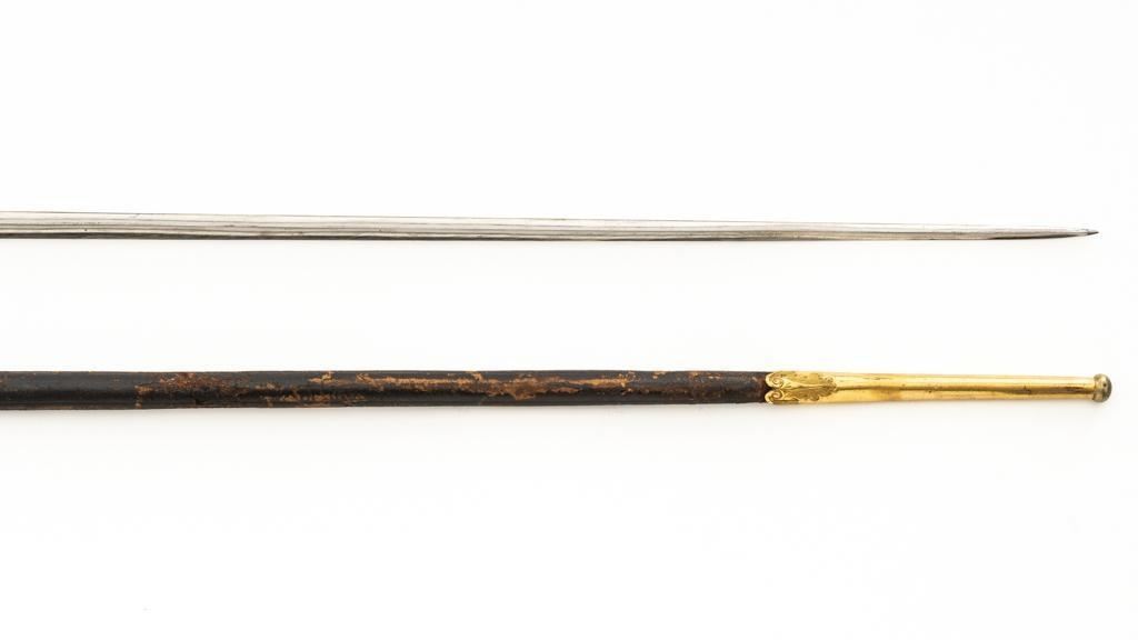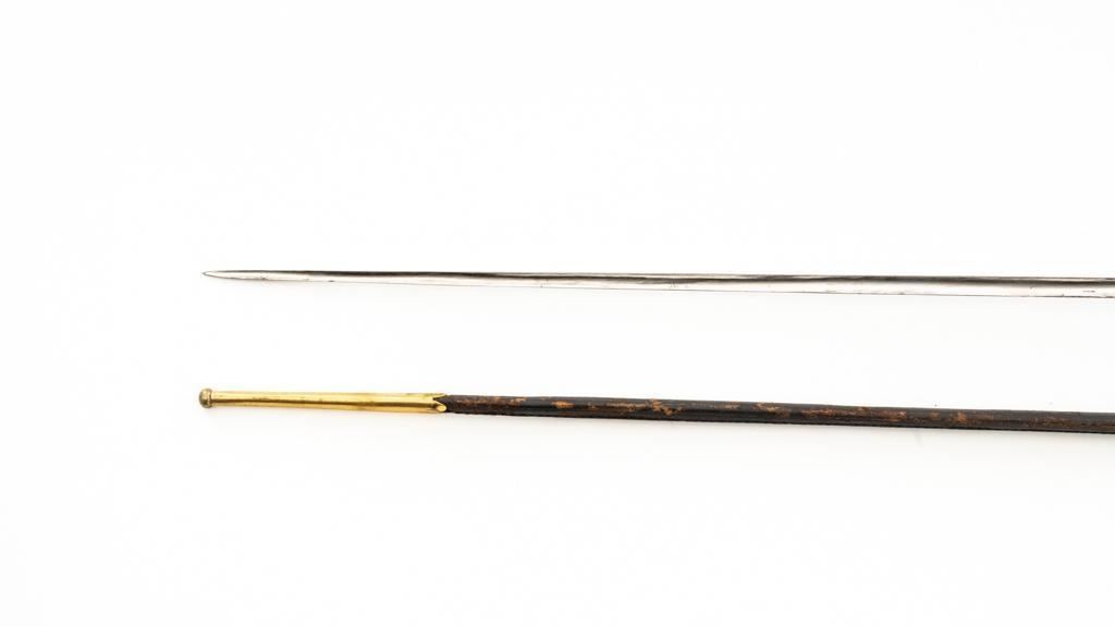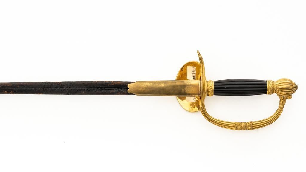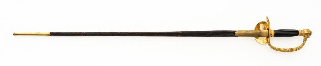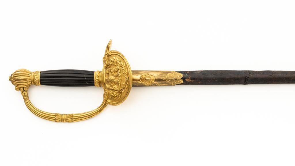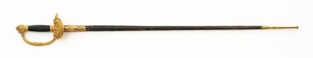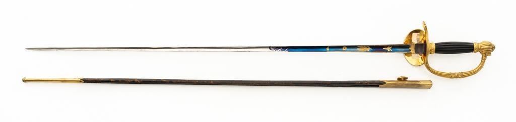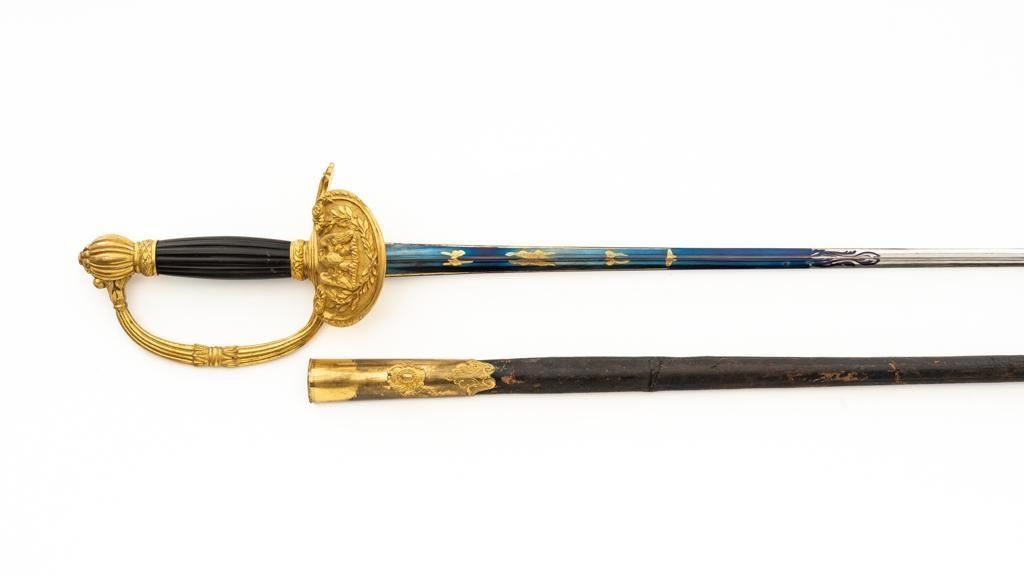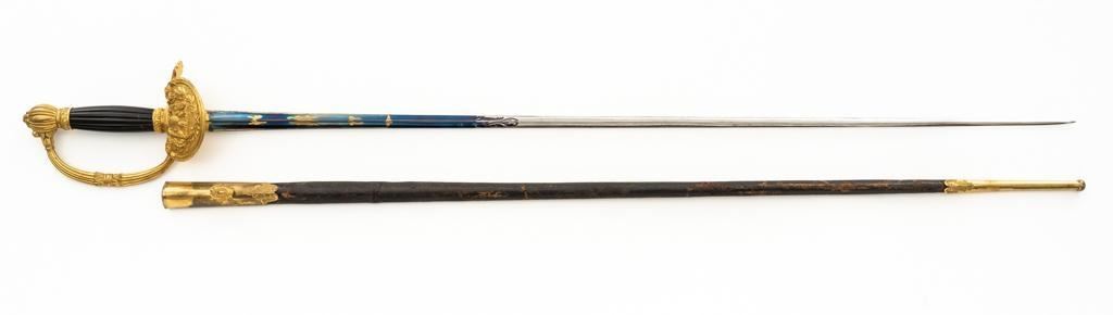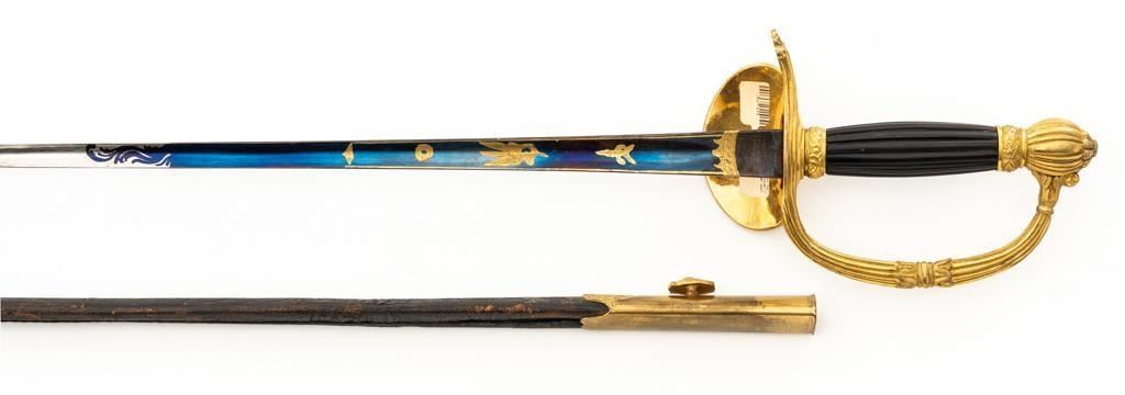 French Napoleonic Court Sword with Scabbard, 31''triangular blade, gold finished knuckle bow guard and clam shell embossed with a standing eagle surrounded by oak leaves, grooved black handle with ferrule, and bulbous pommel. The lower section of the bright blade has been blued and has acid etched golden motifs. Condition is fine, one section of the blade appears to have been damaged and re sharpened and there are scattered small dark spots. Point and guard are very good, handle fits firmly and shows small marks and scratches, especially to the right side. Scabbard has a gold finished locket and drag, with black leather body. Scabbard is in good condition, showing wear and some flaking to the leather. Est.: $400-$700.