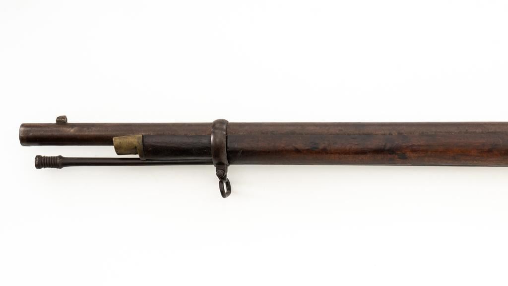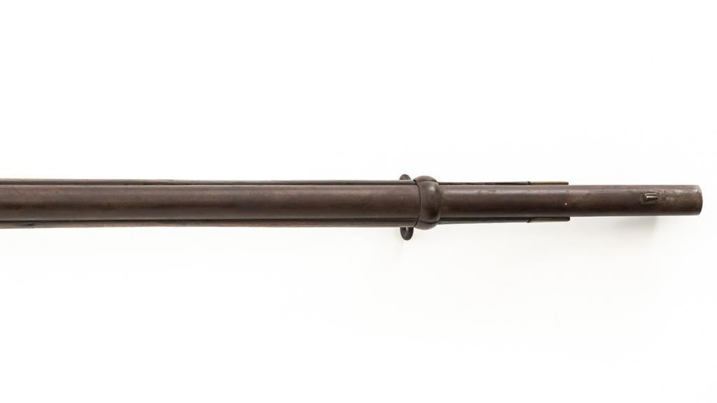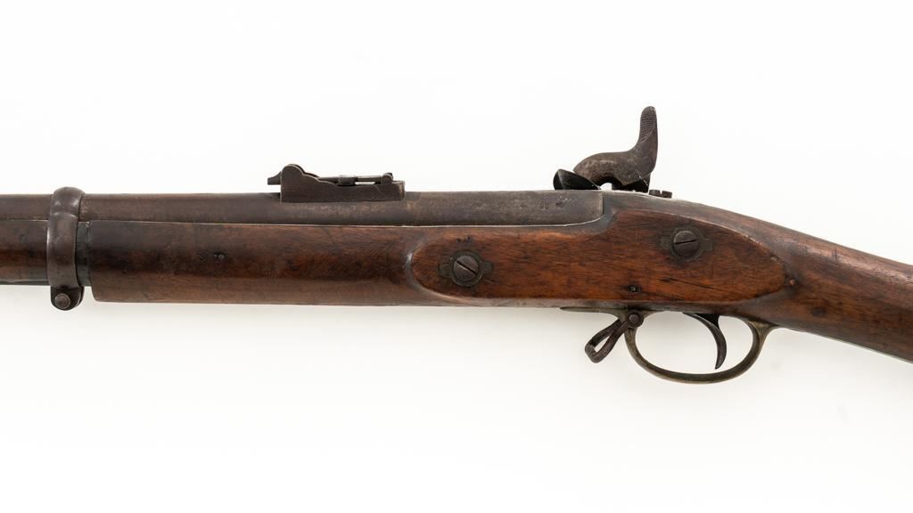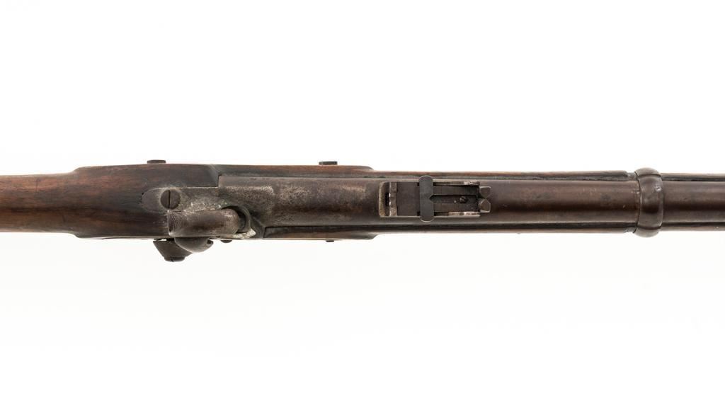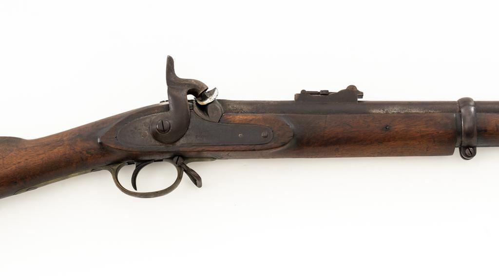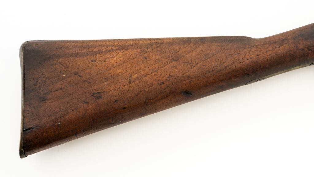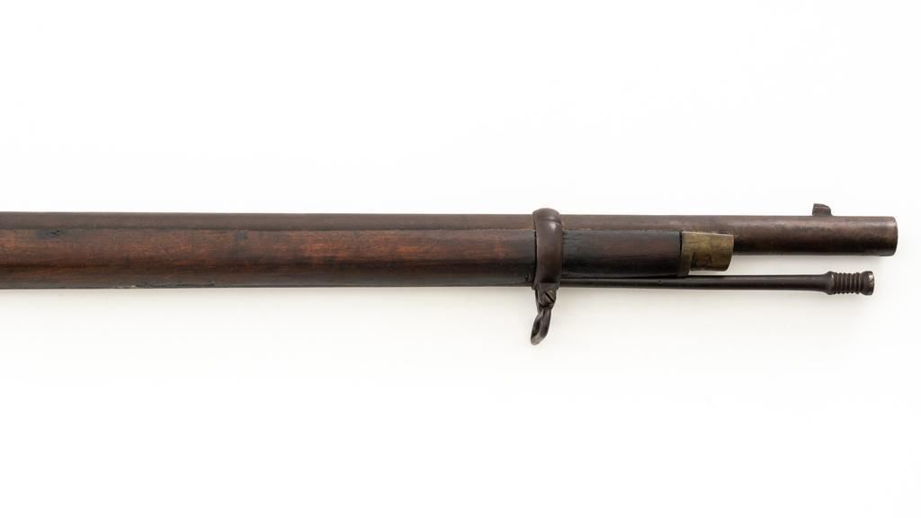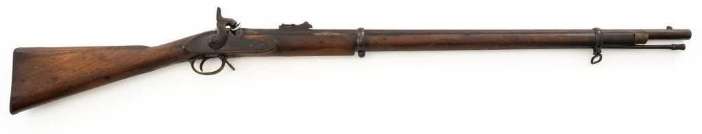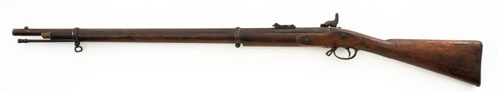 British Tower 2-Band Percussion Muzzle Loading Rifled Musket, #NVSN, .577 cal., 34'' barrel, browned finish, walnut stock, blade front sight, and adjustable folding leaf rear sight with wide ''V''-notch, graduated to 900 yards. Includes the iron rammer. Lockplate has two-line engraving and is marked ''(Crown)'' and ''1863/TOWER''. There proof, view, and ''25'' stamped on left side of the barrel. Right side of the buttstock with ''(Crown)BSAT/BIRMINGHAM SMALL ARMS''. Condition overall is good, musket has not been cleaned, and the iron parts show a dark brown patina, with old pitting to the barrel adjacent the lock. There is a round guard below the nipple and the outside edge has been flattened. Brass trigger guard and forend cap have darkened with age. Stock is in good condition, with expected marks from use, general darkening, and an old 1'' crack behind the lockplate. A section of wood appears to be missing from the right side of the barrel tang. Action operates smoothly; hammer holds in half and full cock position. Bore rates fair with moderate surface rust, rifling is visible. Est.: $600-$800. (Antique)