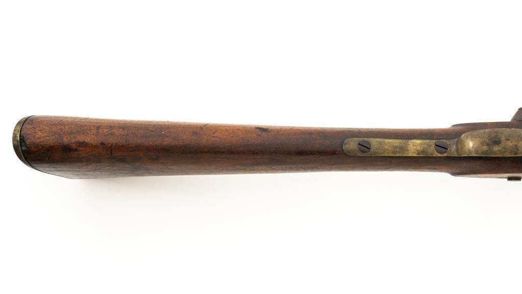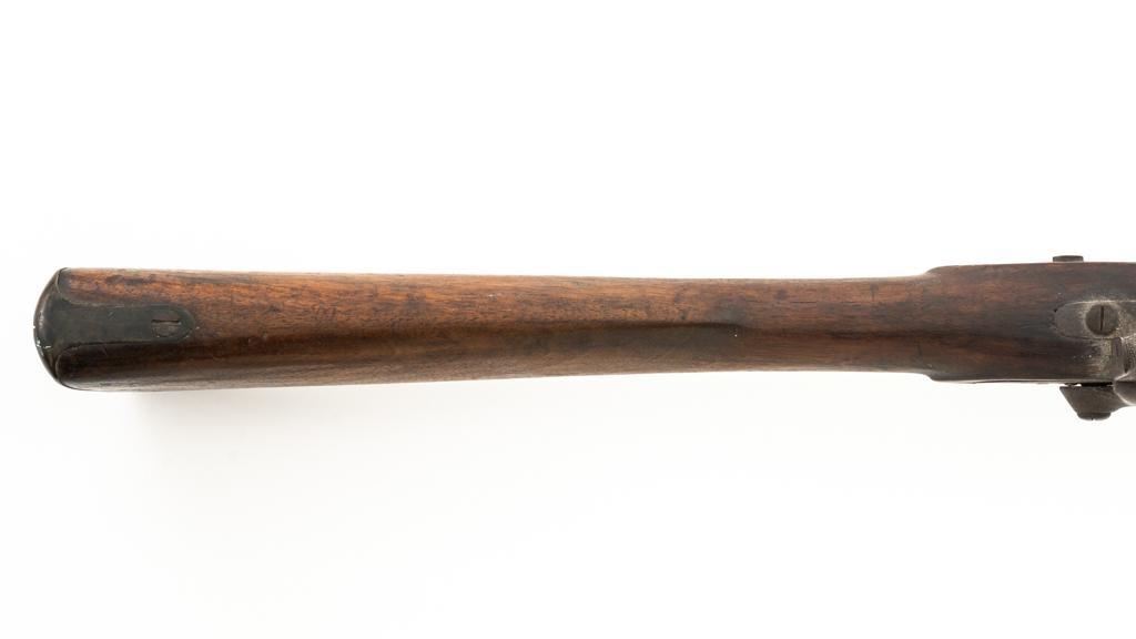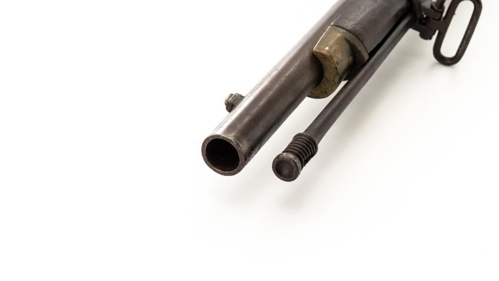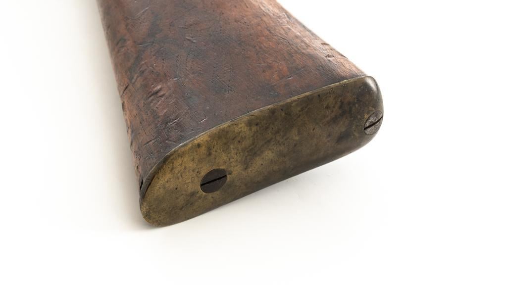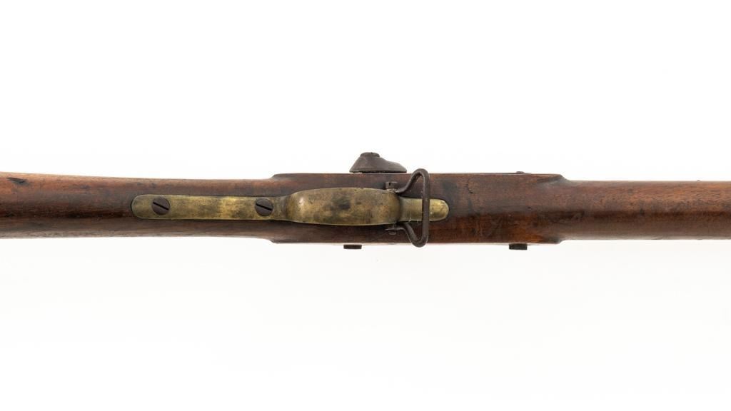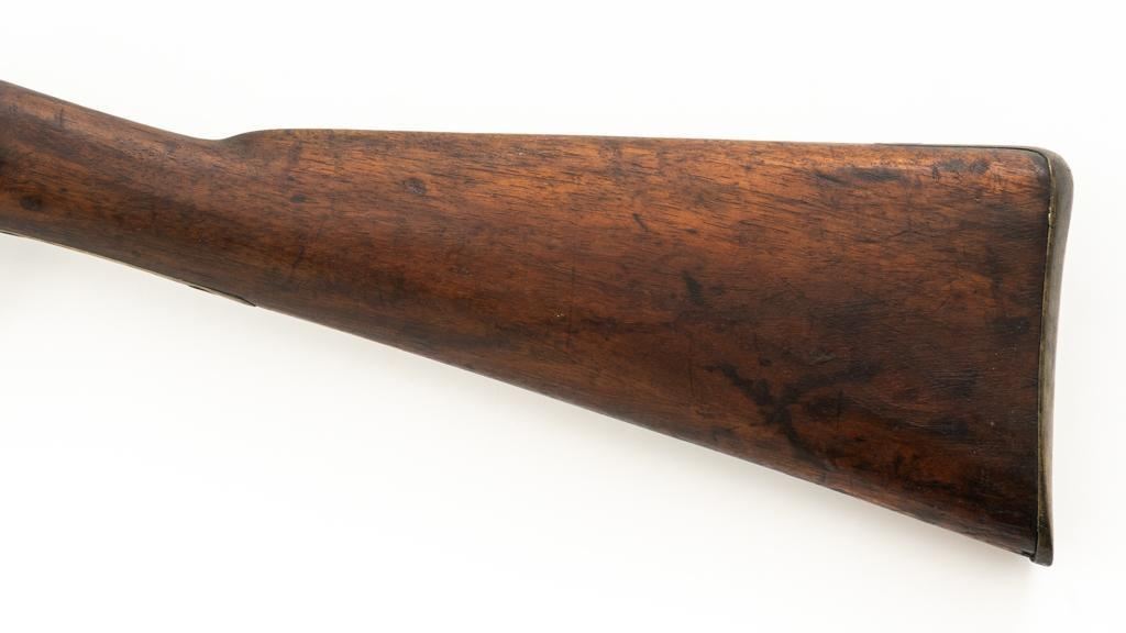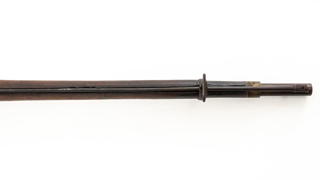 British Tower 2-Band Percussion Muzzle Loading Rifled Musket, #NVSN, .577 cal., 34'' barrel, browned finish, walnut stock, blade front sight, and adjustable folding leaf rear sight with wide ''V''-notch, graduated to 900 yards. Includes the iron rammer. Lockplate has two-line engraving and is marked ''(Crown)'' and ''1863/TOWER''. There proof, view, and ''25'' stamped on left side of the barrel. Right side of the buttstock with ''(Crown)BSAT/BIRMINGHAM SMALL ARMS''. Condition overall is good, musket has not been cleaned, and the iron parts show a dark brown patina, with old pitting to the barrel adjacent the lock. There is a round guard below the nipple and the outside edge has been flattened. Brass trigger guard and forend cap have darkened with age. Stock is in good condition, with expected marks from use, general darkening, and an old 1'' crack behind the lockplate. A section of wood appears to be missing from the right side of the barrel tang. Action operates smoothly; hammer holds in half and full cock position. Bore rates fair with moderate surface rust, rifling is visible. Est.: $600-$800. (Antique)