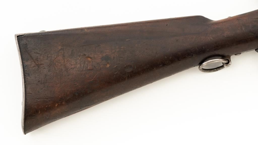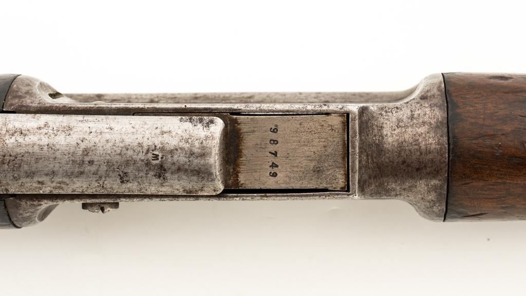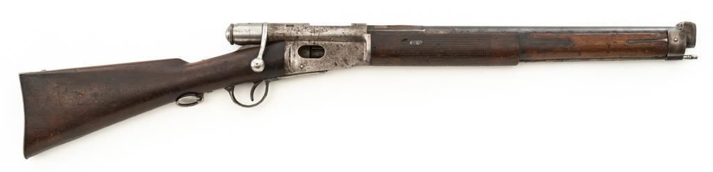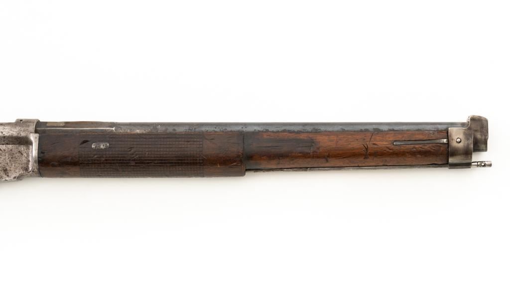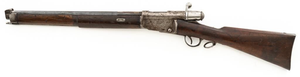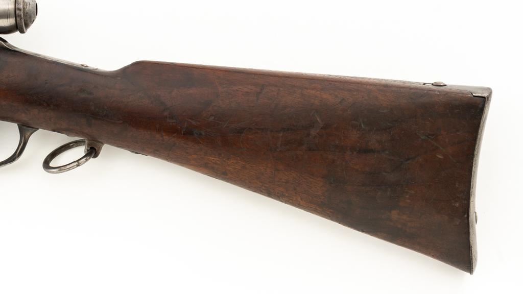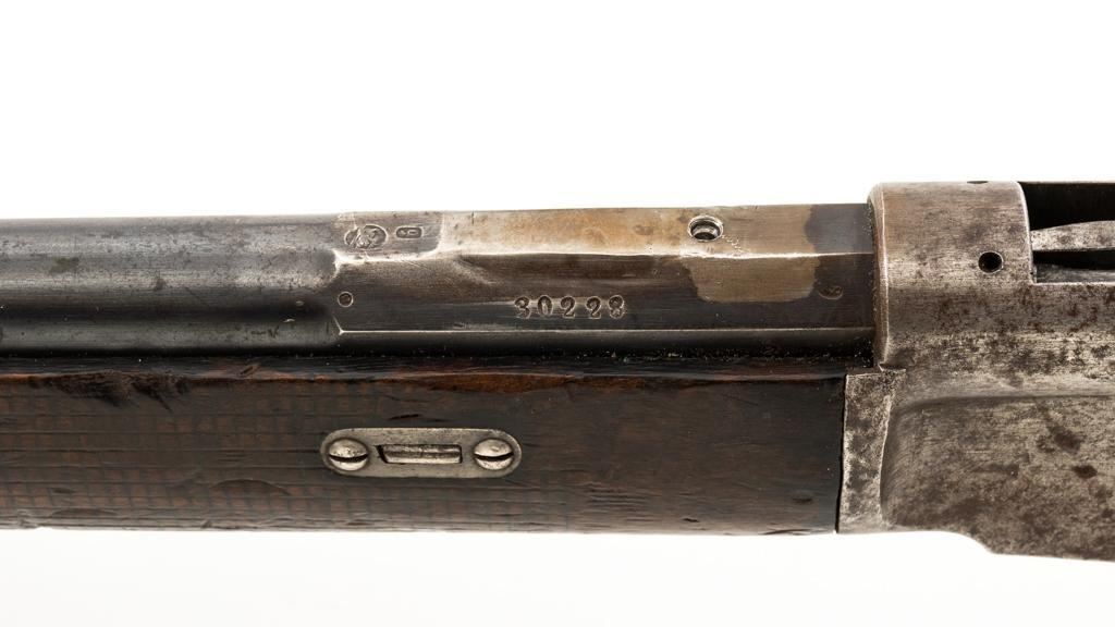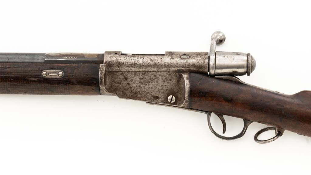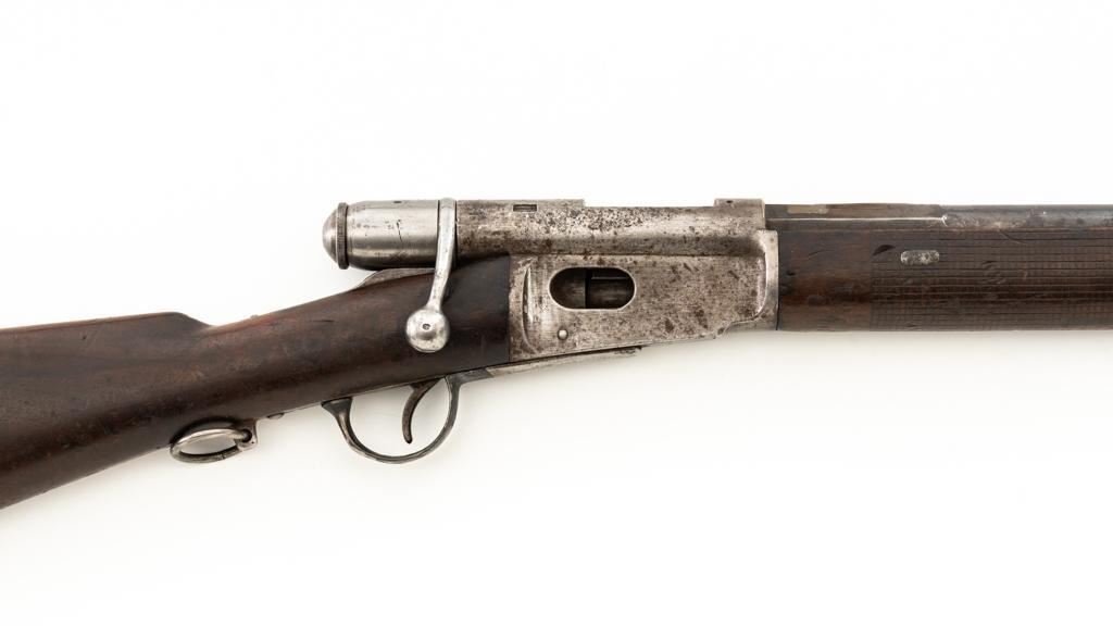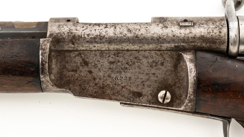 Modified Antique Swiss Model 1869/71 Vetterli Bolt Action Rifle, #30228, .41 Swiss Rimfire cal., barrel has been shortened to 18.25'', with blued finish, straight grip hardwood stock, checkered forend, and inverted-''V'' front sight with protectors. Rear sight has been removed. Includes a modified steel cleaning rod and a sling ring has been welded onto the trigger guard tang. Left side of the receiver is marked ''W.V.STEIGER/THUN'' and there is a Swiss cross stamped into the right side buttstock. Matching numbers on the barrel and receiver, other numbered parts do not match. Rifle was modified by cutting back the forend, shortening the barrel, and attaching a newly fabricated forend cap. Condition overall is fair as modified. Barrel retains much of its toning blue finish, showing wear and polishing where the rear sight dovetail was filled in. Receiver with several small spots of darkening and light pitting. There are dents visible on left side of the bolt cover. Wood with overall dents, scratches, and darkening. The old band spring and rear sling swivel recesses have been filled in. There is a backwards ''S'' carved into left side of the forend. Action functions well. Bore is bright with good rifling. Est.: $200-$400. (Antique)