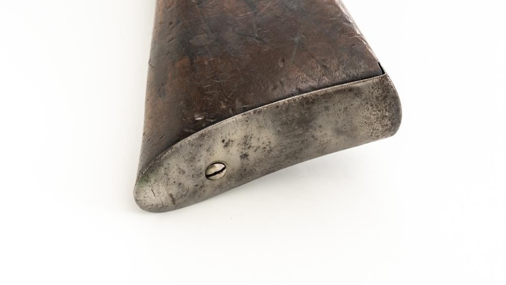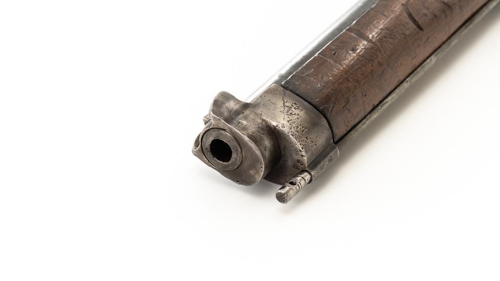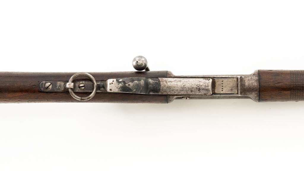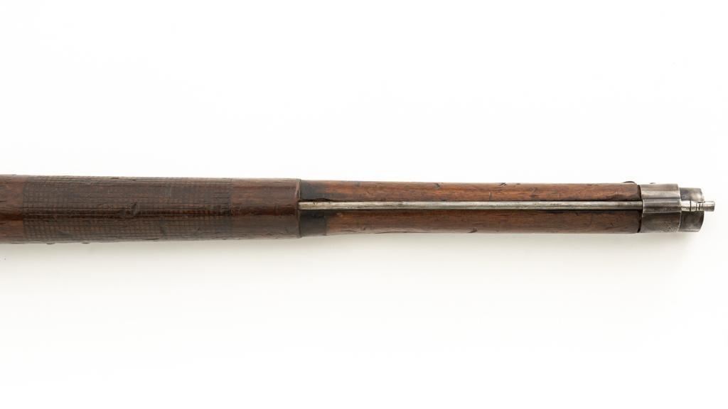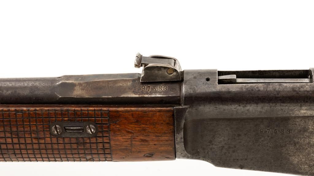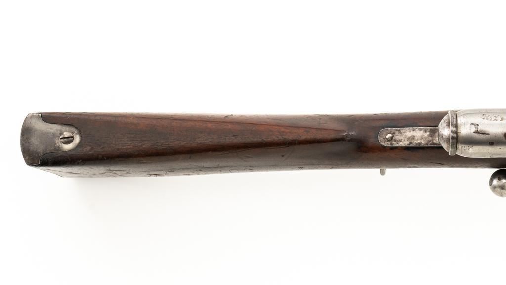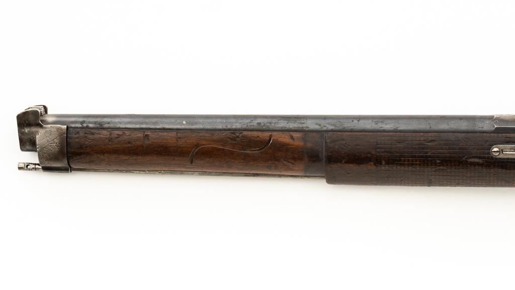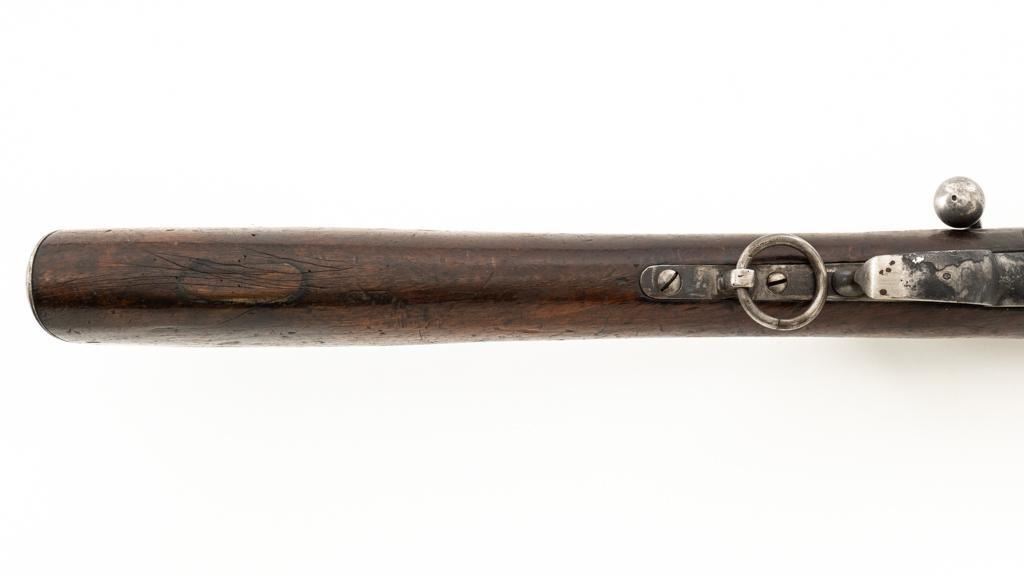Modified Antique Swiss Model 1869/71 Vetterli Bolt Action Rifle, #30228, .41 Swiss Rimfire cal., barrel has been shortened to 18.25'', with blued finish, straight grip hardwood stock, checkered forend, and inverted-''V'' front sight with protectors. Rear sight has been removed. Includes a modified steel cleaning rod and a sling ring has been welded onto the trigger guard tang. Left side of the receiver is marked ''W.V.STEIGER/THUN'' and there is a Swiss cross stamped into the right side buttstock. Matching numbers on the barrel and receiver, other numbered parts do not match. Rifle was modified by cutting back the forend, shortening the barrel, and attaching a newly fabricated forend cap. Condition overall is fair as modified. Barrel retains much of its toning blue finish, showing wear and polishing where the rear sight dovetail was filled in. Receiver with several small spots of darkening and light pitting. There are dents visible on left side of the bolt cover. Wood with overall dents, scratches, and darkening. The old band spring and rear sling swivel recesses have been filled in. There is a backwards ''S'' carved into left side of the forend. Action functions well. Bore is bright with good rifling. Est.: $200-$400. (Antique)