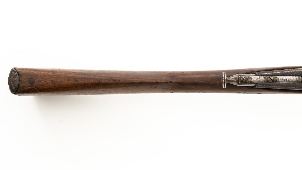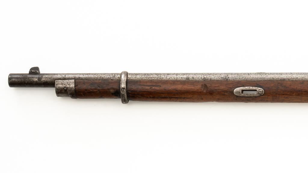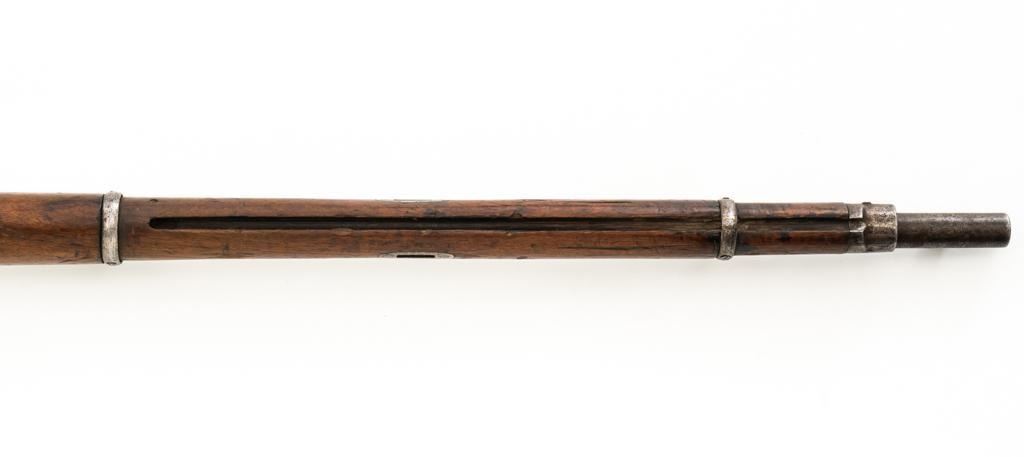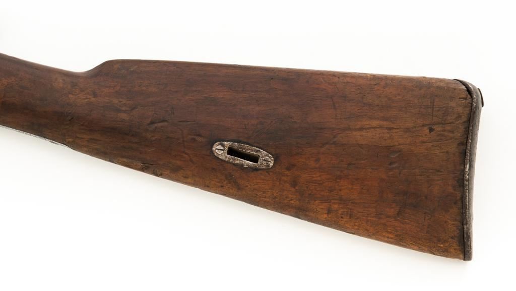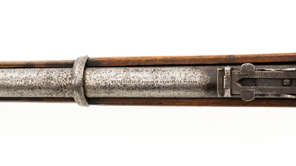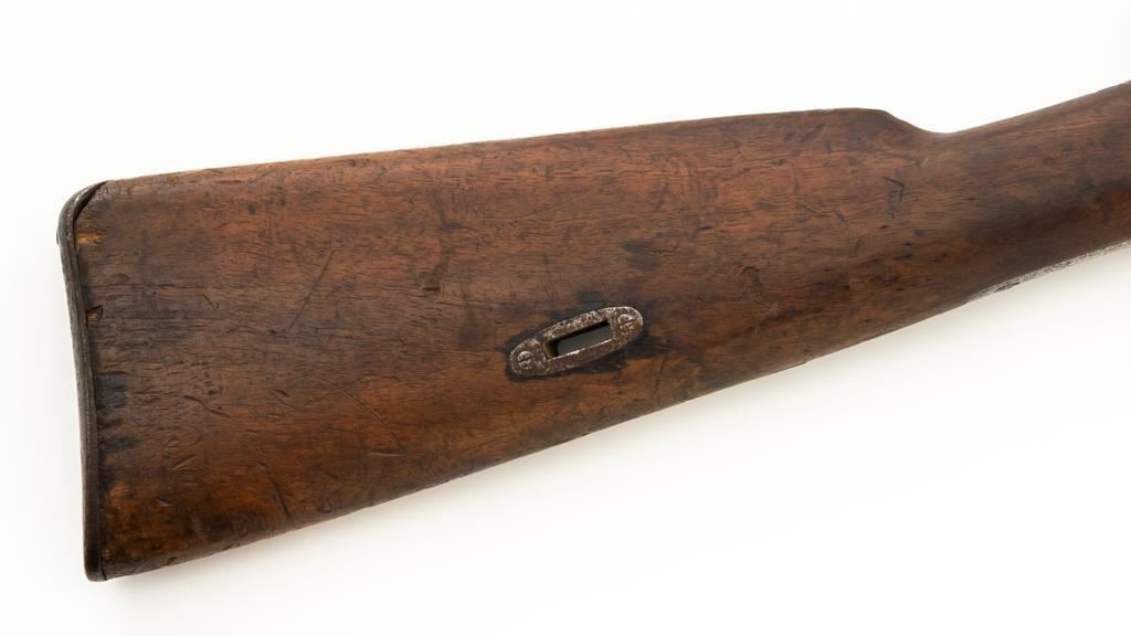 Russian M1870 Berdan II Single Shot Bolt Action Rifle, #73834, 10.75x58Rmm cal., 25.3'' barrel, bright metal, hardwood stock, inverted-''V'' front sight, and adjustable folding leaf rear sight with ''V''-notch, graduated to 800 arshins. Includes steel cleaning rod. Top of barrel is marked in Cyrillic ''HMNEPATOPCKIH TYNICKIH OPYXCHHIIH ???OAB''. There are no visible markings on the stock. Condition overall is fair, metal has been cleaned, now showing spots of old rust patina, and general light pitting, especially on the barrel. There are old impact marks to the right side of the rear sight. Wood is fair with numerous bruises, small chips, and scratches. There are no barrel band retaining springs on the forend and the buttplate fits loosely. Action functions well. Bore rates good, with a few spots of patina, and defined rifling. Est.: $500-$750. (Antique)