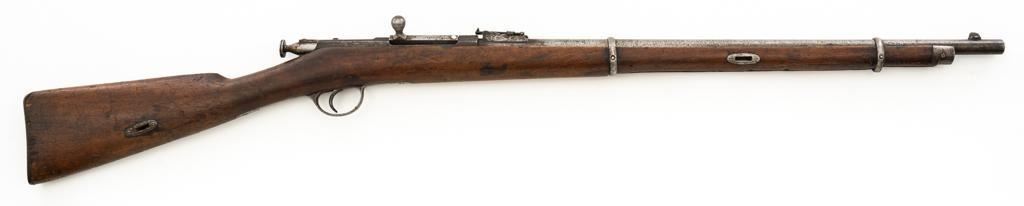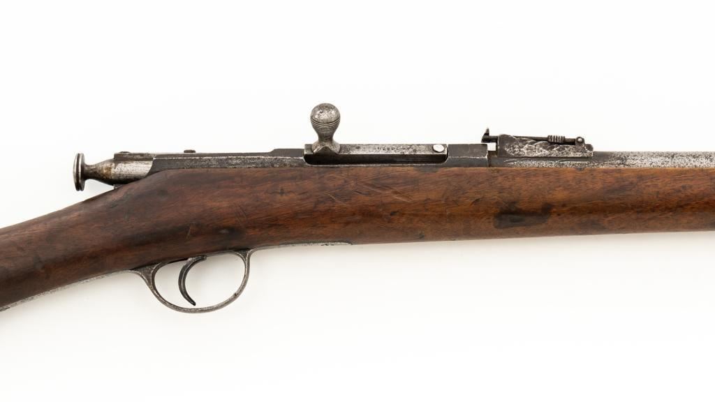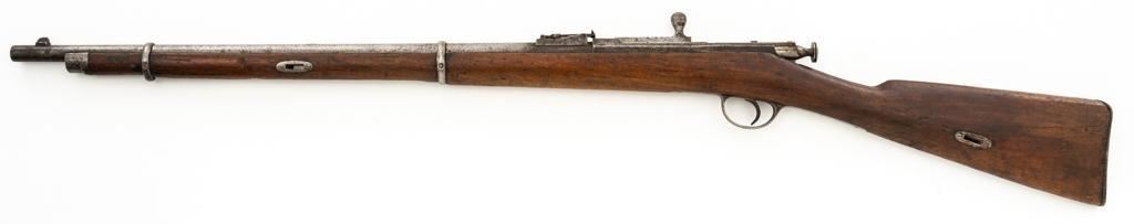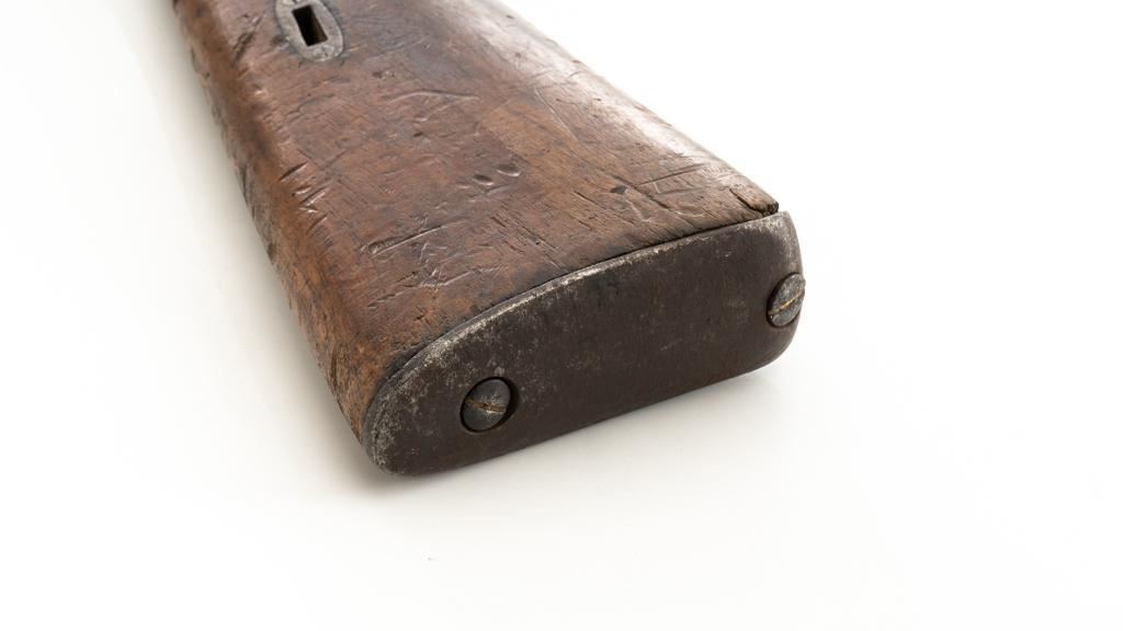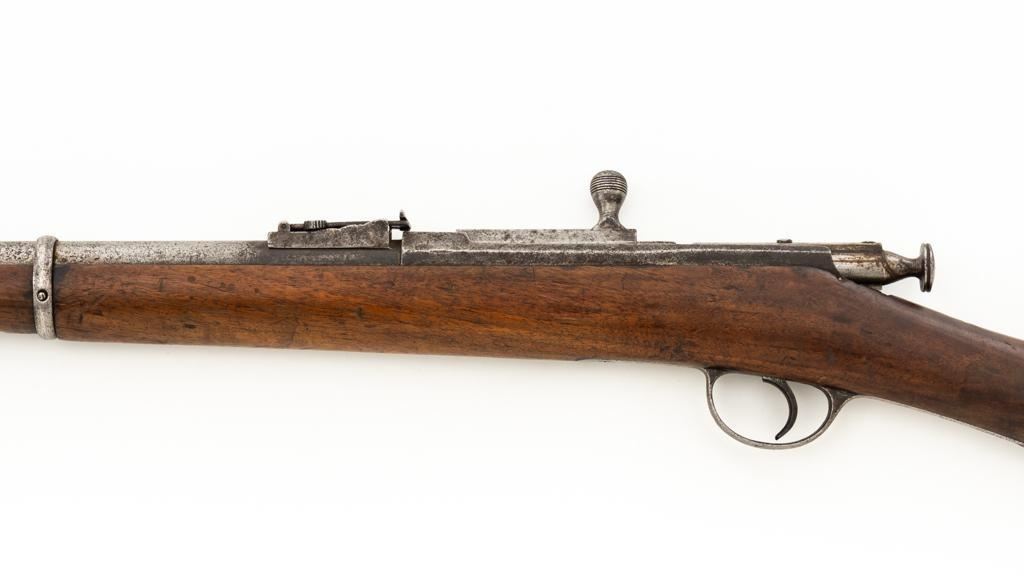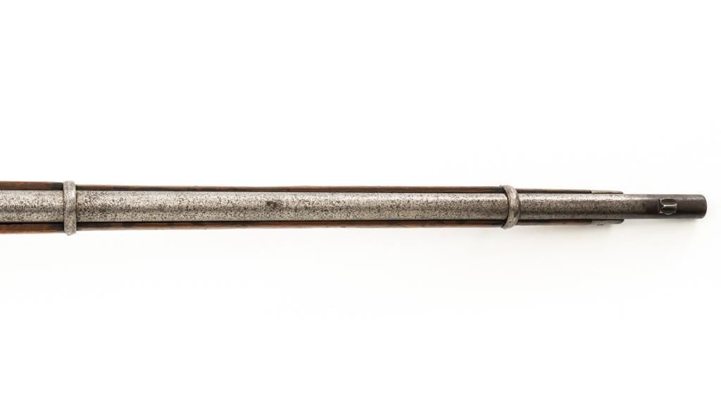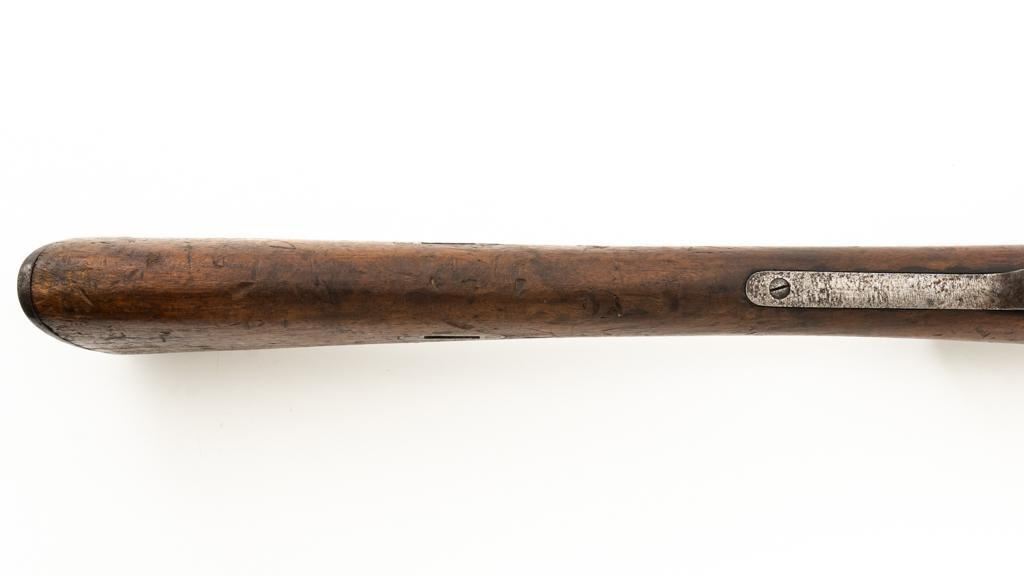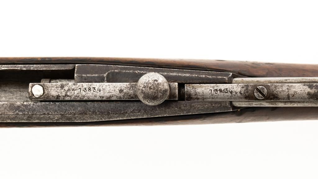 Russian M1870 Berdan II Single Shot Bolt Action Rifle, #73834, 10.75x58Rmm cal., 25.3'' barrel, bright metal, hardwood stock, inverted-''V'' front sight, and adjustable folding leaf rear sight with ''V''-notch, graduated to 800 arshins. Includes steel cleaning rod. Top of barrel is marked in Cyrillic ''HMNEPATOPCKIH TYNICKIH OPYXCHHIIH ???OAB''. There are no visible markings on the stock. Condition overall is fair, metal has been cleaned, now showing spots of old rust patina, and general light pitting, especially on the barrel. There are old impact marks to the right side of the rear sight. Wood is fair with numerous bruises, small chips, and scratches. There are no barrel band retaining springs on the forend and the buttplate fits loosely. Action functions well. Bore rates good, with a few spots of patina, and defined rifling. Est.: $500-$750. (Antique)