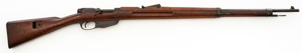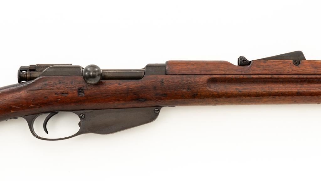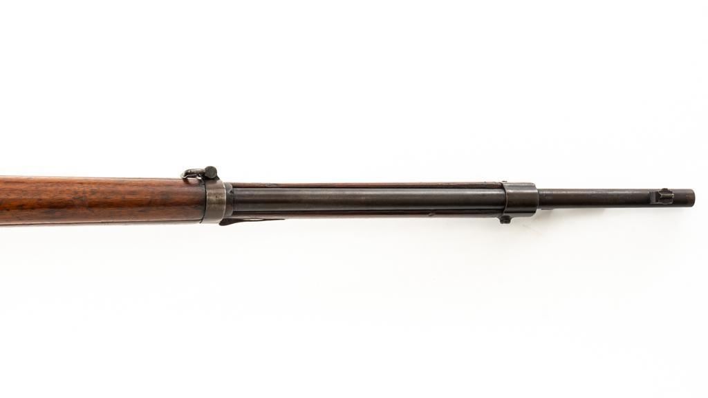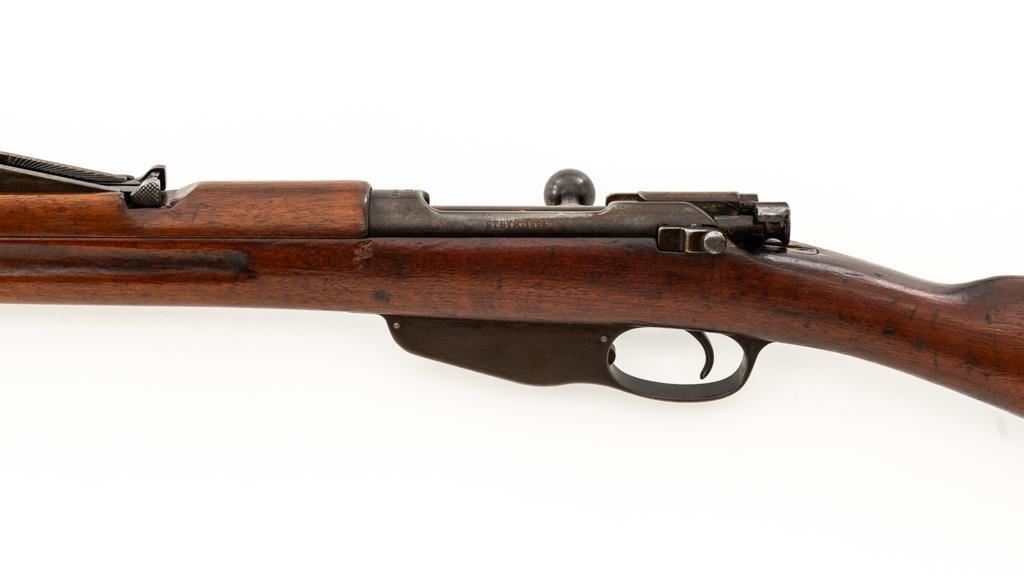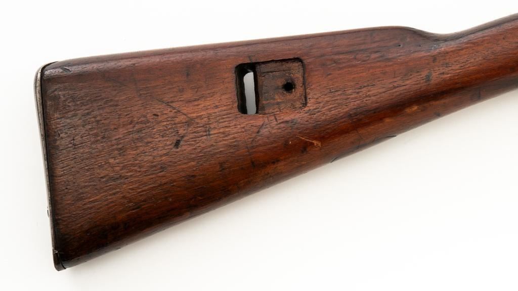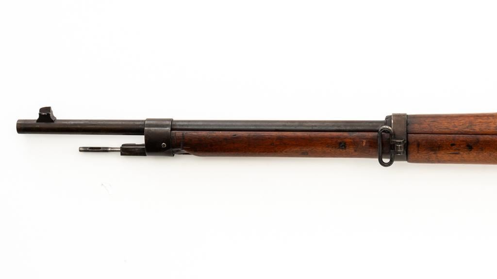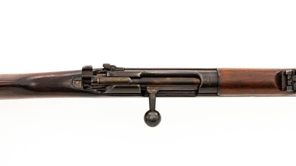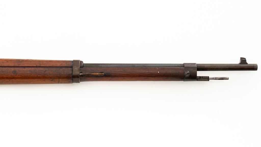 Antique Dutch M95 Mannlicher Bolt Action Rifle, #394A, 6.5x53mm cal., 31.5'' barrel, blued finish, hardwood stock and handguard, dovetailed inverted-''V'' front sight, and adjustable rear sight with ''V''- notch, graduated to 2000 meters. Includes steel cleaning rod. Left side of the receiver rail is marked ''STEYR 1896'' and the top of the receiver ring ''394A/LW''. There is a faint Dutch cartouche on right side of the buttstock, and circled ''LD'' stamp on the left side. Bolt does not match; other visible numbers are matching. Condition overall is good, retaining approx. 30% blue, showing thinning, and toning throughout, with areas of old dried oil. Rear sling mount has been removed and the slot filled. Wood is good, there is a 1/2'' x 1'' piece missing from the left side tip of the forend. Stock and handguard have had a coat of varnish applied, now showing scratches and impressions, mainly to the right side. Action functions well. Bore is dark with fair rifling and may improve with thorough cleaning. Est.: $200-$300. (Antique)