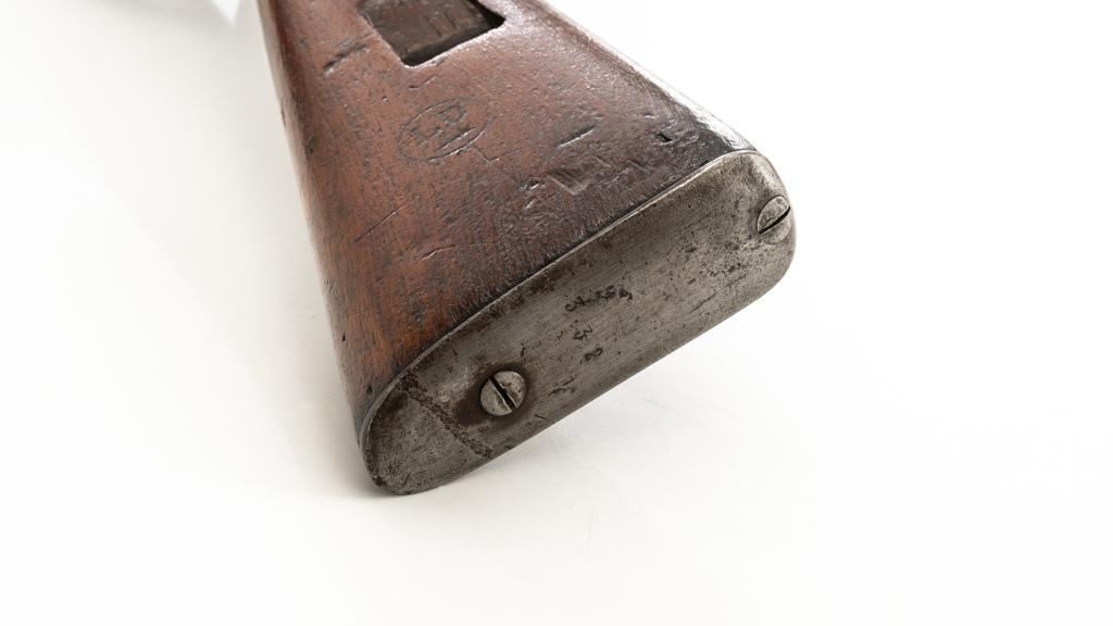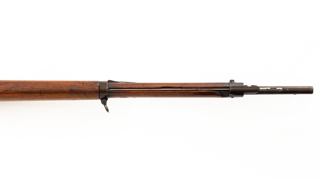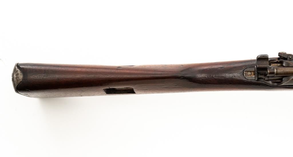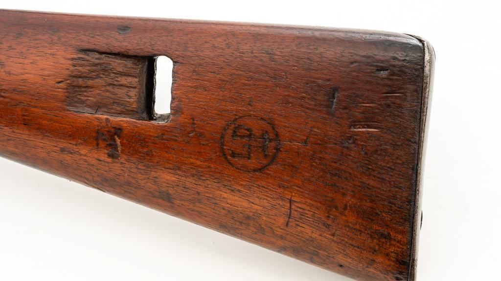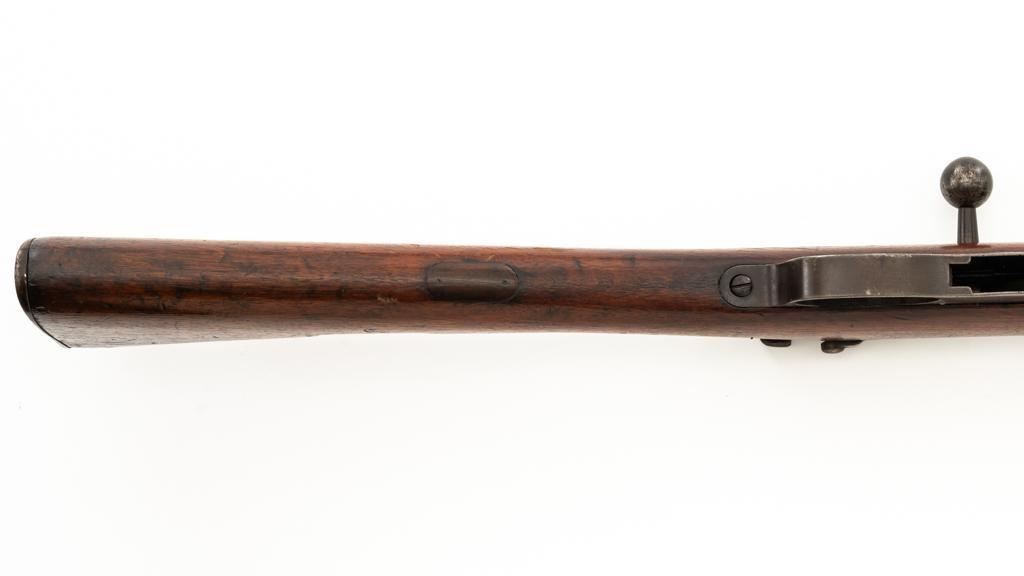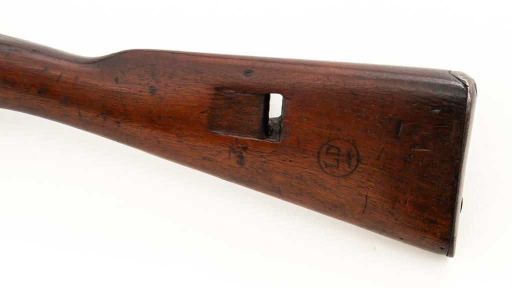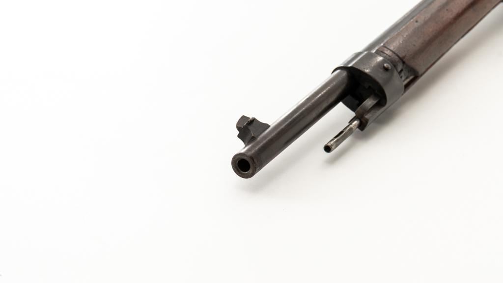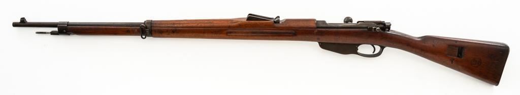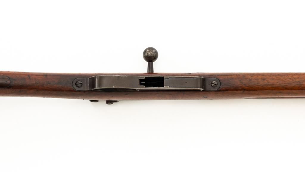 Antique Dutch M95 Mannlicher Bolt Action Rifle, #394A, 6.5x53mm cal., 31.5'' barrel, blued finish, hardwood stock and handguard, dovetailed inverted-''V'' front sight, and adjustable rear sight with ''V''- notch, graduated to 2000 meters. Includes steel cleaning rod. Left side of the receiver rail is marked ''STEYR 1896'' and the top of the receiver ring ''394A/LW''. There is a faint Dutch cartouche on right side of the buttstock, and circled ''LD'' stamp on the left side. Bolt does not match; other visible numbers are matching. Condition overall is good, retaining approx. 30% blue, showing thinning, and toning throughout, with areas of old dried oil. Rear sling mount has been removed and the slot filled. Wood is good, there is a 1/2'' x 1'' piece missing from the left side tip of the forend. Stock and handguard have had a coat of varnish applied, now showing scratches and impressions, mainly to the right side. Action functions well. Bore is dark with fair rifling and may improve with thorough cleaning. Est.: $200-$300. (Antique)