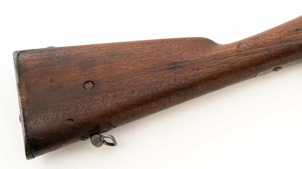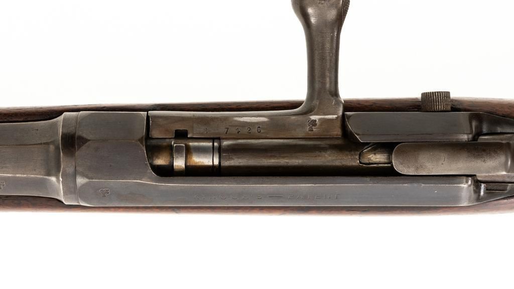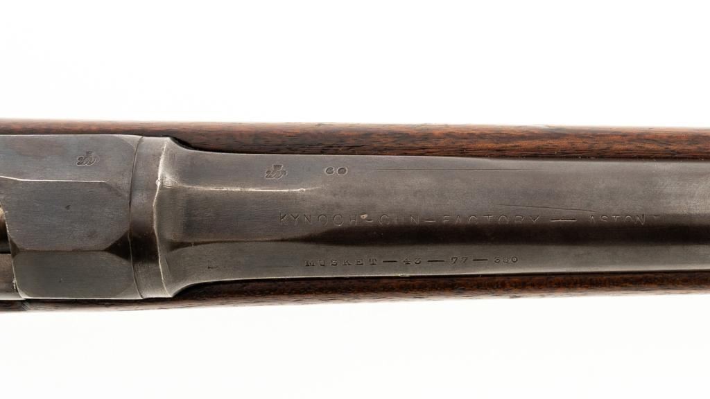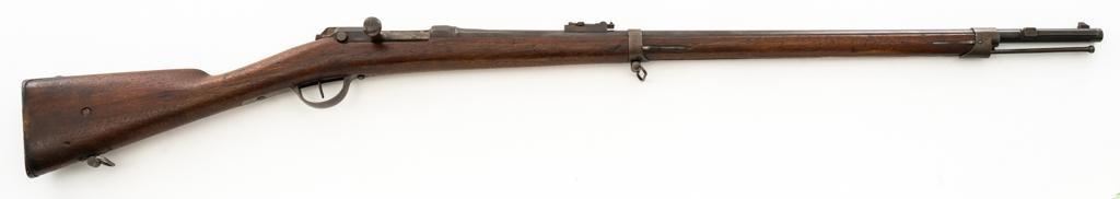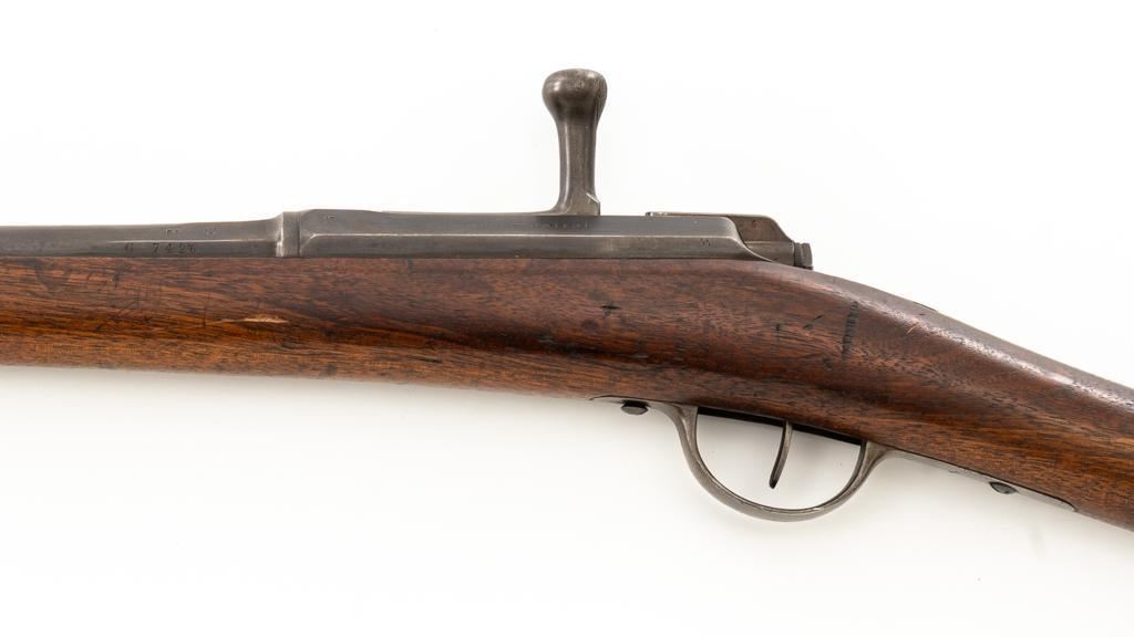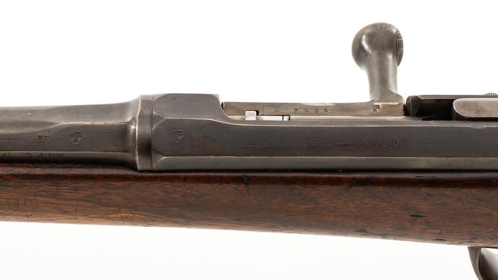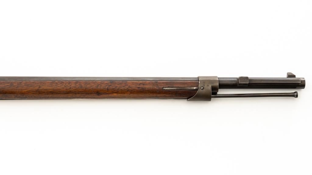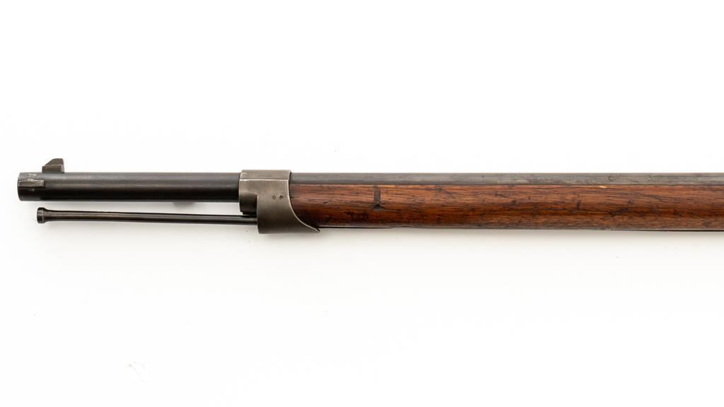 Kynoch Model 1873 Chassepot Single Shot Bolt Action Rifle, #G7426, 11x59Rmm cal., 32.25'' barrel, blued finish, walnut stock, inverted-''V'' front sight, and adjustable folding leaf rear sight with ''V''-notch, graduated to 1000 meters. Includes steel rammer. Rifle was converted in England by Kynoch to fire the 11mm Gras cartridge and is marked ''KYNOCH-GUN-FACTORY-ASTON'' and ''MUSKET-43-77-380'' on the barrel; ''KYNOCH'S-PATENT'' on left side of the receiver. There are French proof stamps on left side of the receiver and barrel. Water plug has been removed from right side of the buttstock. Matching numbers on bolt body and bayonet mount. Buttplate with ''37'' stamped above the screw. Both ''56'' and a smaller ''23'' are stamped on the bayonet lug. Condition overall is very good, retaining approx. 70% thinning and toning reblued finish, with brown patina to the buttplate. Wood with added finish, now in very good condition. There are scratches, handling marks, and some areas of darkening scattered throughout. Action operates smoothly. Bore rates very good with defined rifling. Est.: $600-$900. (Antique)