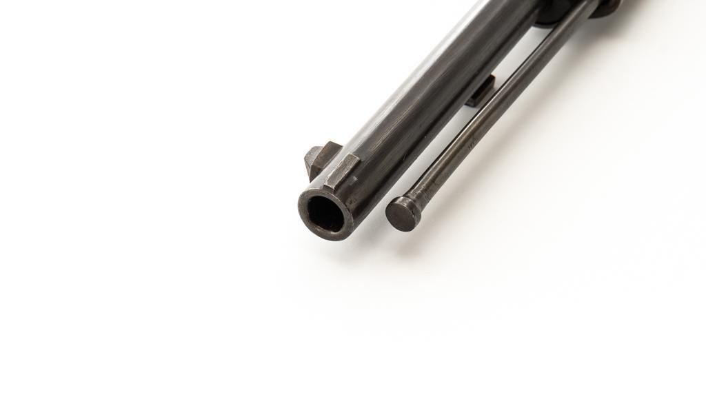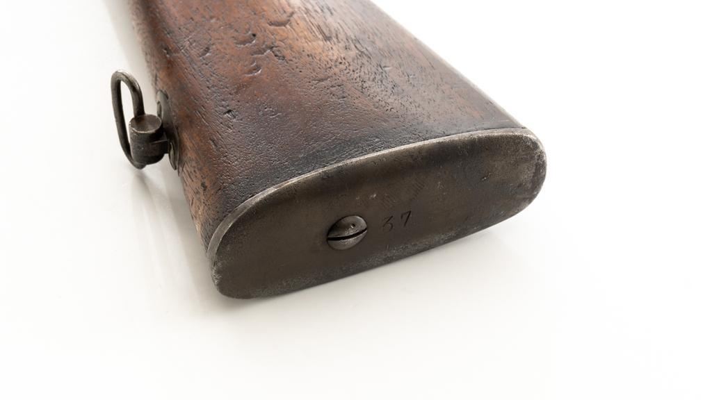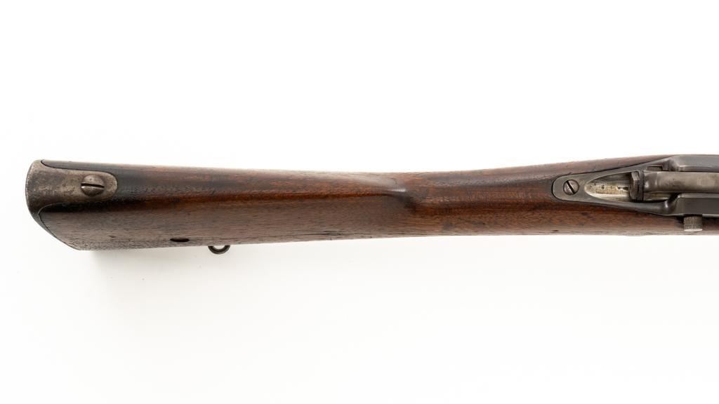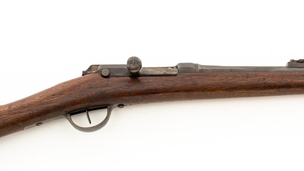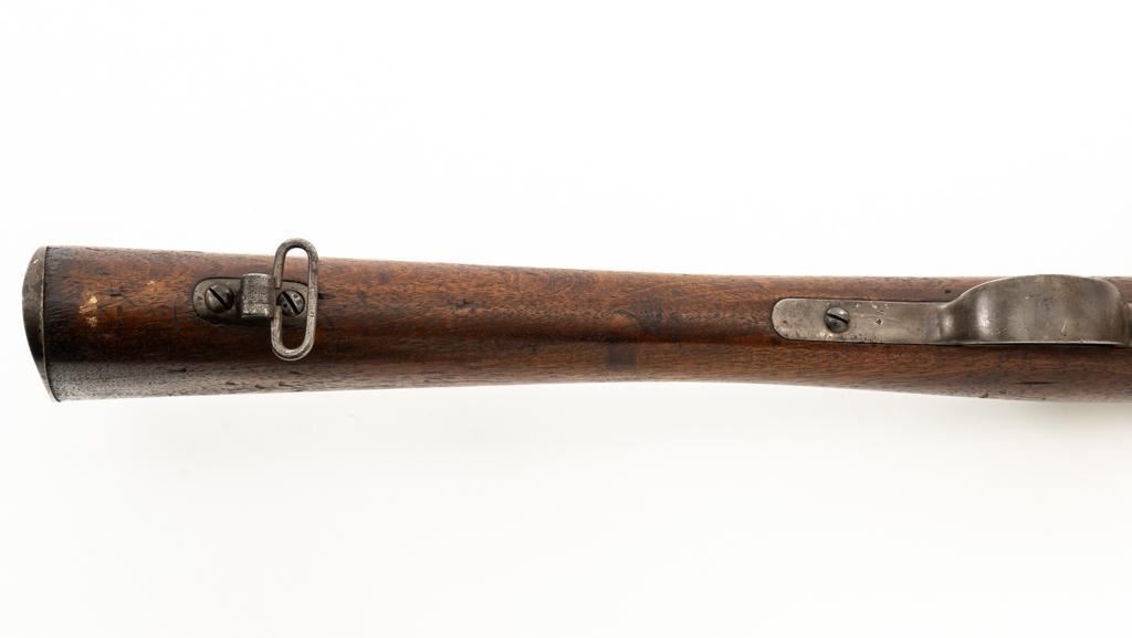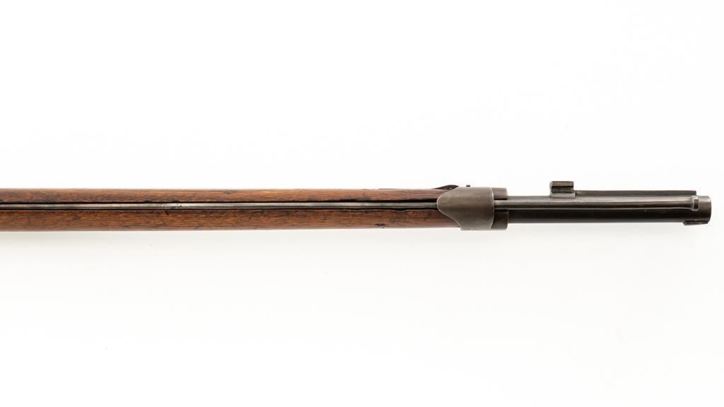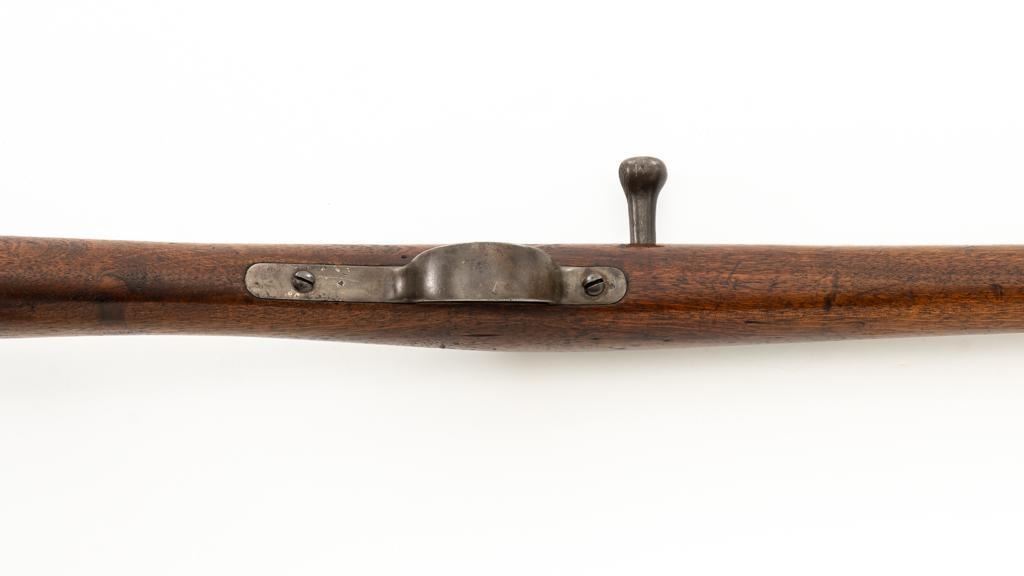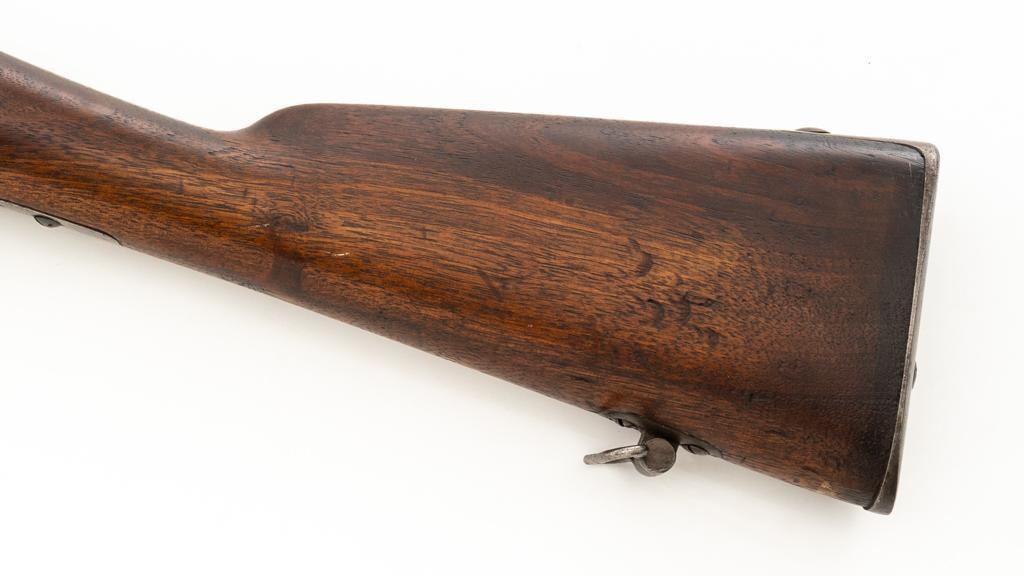 Kynoch Model 1873 Chassepot Single Shot Bolt Action Rifle, #G7426, 11x59Rmm cal., 32.25'' barrel, blued finish, walnut stock, inverted-''V'' front sight, and adjustable folding leaf rear sight with ''V''-notch, graduated to 1000 meters. Includes steel rammer. Rifle was converted in England by Kynoch to fire the 11mm Gras cartridge and is marked ''KYNOCH-GUN-FACTORY-ASTON'' and ''MUSKET-43-77-380'' on the barrel; ''KYNOCH'S-PATENT'' on left side of the receiver. There are French proof stamps on left side of the receiver and barrel. Water plug has been removed from right side of the buttstock. Matching numbers on bolt body and bayonet mount. Buttplate with ''37'' stamped above the screw. Both ''56'' and a smaller ''23'' are stamped on the bayonet lug. Condition overall is very good, retaining approx. 70% thinning and toning reblued finish, with brown patina to the buttplate. Wood with added finish, now in very good condition. There are scratches, handling marks, and some areas of darkening scattered throughout. Action operates smoothly. Bore rates very good with defined rifling. Est.: $600-$900. (Antique)