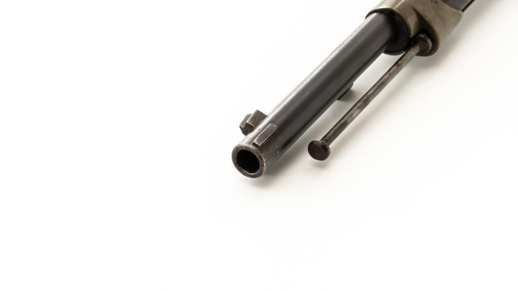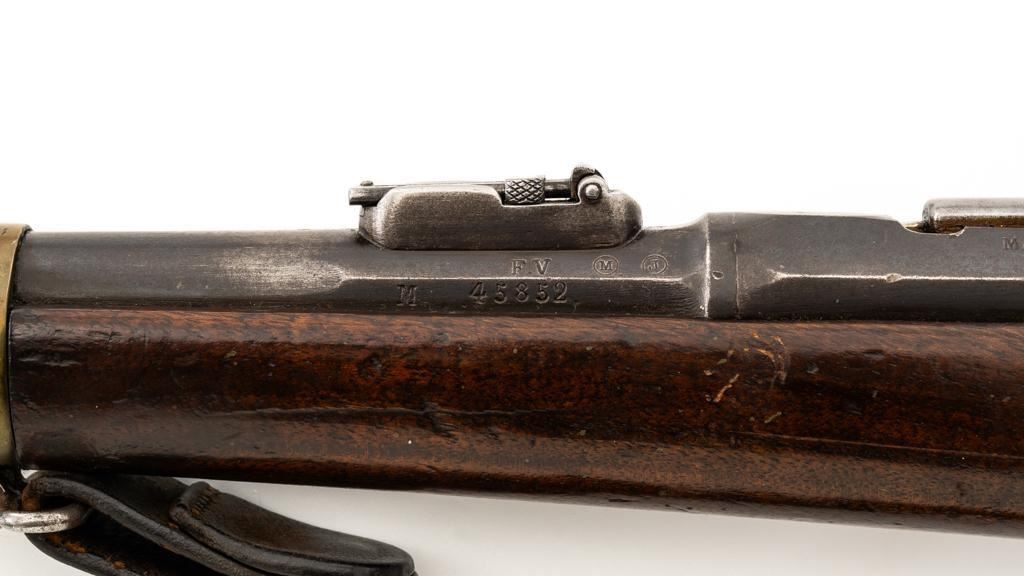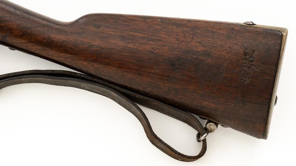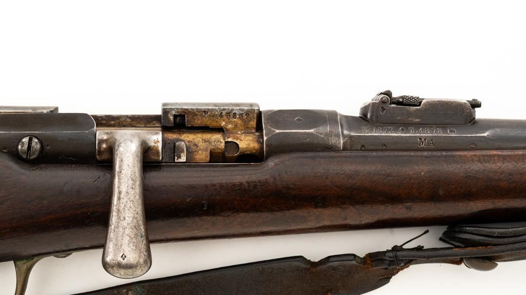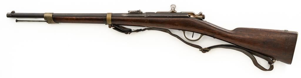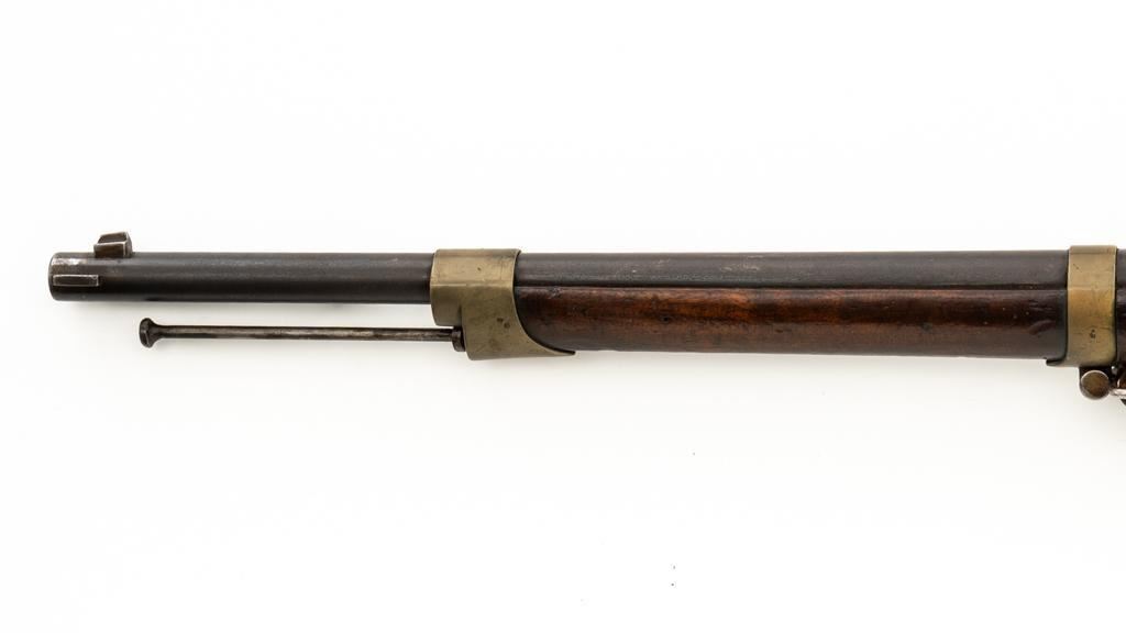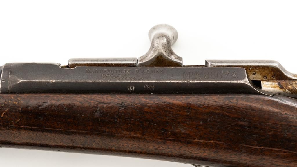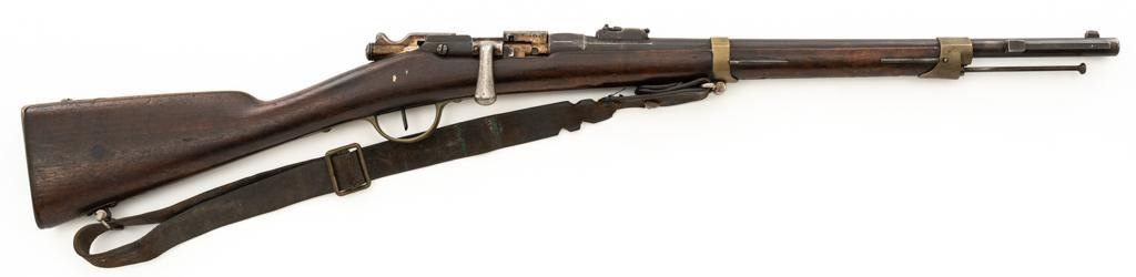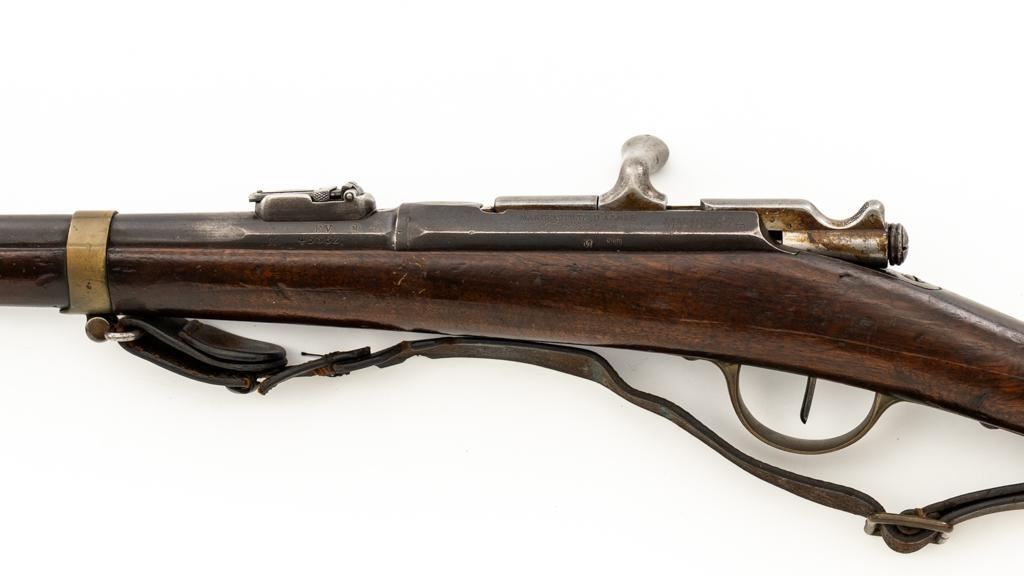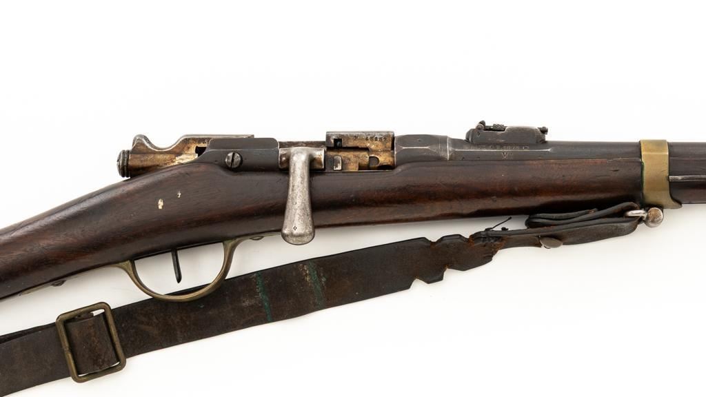 Antique French Gras MLE 1866-74 Single Shot Bolt Action Rifle, #M45852, 11x59Rmm cal., 20'' barrel, blued finish; brass trigger guard, barrel bands, and buttplate. Hardwood stock. Inverted-''V'' front sight and adjustable folding leaf rear sight with square notch, graduated to 1100 meters. Includes a steel ramrod that has been repaired. Rifle is of approximate size as issued to French artillery units. Left side of the receiver is marked ''MANUFACTURE D'ARMES/St Entienne/MLE 1866-74''. Right side of the barrel shank is dated ''S.1873'' and ''T.1878.''. There is a faint, partially visible cartouche on left side of the buttstock. Condition overall is good, retaining approx. 80% thinning and toning blue. Brass parts have lightly toned with age. Wood is good with a more noticeable scratch to left side of the forend and right side of the buttstock. Additionally, there is a 1.5'' crack to left side of the buttstock, adjacent the buttplate. Action operates smoothly. Bore is dark with visible pitting and fair rifling. Est.: $300-$500. (Antique