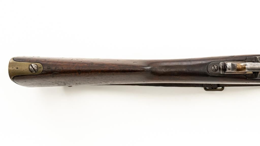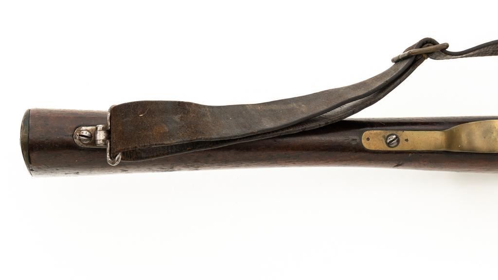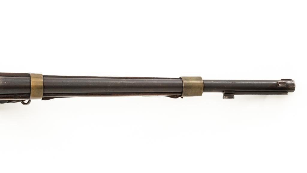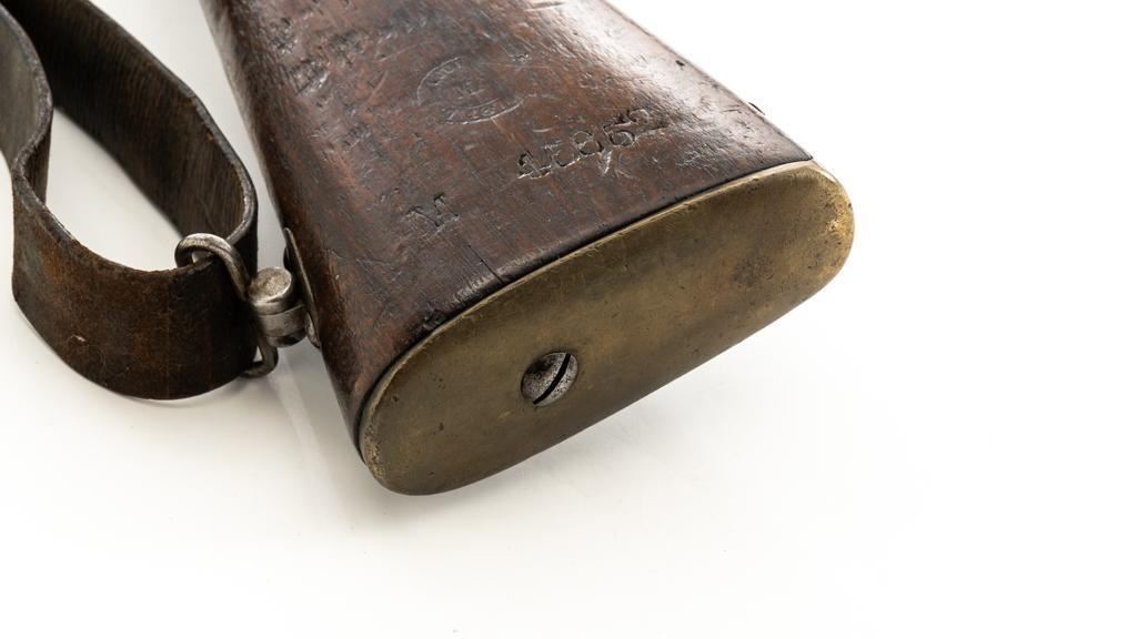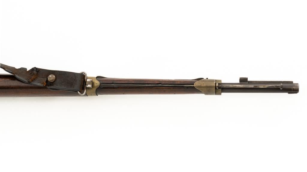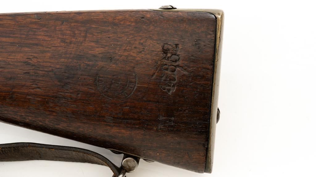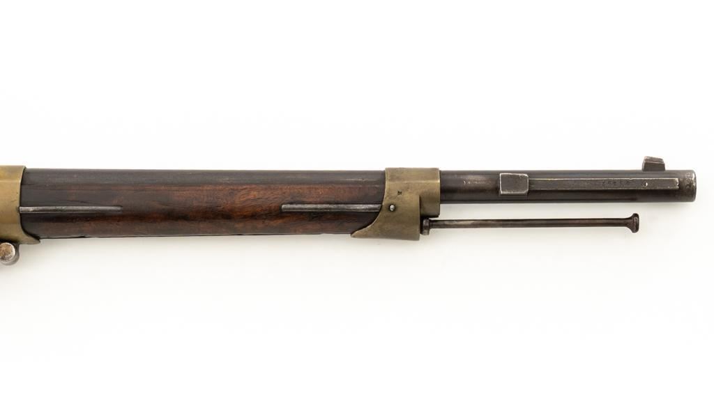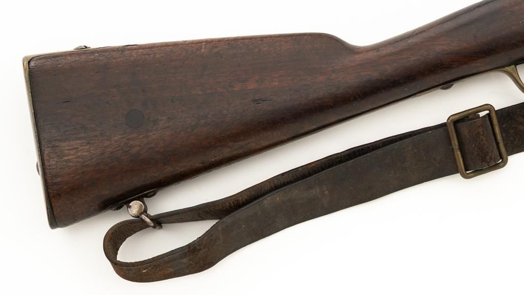 Antique French Gras MLE 1866-74 Single Shot Bolt Action Rifle, #M45852, 11x59Rmm cal., 20'' barrel, blued finish; brass trigger guard, barrel bands, and buttplate. Hardwood stock. Inverted-''V'' front sight and adjustable folding leaf rear sight with square notch, graduated to 1100 meters. Includes a steel ramrod that has been repaired. Rifle is of approximate size as issued to French artillery units. Left side of the receiver is marked ''MANUFACTURE D'ARMES/St Entienne/MLE 1866-74''. Right side of the barrel shank is dated ''S.1873'' and ''T.1878.''. There is a faint, partially visible cartouche on left side of the buttstock. Condition overall is good, retaining approx. 80% thinning and toning blue. Brass parts have lightly toned with age. Wood is good with a more noticeable scratch to left side of the forend and right side of the buttstock. Additionally, there is a 1.5'' crack to left side of the buttstock, adjacent the buttplate. Action operates smoothly. Bore is dark with visible pitting and fair rifling. Est.: $300-$500. (Antique