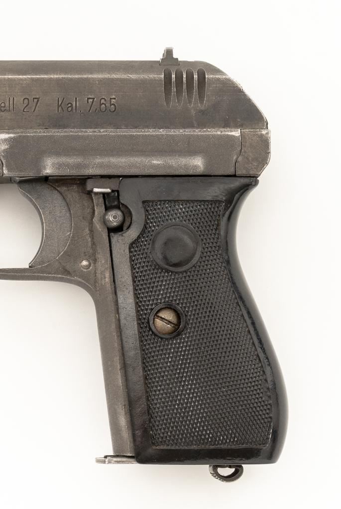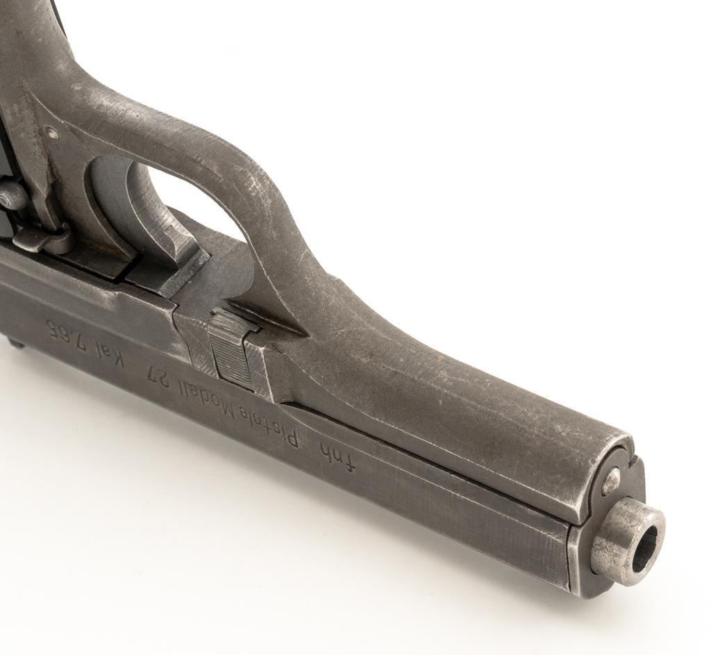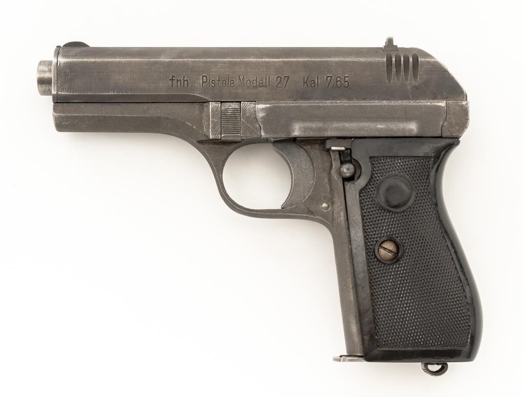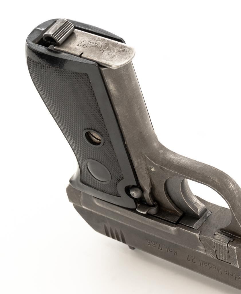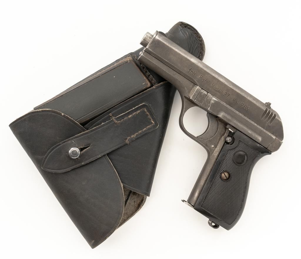 Czech CZ 27 Semi-Automatic Pistol with Holster, #473979, .32 ACP cal., 3.9'' barrel, phosphate finish, checkered black plastic one-piece grip, blade front sight and fixed rear sight with ''V''-notch. Includes one phosphate finished magazine, marked ''P.Mod.27''. Dark green leather holster is unmarked and may be Italian manufacture; in very good condition with light wear to the closure strap. All stitching and fittings are present. Pistol is marked ''fnh Pistole Modell 27 Kal.7,65''on left side of the slide. Matching numbers on frame and slide. No visible import marks. Condition overall is very good, retaining approx. 70% thinning and toning finish, showing general thinning to the slide and frame. Grips shows moderate wear. Slide operates smoothly but the hammer will not release and remains in the rear position. Magazine is in good condition, with wear and patina to the floorplate. Est.: $400-$700. (C&R/PPT)