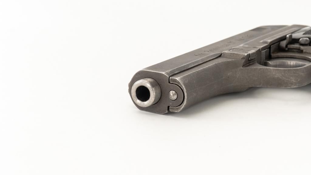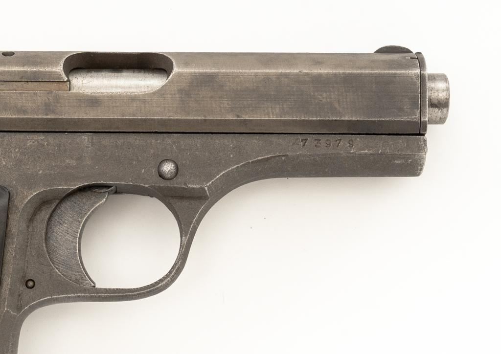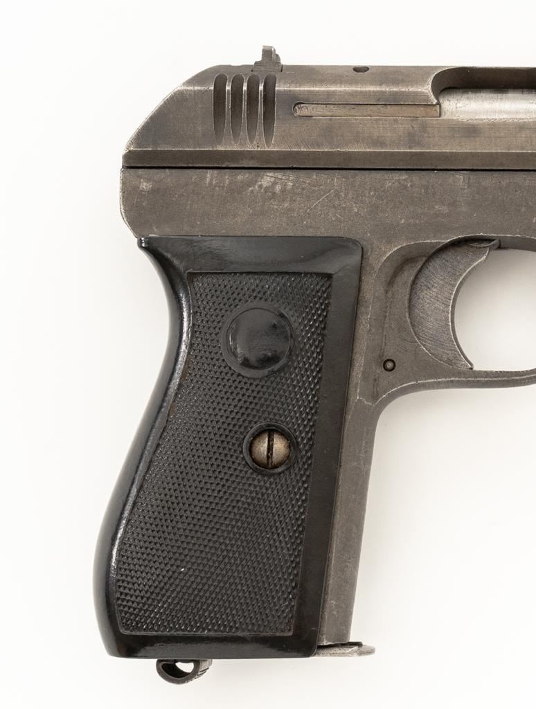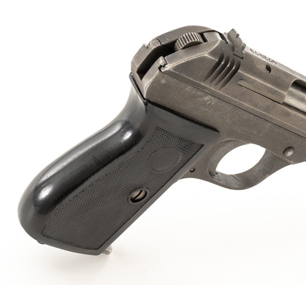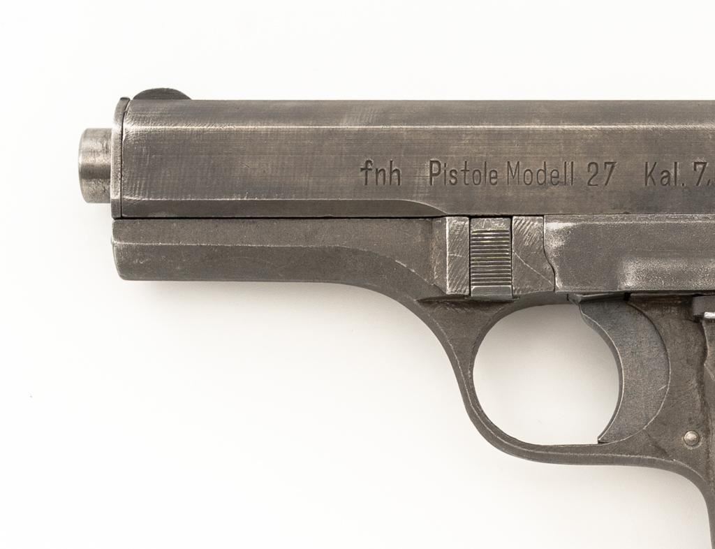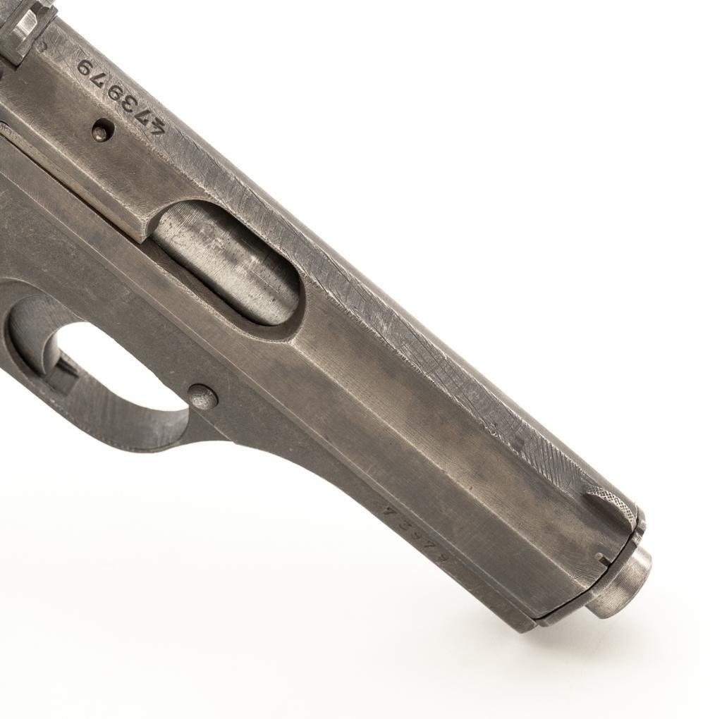 Czech CZ 27 Semi-Automatic Pistol with Holster, #473979, .32 ACP cal., 3.9'' barrel, phosphate finish, checkered black plastic one-piece grip, blade front sight and fixed rear sight with ''V''-notch. Includes one phosphate finished magazine, marked ''P.Mod.27''. Dark green leather holster is unmarked and may be Italian manufacture; in very good condition with light wear to the closure strap. All stitching and fittings are present. Pistol is marked ''fnh Pistole Modell 27 Kal.7,65''on left side of the slide. Matching numbers on frame and slide. No visible import marks. Condition overall is very good, retaining approx. 70% thinning and toning finish, showing general thinning to the slide and frame. Grips shows moderate wear. Slide operates smoothly but the hammer will not release and remains in the rear position. Magazine is in good condition, with wear and patina to the floorplate. Est.: $400-$700. (C&R/PPT)