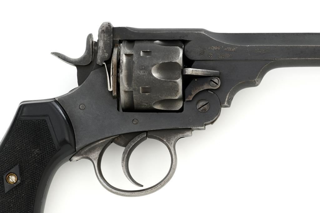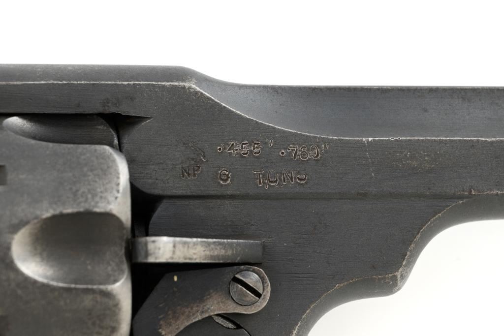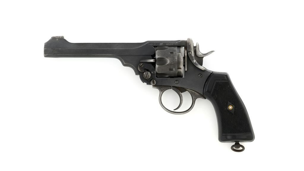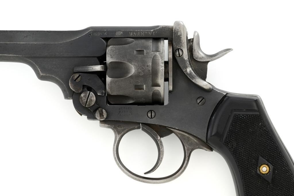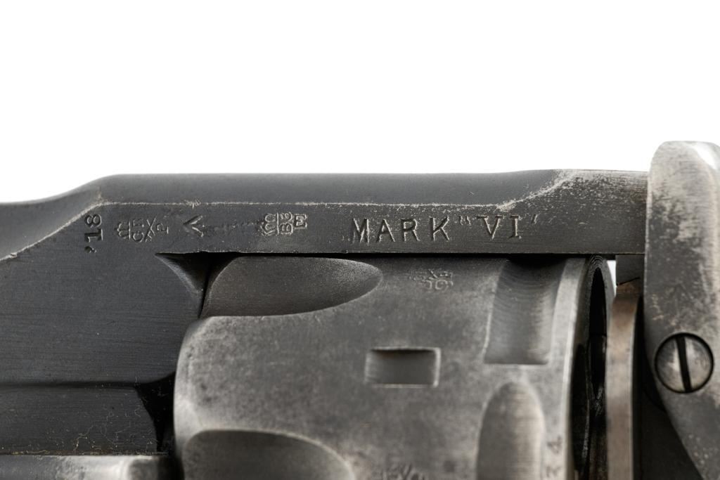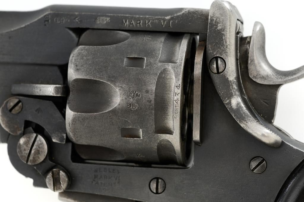 British Webley Mark VI Double Action Revolver, #391434, .45 ACP cal., 6'' flat sided barrel, blued finish, checkered black plastic grips, pinned blade front sight, fixed rear sight with ''U''-notch, and swiveling lanyard ring. Pistol has been importer converted to .45 ACP cal., by machining off the rear of the cylinder. Left side of the frame is marked ''WEBLEY/MARK VI/PATENTS/1918''. Left side of the barrel strap is stamped with an ''18''(in service)/(Broad Arrow) property/(Enfield Arsenal) inspector's mark/MARK VI''. Matching numbers. London export proof stamps on right side barrel. Condition overall is very good, retaining approx. 85% toning blue, with wear to the trigger and trigger guard. The hammer and stirrup latch have been cleaned and the top of the front sight has been filed lower. Grips are in excellent condition and look like recent reproductions. Action locks up, cycles, and ejects smoothly. Bore rates fair, with a small bulge to the left and right side, showing darkening, and good rifling. Est.: $400-$600. (C&R/PPT)