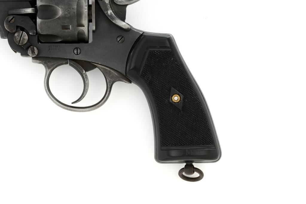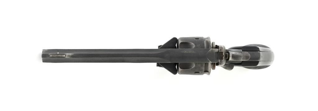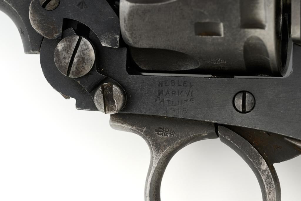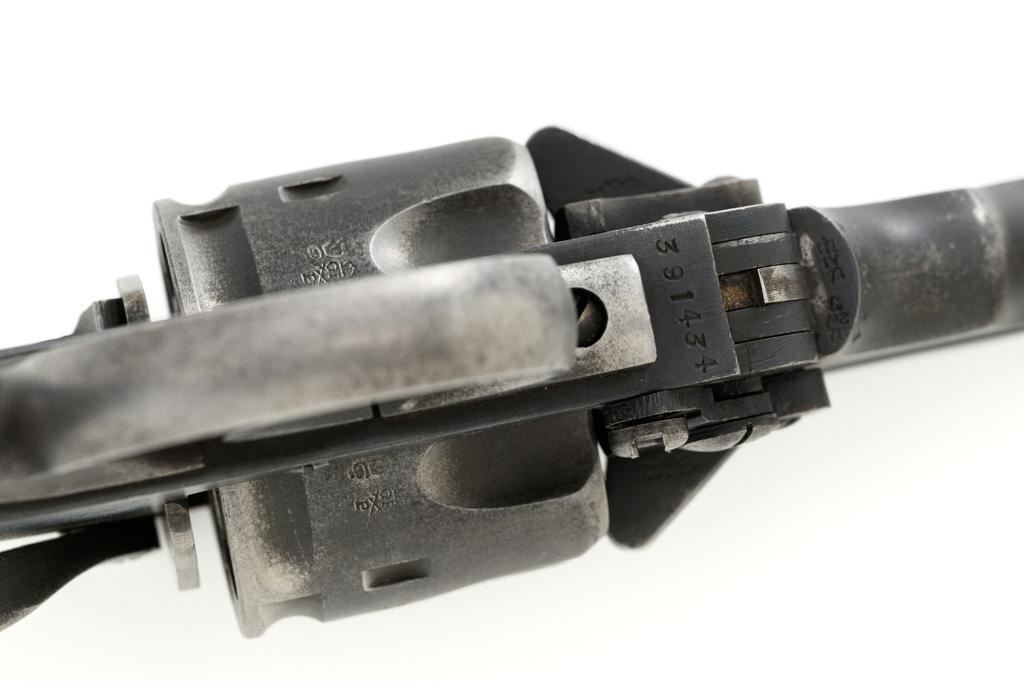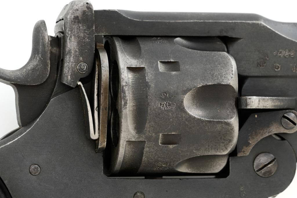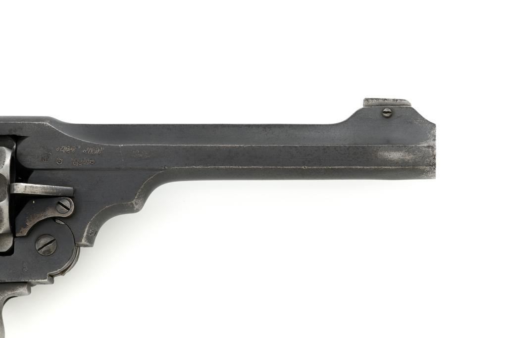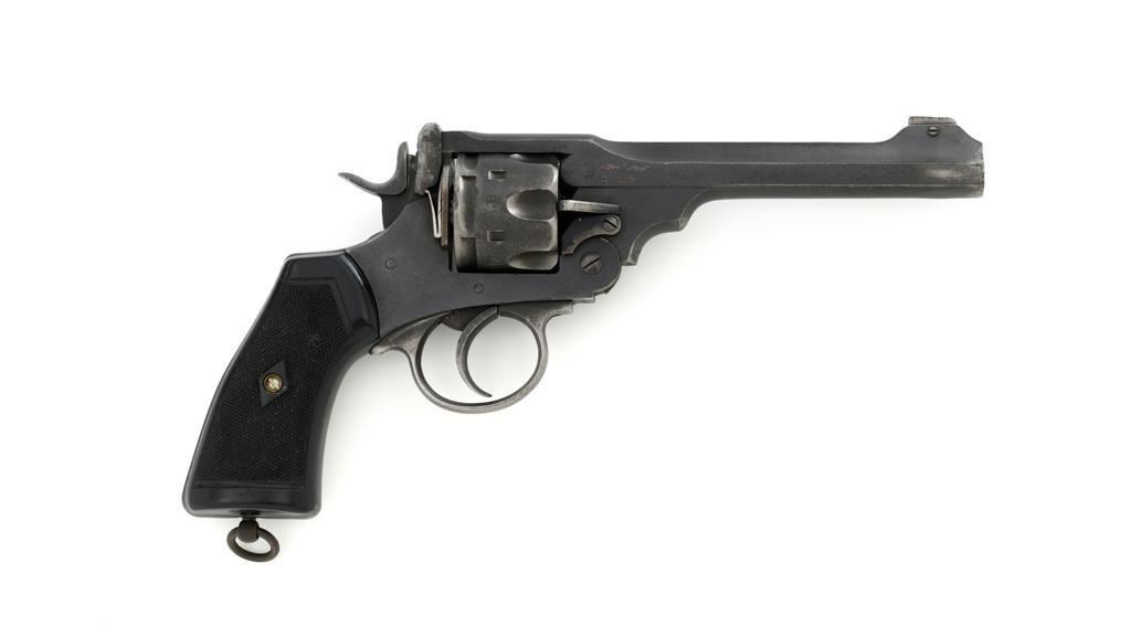 British Webley Mark VI Double Action Revolver, #391434, .45 ACP cal., 6'' flat sided barrel, blued finish, checkered black plastic grips, pinned blade front sight, fixed rear sight with ''U''-notch, and swiveling lanyard ring. Pistol has been importer converted to .45 ACP cal., by machining off the rear of the cylinder. Left side of the frame is marked ''WEBLEY/MARK VI/PATENTS/1918''. Left side of the barrel strap is stamped with an ''18''(in service)/(Broad Arrow) property/(Enfield Arsenal) inspector's mark/MARK VI''. Matching numbers. London export proof stamps on right side barrel. Condition overall is very good, retaining approx. 85% toning blue, with wear to the trigger and trigger guard. The hammer and stirrup latch have been cleaned and the top of the front sight has been filed lower. Grips are in excellent condition and look like recent reproductions. Action locks up, cycles, and ejects smoothly. Bore rates fair, with a small bulge to the left and right side, showing darkening, and good rifling. Est.: $400-$600. (C&R/PPT)