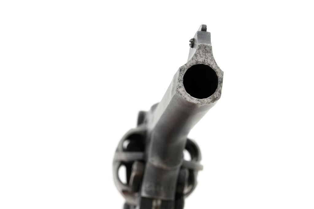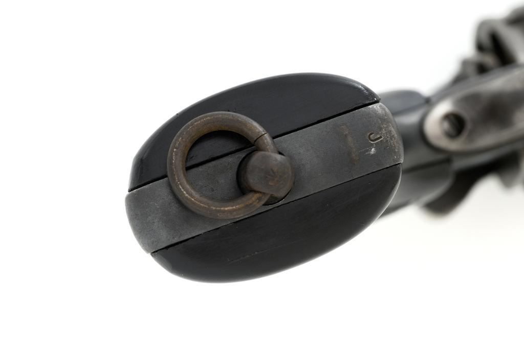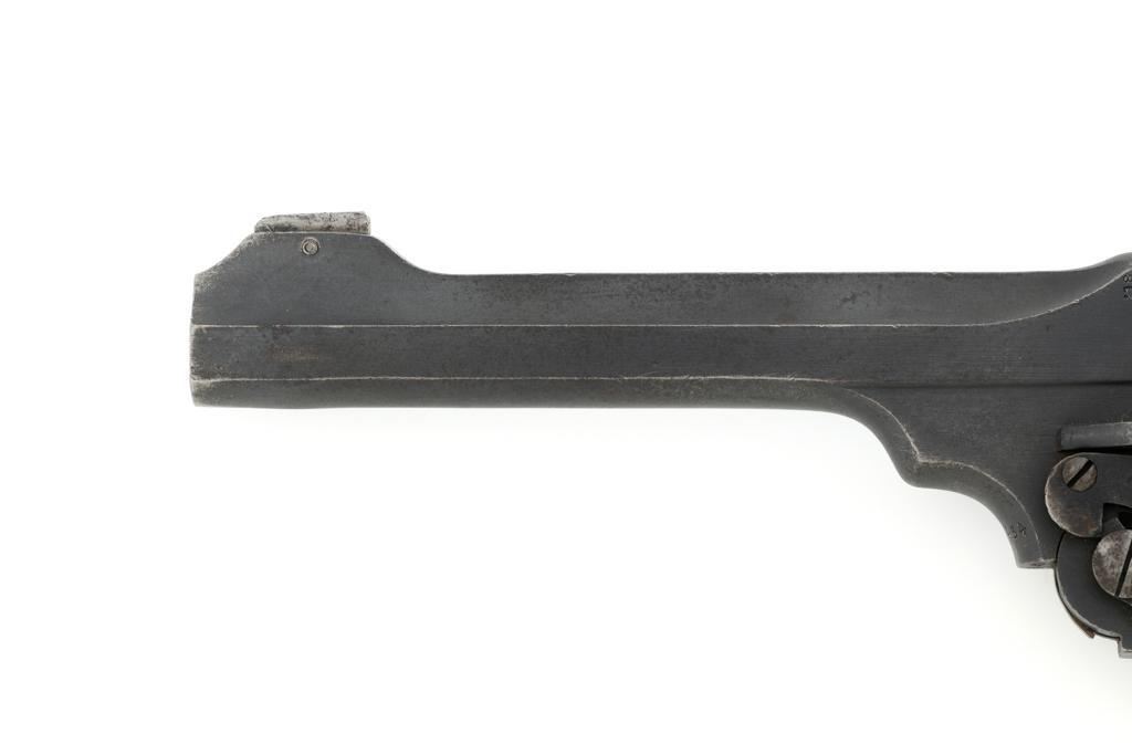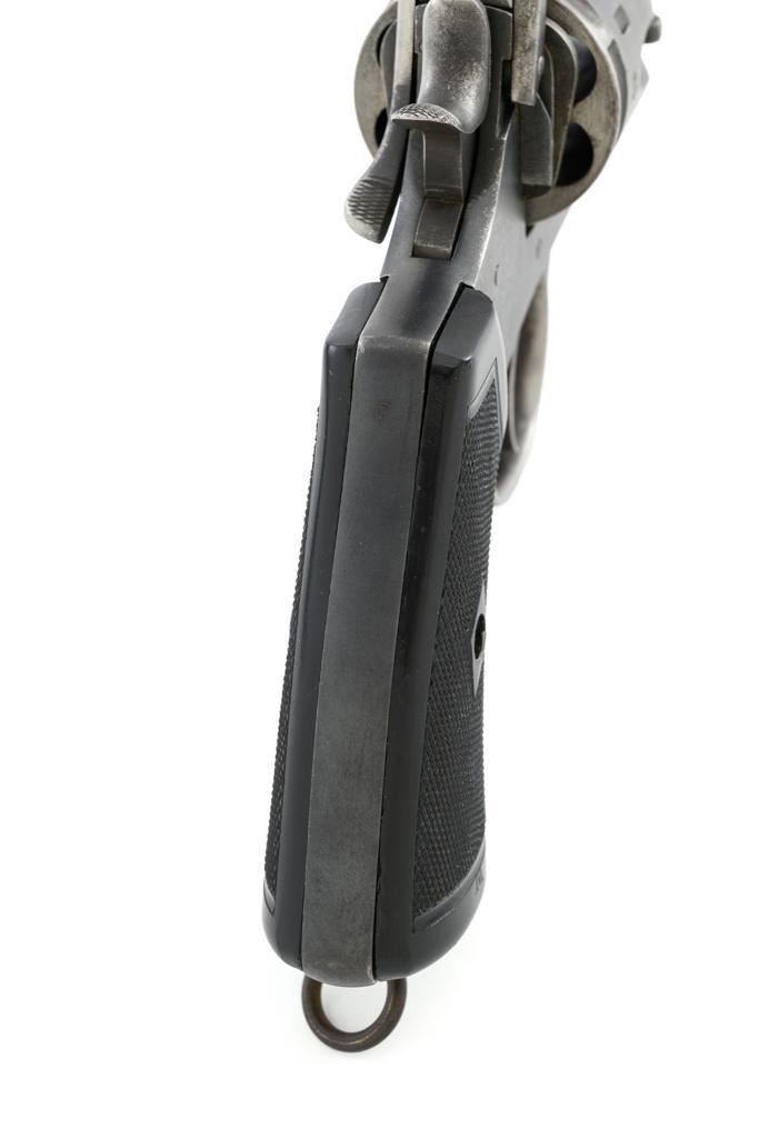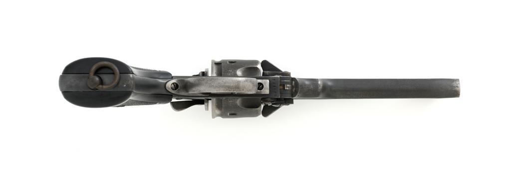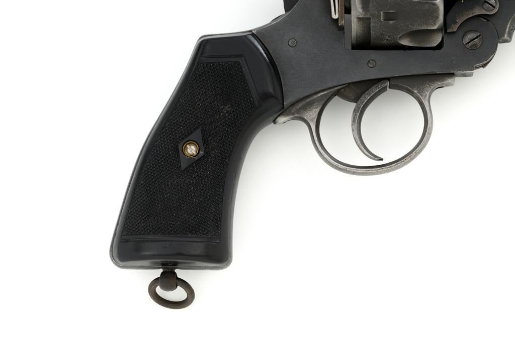 British Webley Mark VI Double Action Revolver, #391434, .45 ACP cal., 6'' flat sided barrel, blued finish, checkered black plastic grips, pinned blade front sight, fixed rear sight with ''U''-notch, and swiveling lanyard ring. Pistol has been importer converted to .45 ACP cal., by machining off the rear of the cylinder. Left side of the frame is marked ''WEBLEY/MARK VI/PATENTS/1918''. Left side of the barrel strap is stamped with an ''18''(in service)/(Broad Arrow) property/(Enfield Arsenal) inspector's mark/MARK VI''. Matching numbers. London export proof stamps on right side barrel. Condition overall is very good, retaining approx. 85% toning blue, with wear to the trigger and trigger guard. The hammer and stirrup latch have been cleaned and the top of the front sight has been filed lower. Grips are in excellent condition and look like recent reproductions. Action locks up, cycles, and ejects smoothly. Bore rates fair, with a small bulge to the left and right side, showing darkening, and good rifling. Est.: $400-$600. (C&R/PPT)