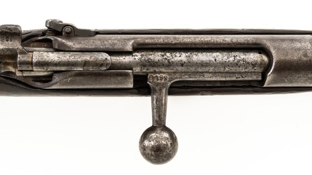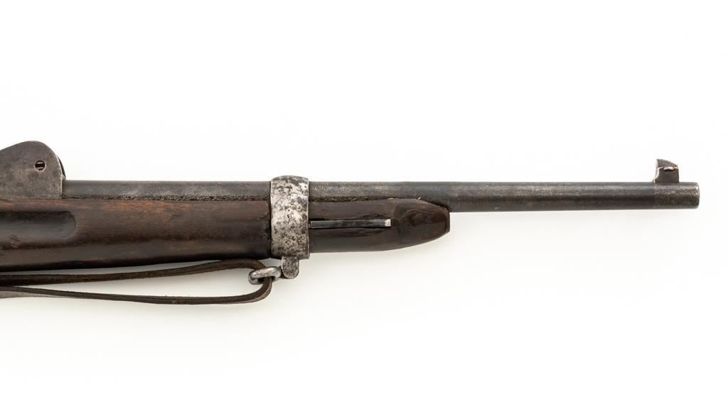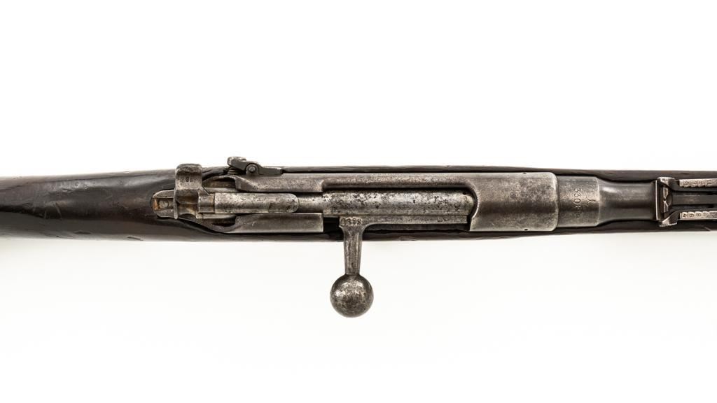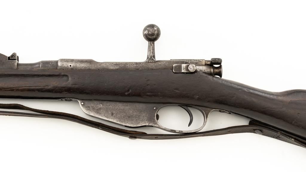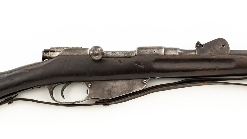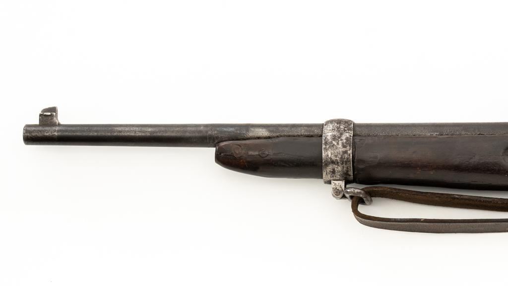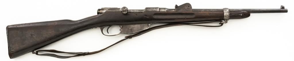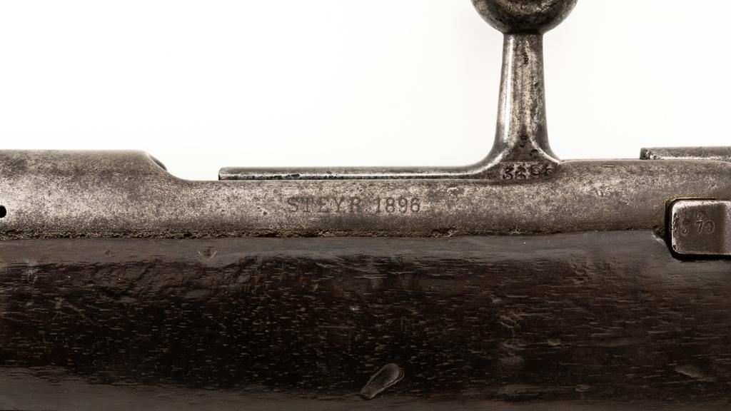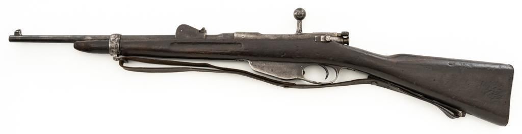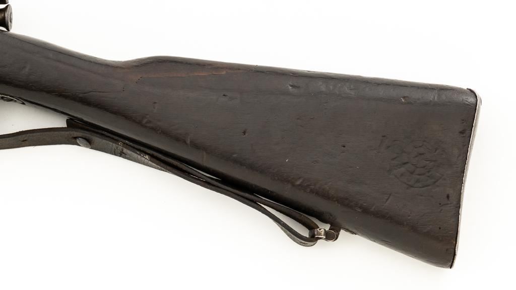 Indonesian Converted Dutch M95 Mannlicher Bolt Action Carbine, #3308B, .303 British cal., 17.75'' barrel, blued finish, straight grip hardwood stock, no handguard, dovetailed inverted-''V'' front sight, and adjustable rear sight with ''V'' notch, graduated to 1200 meters. Includes an unmarked black leather military sling; in fair used condition, showing age and wear. Left side of the receiver rail is marked ''STEYR 1896''. Top of the receiver ring is stamped with an Indonesian five pointed star over the serial number. There is an Indonesian cartouche with a star in the center stamped into left side of the buttstock. Numbered parts do not match. Condition overall is fair, much of the bluing has worn off the metal, and most parts show patina with pitting along the barrel at the wood line. Wood with dents and scratches scattered throughout. Action functions well. Bore is dark and in poor condition, with heavy frosting throughout. Est.: $200-$300. (Antique)