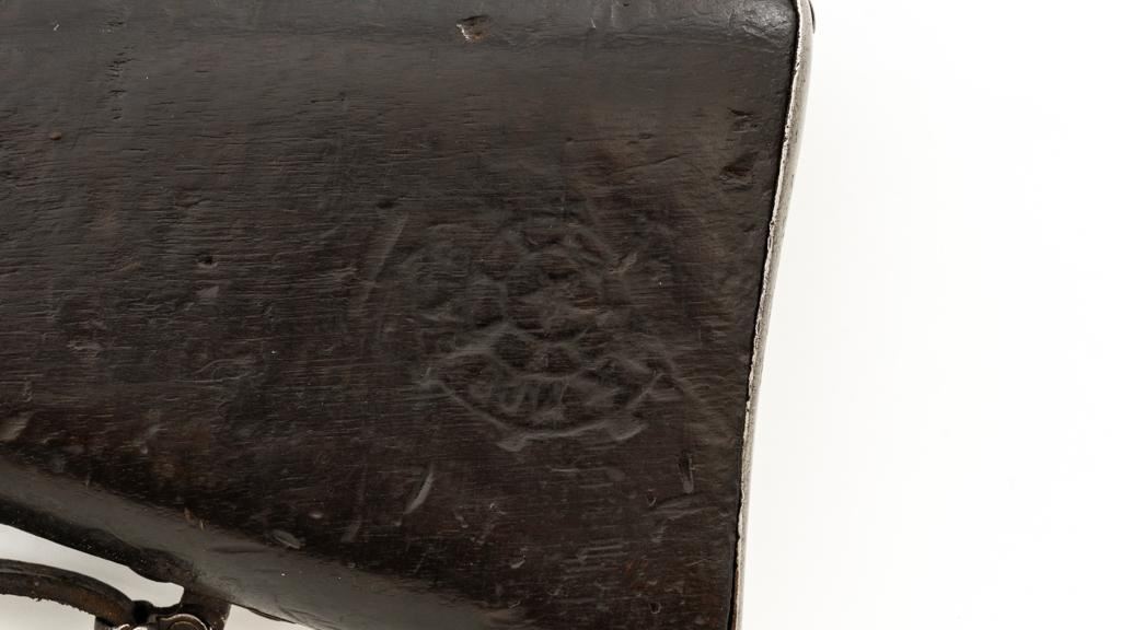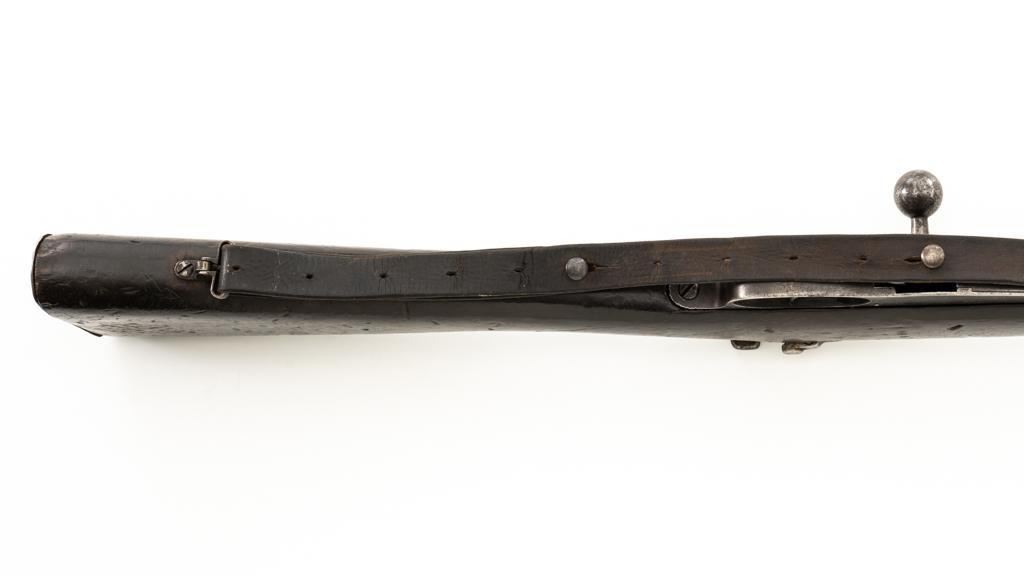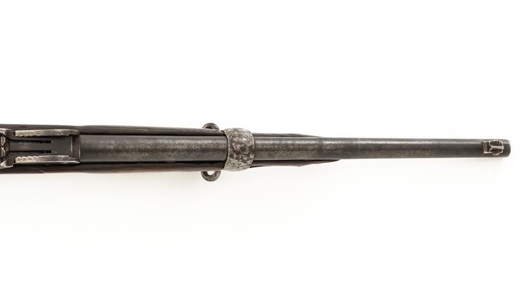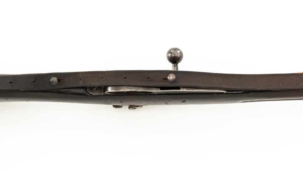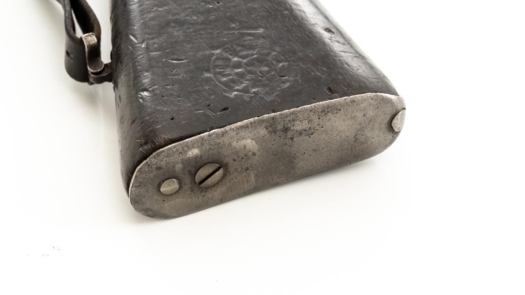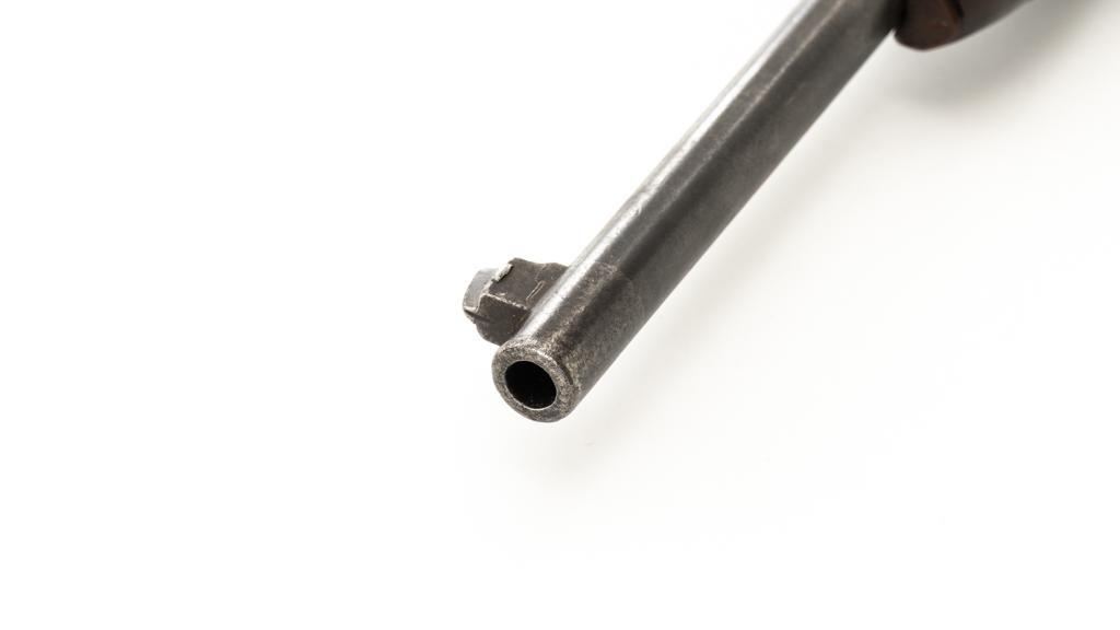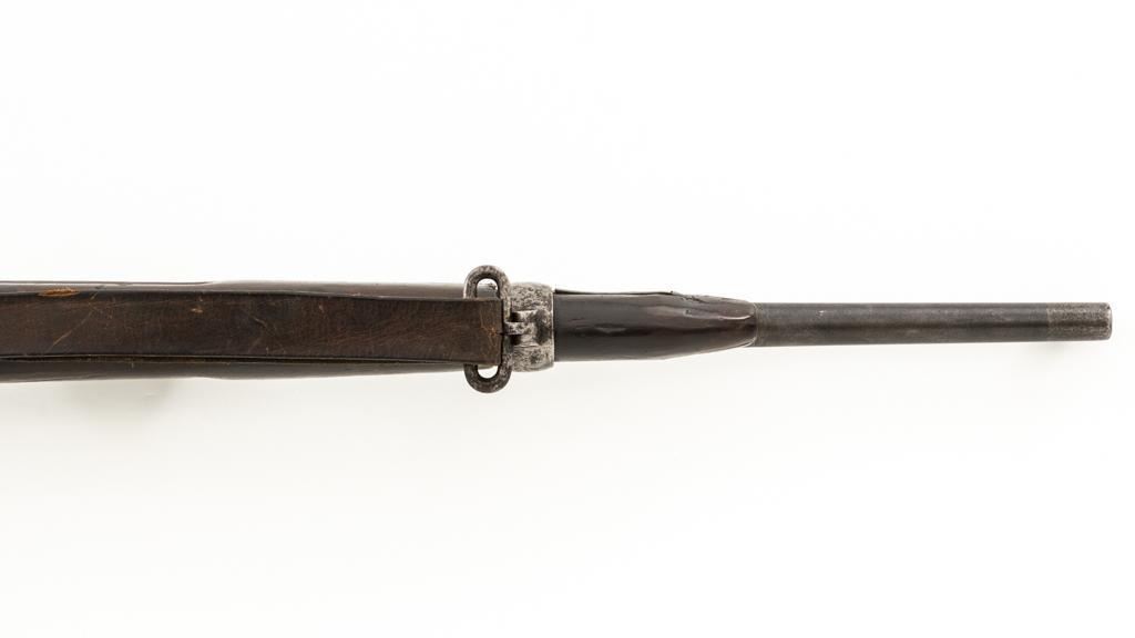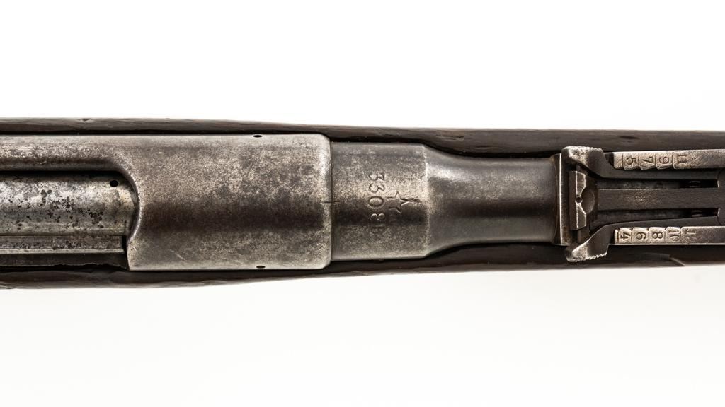 Indonesian Converted Dutch M95 Mannlicher Bolt Action Carbine, #3308B, .303 British cal., 17.75'' barrel, blued finish, straight grip hardwood stock, no handguard, dovetailed inverted-''V'' front sight, and adjustable rear sight with ''V'' notch, graduated to 1200 meters. Includes an unmarked black leather military sling; in fair used condition, showing age and wear. Left side of the receiver rail is marked ''STEYR 1896''. Top of the receiver ring is stamped with an Indonesian five pointed star over the serial number. There is an Indonesian cartouche with a star in the center stamped into left side of the buttstock. Numbered parts do not match. Condition overall is fair, much of the bluing has worn off the metal, and most parts show patina with pitting along the barrel at the wood line. Wood with dents and scratches scattered throughout. Action functions well. Bore is dark and in poor condition, with heavy frosting throughout. Est.: $200-$300. (Antique)