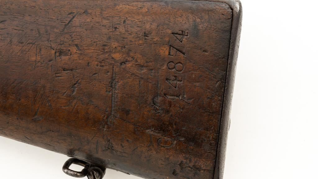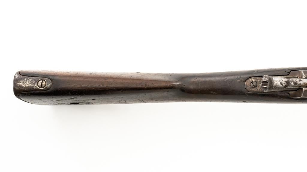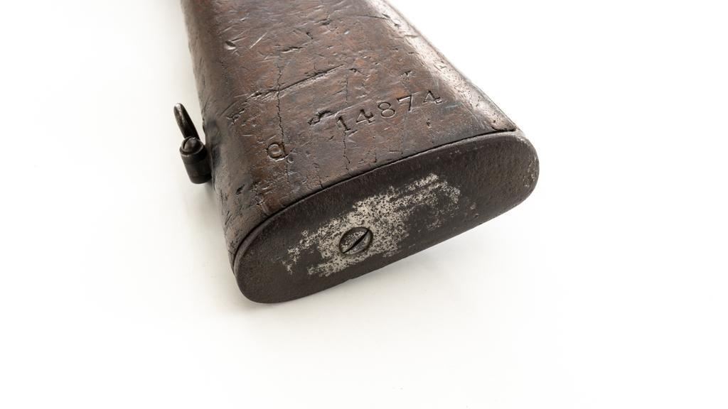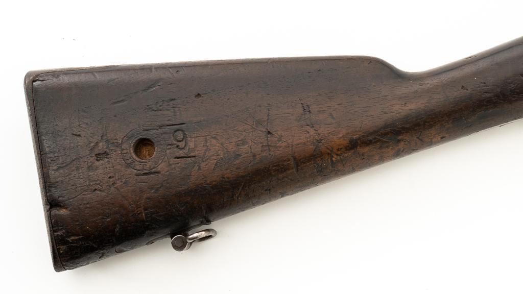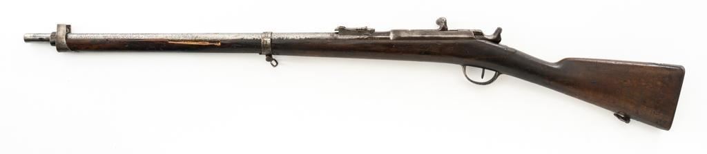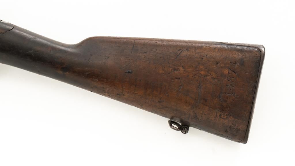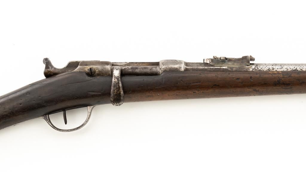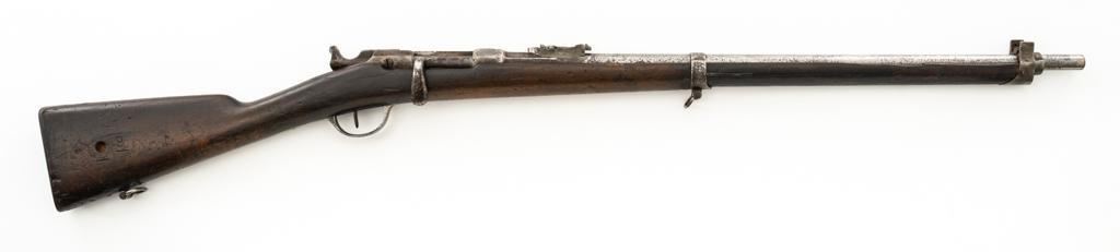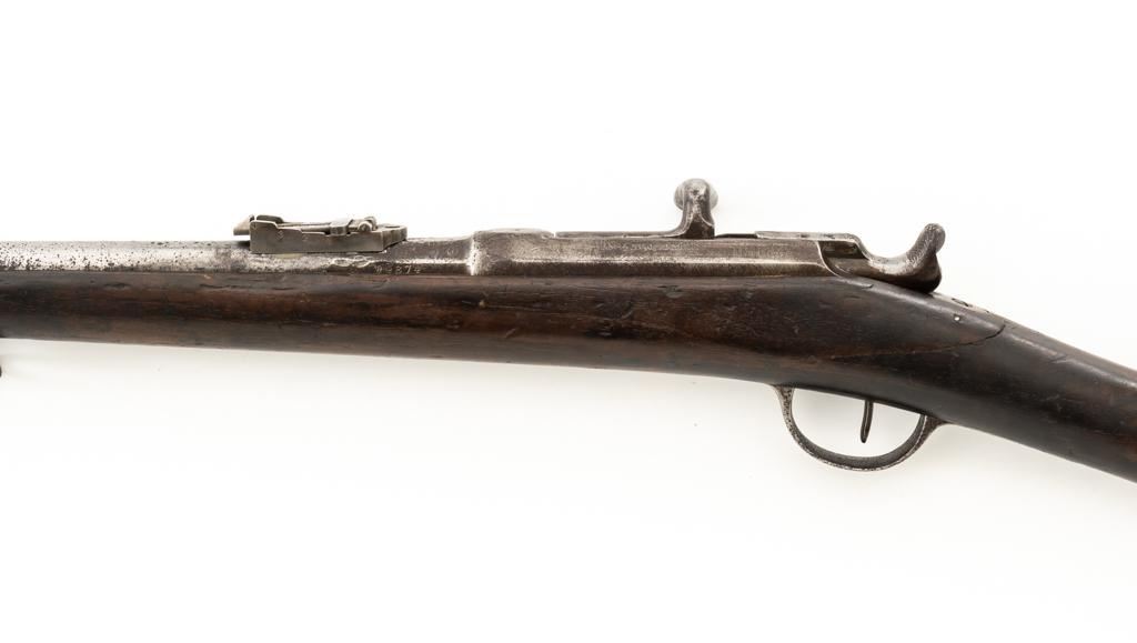Modified Antique French Model 1866 Chassepot Bolt Action Rifle, #14874, 11mm cal., 26'' barrel, bright metal, straight grip hardwood stock, replacement blade front sight with protectors, and replacement folding leaf rear sight with ''V''-notch, graduated to 1300 meters. No cleaning rod and the hole appears to be filled with a wooden dowel. Left side of the receiver is marked ''MANUFACTURE D'ARMES/St Etienne/MLE 1866''. Right side of the barrel shank is marked ''S.1873''. There is a faint cartouche dated ''1873''on right side of the buttstock, with a stamped ''9''. The water plug is missing. Matching numbered buttstock, other parts do not match. Rifle was modified by installing a fabricated front sight and gluing a Mauser type sight to the rear of the barrel. Bolt handle has been turned down and flattened. Condition overall is fair, with a combination of dark patina mixed with cleaned gray metal. There are impact marks to the barrel, near the rear sight. Stock is in poor condition, with cracks to both sides of the wrist, and cracks and large splinters missing from the forend. Action functions well. Bore is dark with fair rifling. Est.: $200-$400. (Antique)