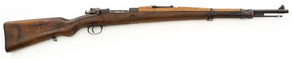 Yugoslavian Model 1924 Mauser Bolt Action Rifle, #250171, 8x57mm cal., 23.3'' barrel, blued finish, hardwood stock, inverted ''V'' front sight and adjustable tangent rear sight, with leather sling. Marked on receiver ring with Yugoslavian crest over Cyrillic ''MODEL 1924''; Cyrillic script on left side of receiver. Bolt handle has been re-numbered to match, other numbers are mismatched. Condition overall is very good with metal surfaces retaining approx. 60% finish. Wood is good with flaking and scratches to the varnish finish. Handguard is a replacement and is a lighter color than the stock. Action is smooth, bright bore is very good. Import stamped ''TURKEY 8 MM'' on right side of receiver. Est.: $300-$450. (C&R/PPT