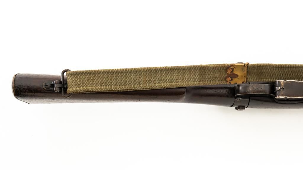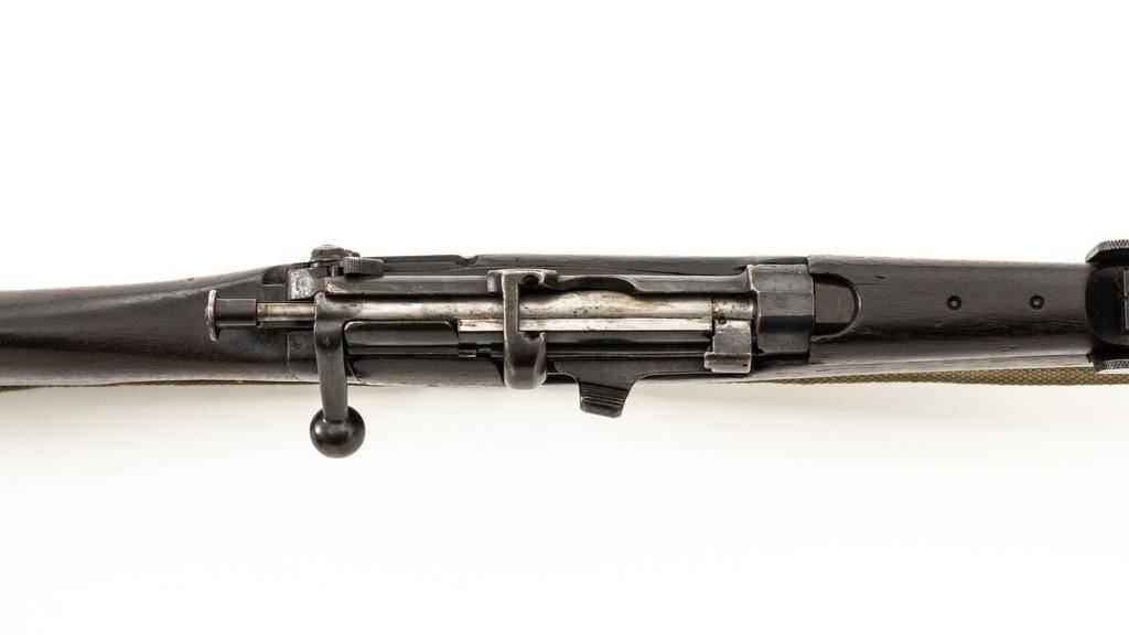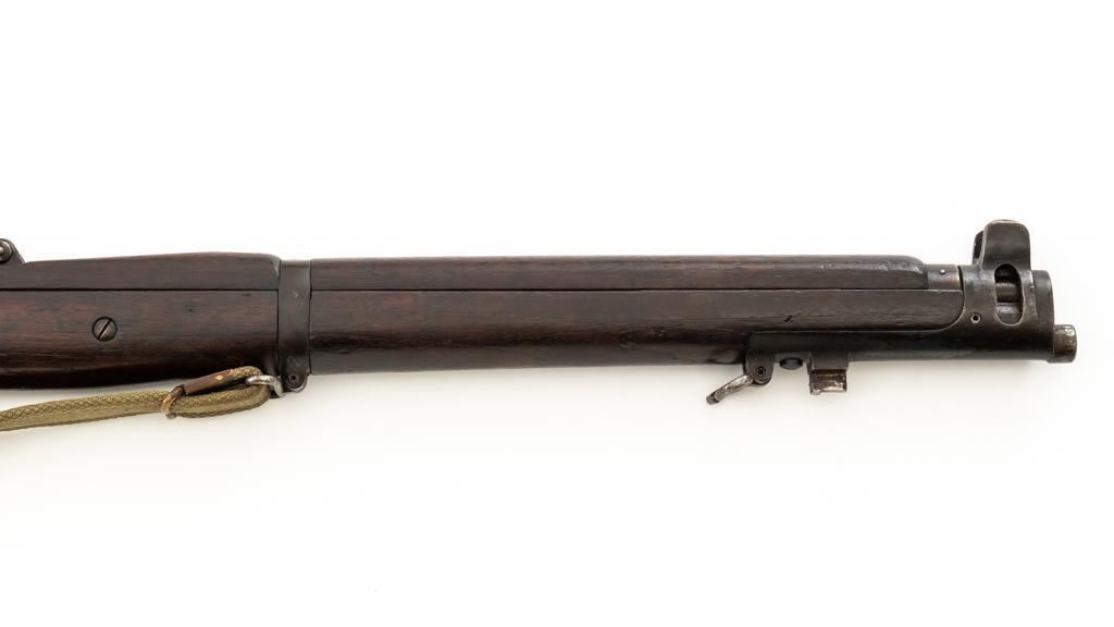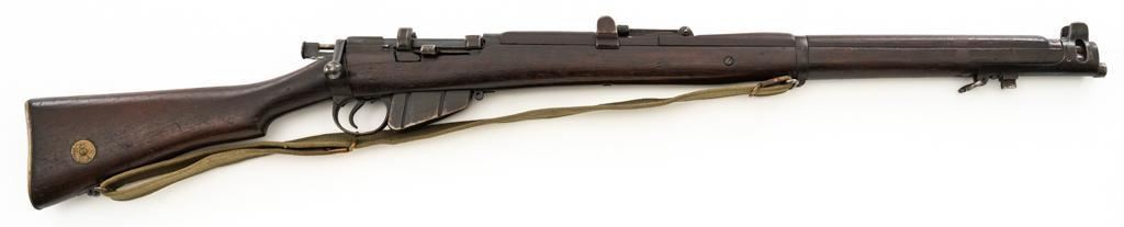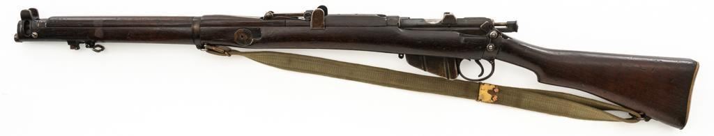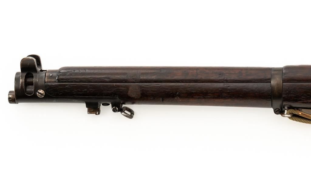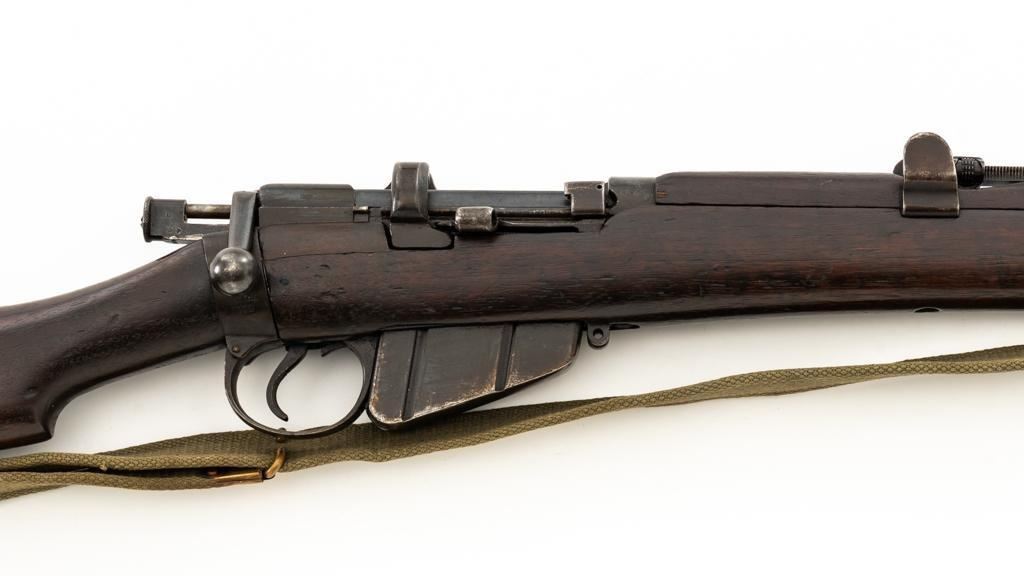 London Small Arms Co. Enfield No. 1 MK III Bolt Action Rifle, #O61840, .303 British cal., 25.2'' barrel, blued finish, walnut stock set, blade front sight with protectors, and adjustable tangent rear sight with ''U''-notched groove, graduated to 2000 meters. This rifle also features a charger bridge on top of the receiver, magazine cut-off, and long range dial sight on left side of the forend. Includes a cotton Belgian sling, marked ''ABL''. In very good used condition, showing moderate age and wear. Additionally, there is a brass oiler marked ''AMS'', located in the buttstock trap. Also, in very good condition. Rifle rates good overall, retaining much of the original thinning and toning blue finish, mixed with brown patina. Bayonet lug shows evidence of having been filed down and is a little rough around some of the edges. Wood is dark, showing handling and marks from use scattered throughout, two small chips to the left side behind the action body, and a fine 2'' crack to the right side above the trigger. Action operates smoothly. Bore is greased but appears to be in good condition, with defined rifling. Est.: $400-$600. (C&R)