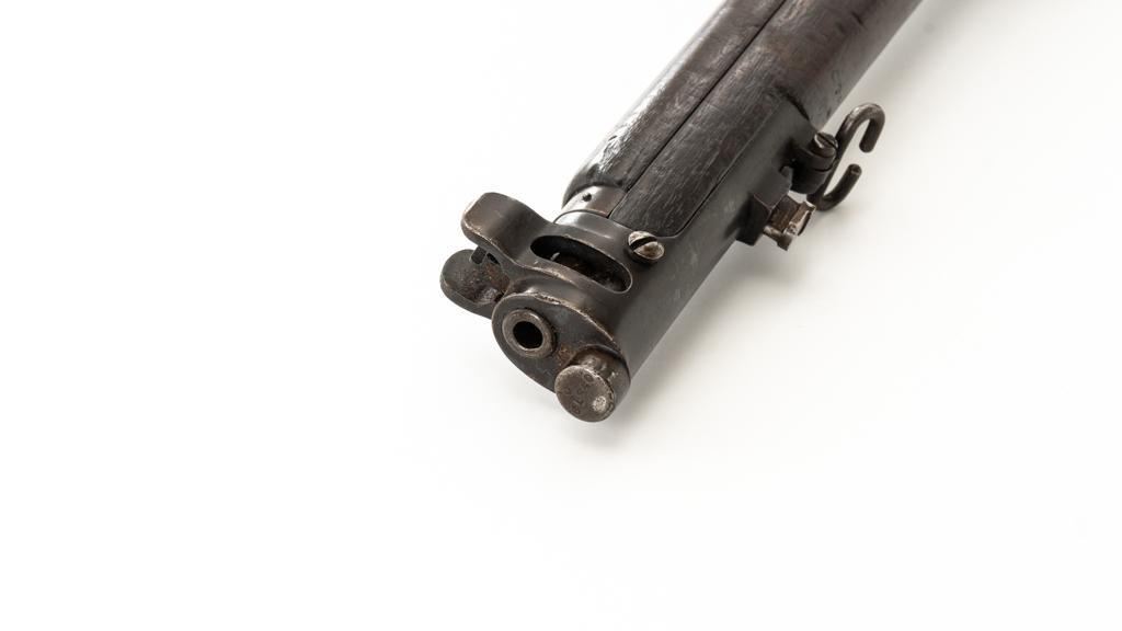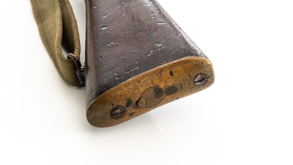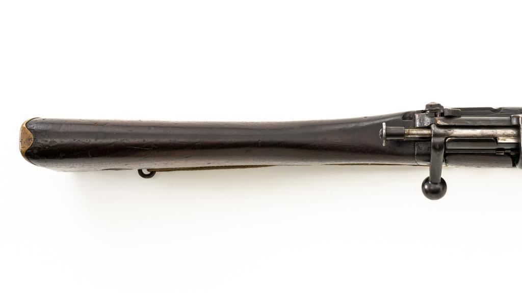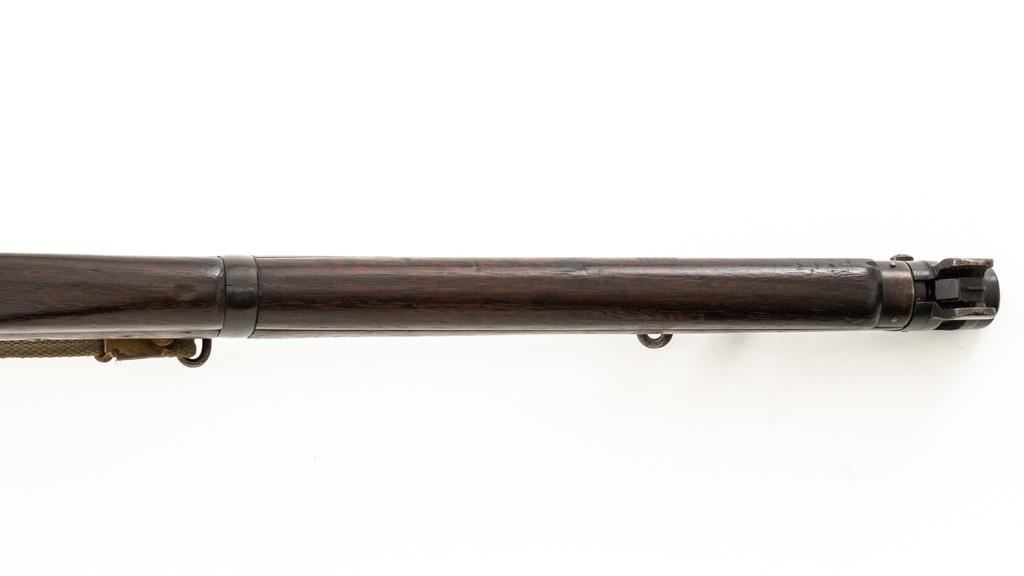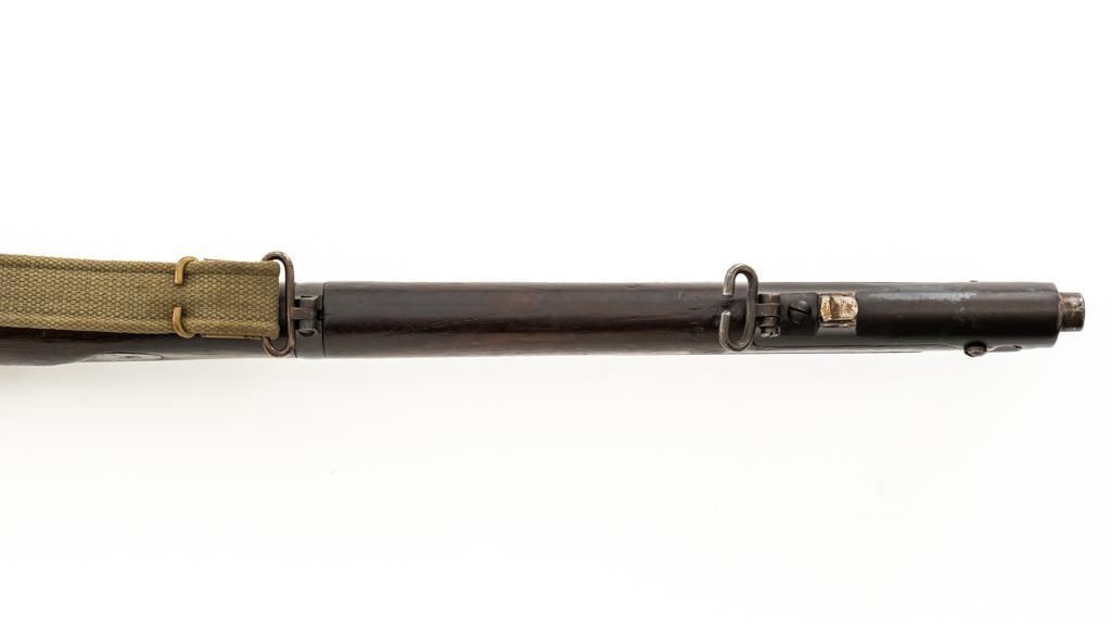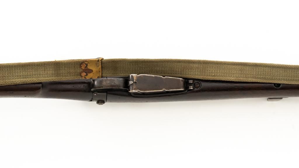London Small Arms Co. Enfield No. 1 MK III Bolt Action Rifle, #O61840, .303 British cal., 25.2'' barrel, blued finish, walnut stock set, blade front sight with protectors, and adjustable tangent rear sight with ''U''-notched groove, graduated to 2000 meters. This rifle also features a charger bridge on top of the receiver, magazine cut-off, and long range dial sight on left side of the forend. Includes a cotton Belgian sling, marked ''ABL''. In very good used condition, showing moderate age and wear. Additionally, there is a brass oiler marked ''AMS'', located in the buttstock trap. Also, in very good condition. Rifle rates good overall, retaining much of the original thinning and toning blue finish, mixed with brown patina. Bayonet lug shows evidence of having been filed down and is a little rough around some of the edges. Wood is dark, showing handling and marks from use scattered throughout, two small chips to the left side behind the action body, and a fine 2'' crack to the right side above the trigger. Action operates smoothly. Bore is greased but appears to be in good condition, with defined rifling. Est.: $400-$600. (C&R)