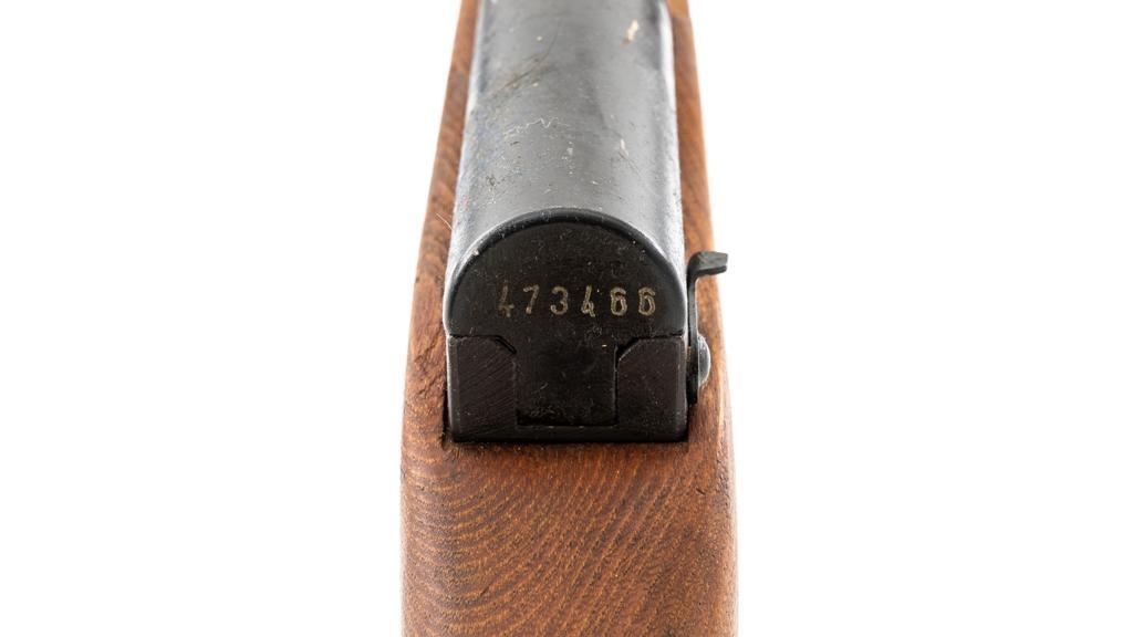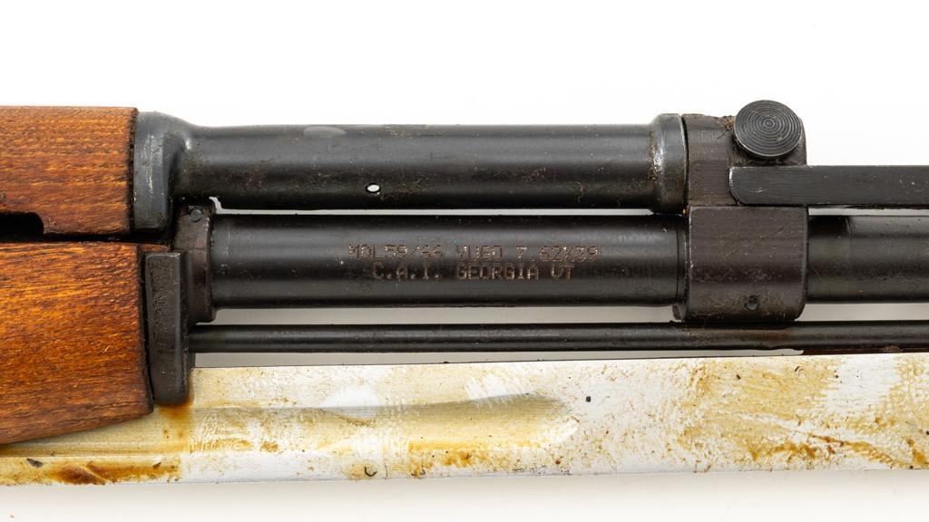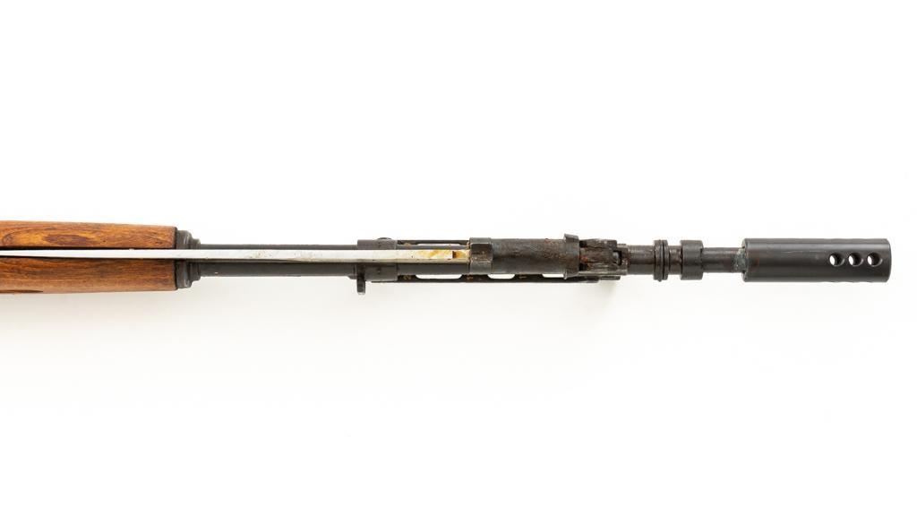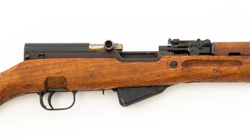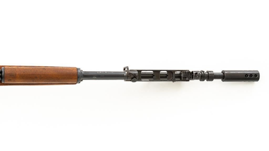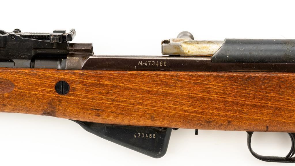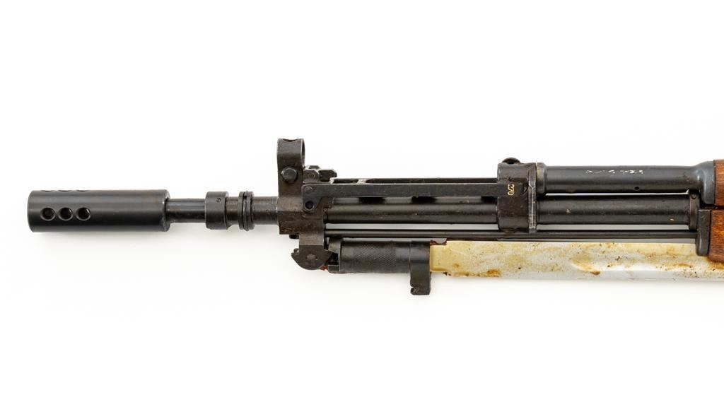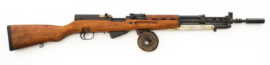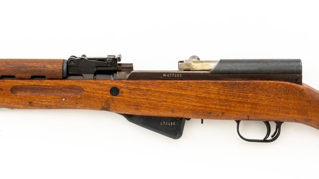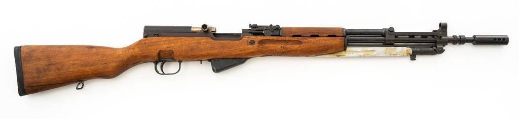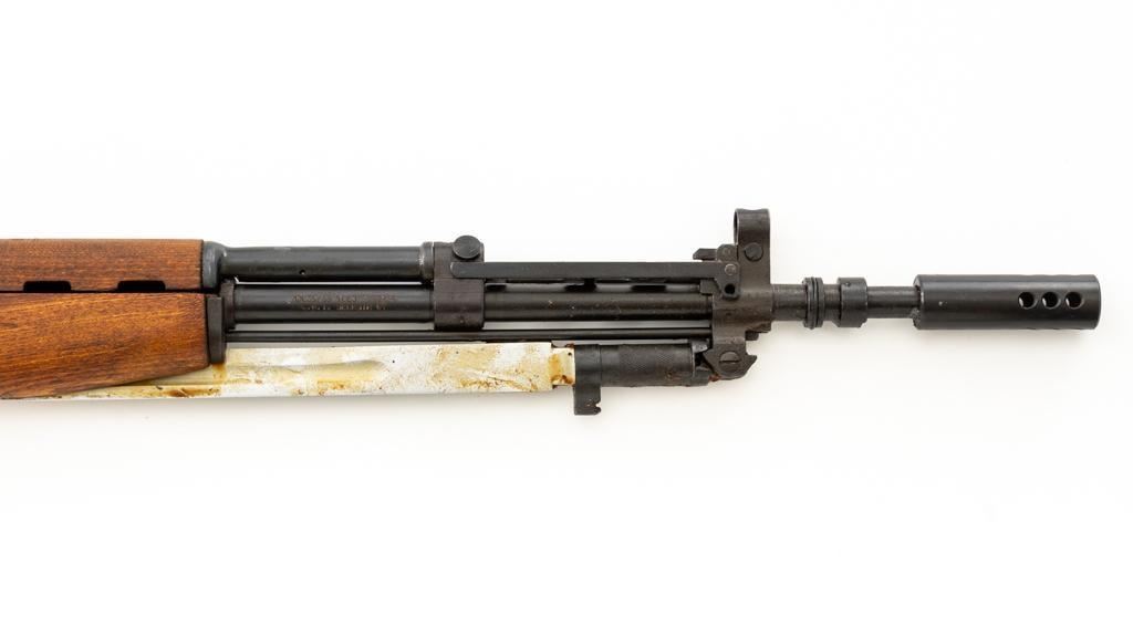 Modified Yugoslavian M59/66 SKS Semi-Automatic Carbine with Folding Bayonet, M-473466, 7.62x39mm cal., 24'' barrel (including muzzle brake), blued finish, elm stock with handguard and black rubber buttplate, hooded post front sight, and adjustable tangent rear sight with ''U''-notch and enhanced visibility dots. Includes folding bayonet, cleaning rod, and tan leather sling. Bayonet is in excellent condition. No cleaning kit in the buttstock trap. Modified by removing the launcher and installing a welded on muzzle brake. Matching numbers. ''87173'' has been added on the inside of the trigger guard. Import stamped on right side barrel. Condition overall is near excellent, retaining approx. 97% blue, showing some scratching to the gas tube. Wood with intermittent light handling marks. Action is greased but functions well. Bore is greased but appears near excellent overall. Est.: $500-$700. (C&R/PPT)