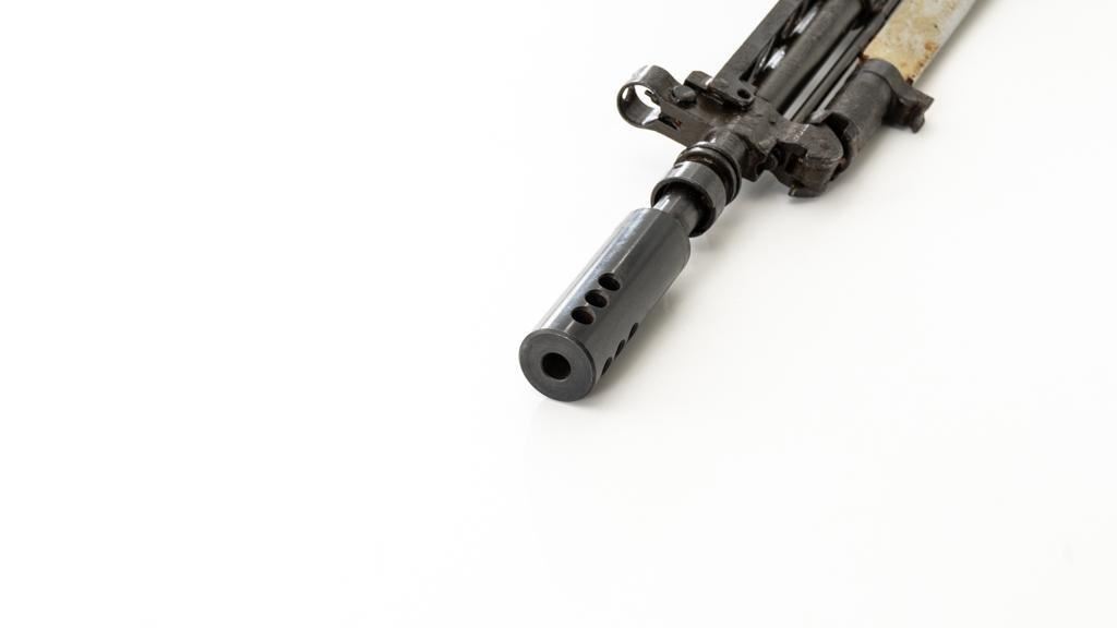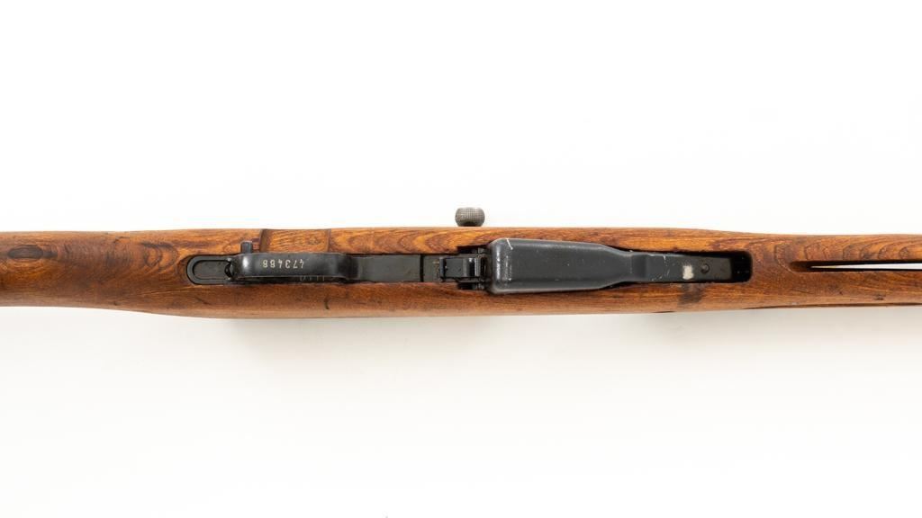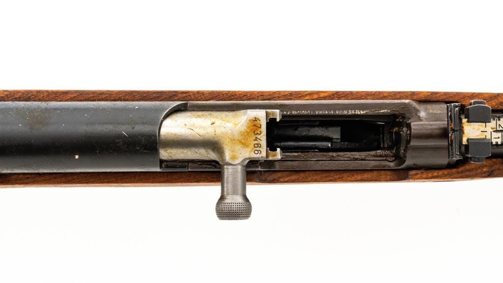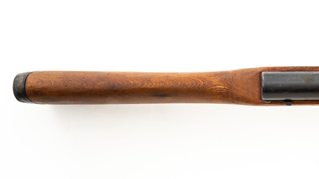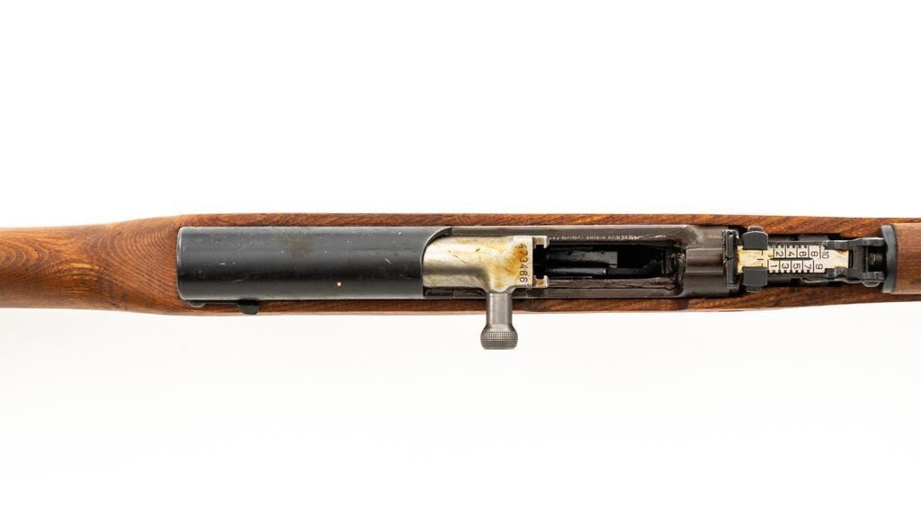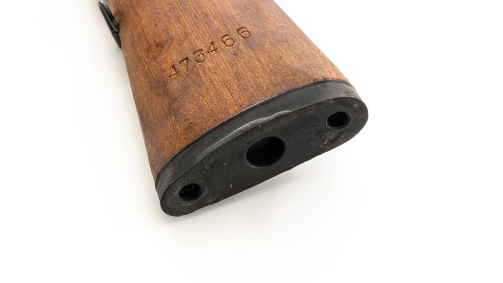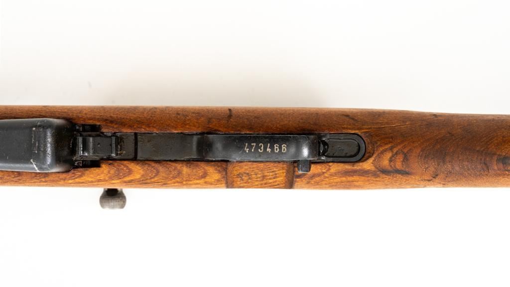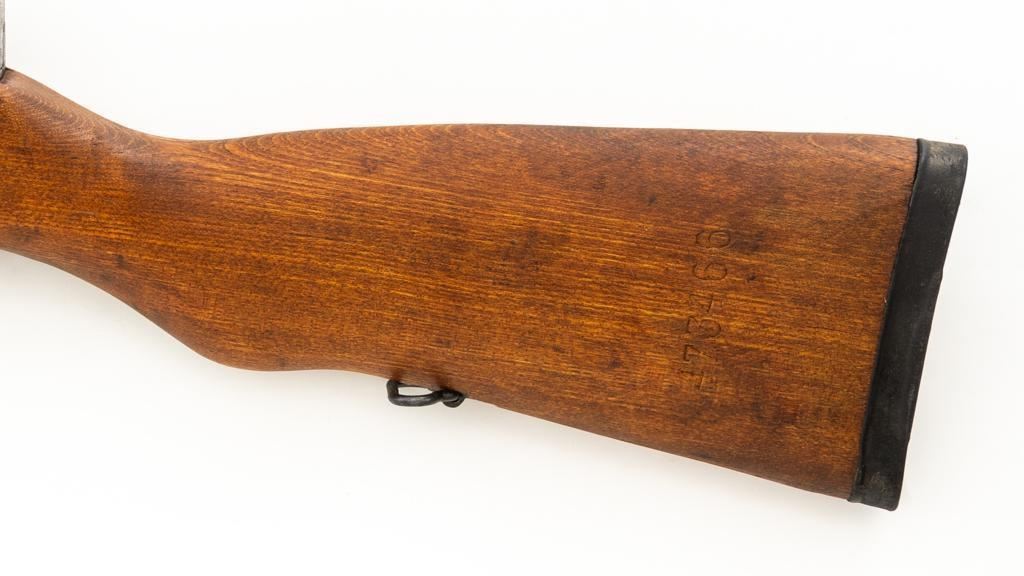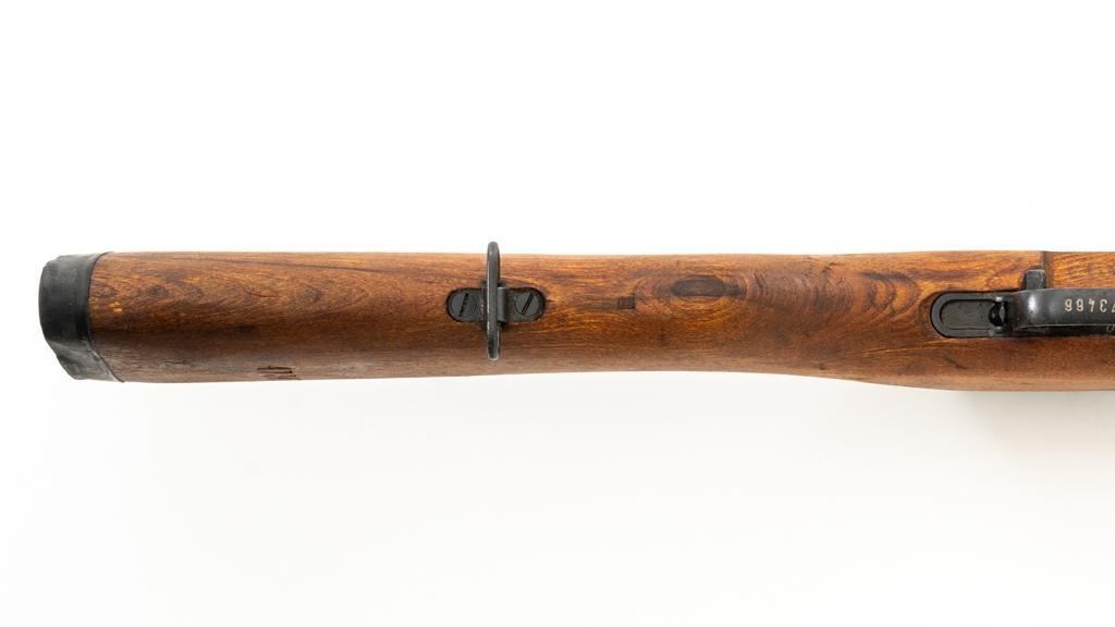 Modified Yugoslavian M59/66 SKS Semi-Automatic Carbine with Folding Bayonet, M-473466, 7.62x39mm cal., 24'' barrel (including muzzle brake), blued finish, elm stock with handguard and black rubber buttplate, hooded post front sight, and adjustable tangent rear sight with ''U''-notch and enhanced visibility dots. Includes folding bayonet, cleaning rod, and tan leather sling. Bayonet is in excellent condition. No cleaning kit in the buttstock trap. Modified by removing the launcher and installing a welded on muzzle brake. Matching numbers. ''87173'' has been added on the inside of the trigger guard. Import stamped on right side barrel. Condition overall is near excellent, retaining approx. 97% blue, showing some scratching to the gas tube. Wood with intermittent light handling marks. Action is greased but functions well. Bore is greased but appears near excellent overall. Est.: $500-$700. (C&R/PPT)
