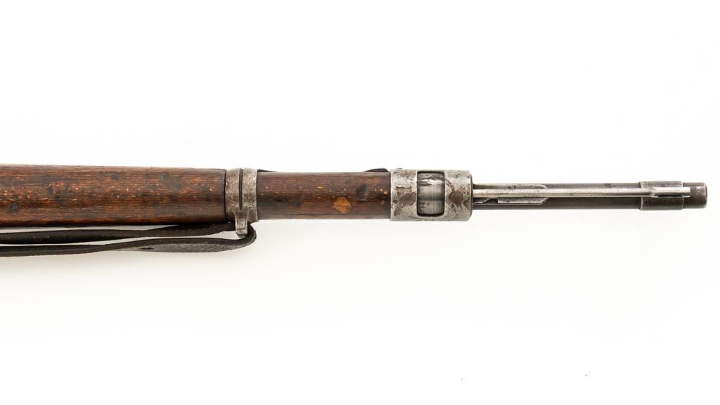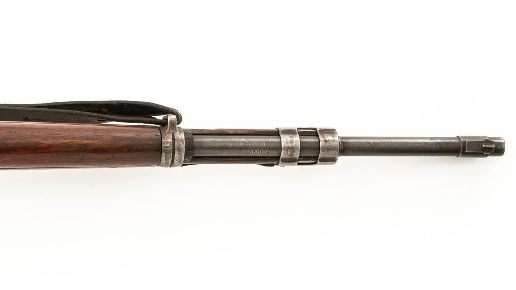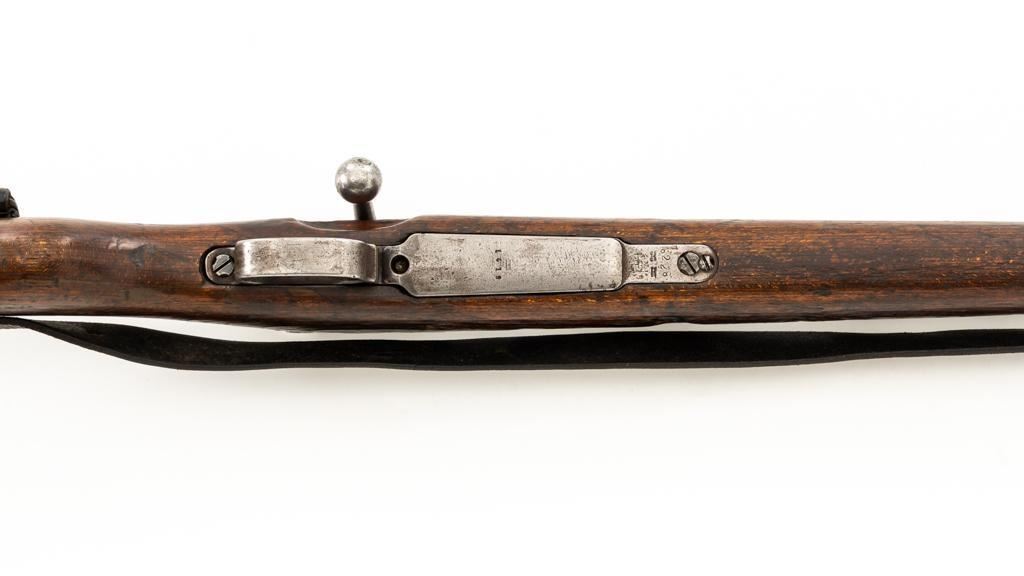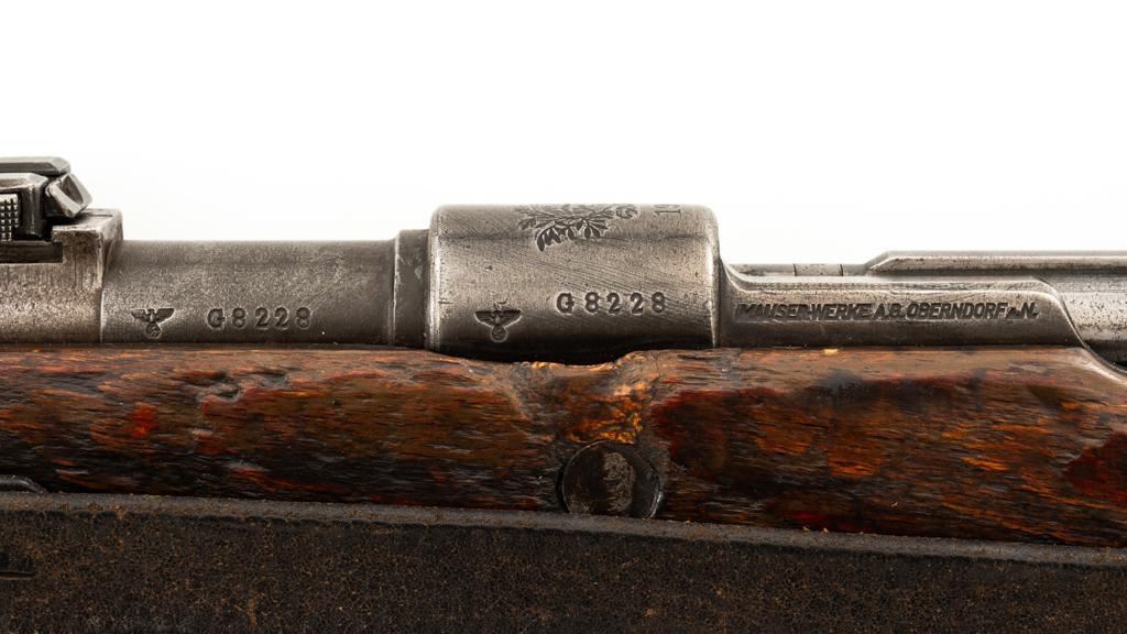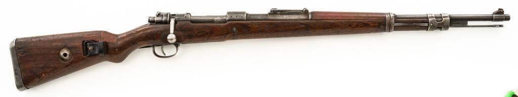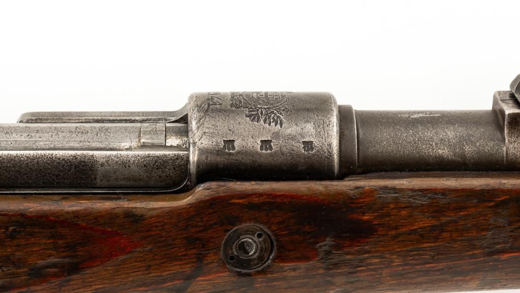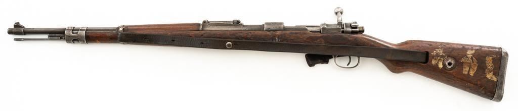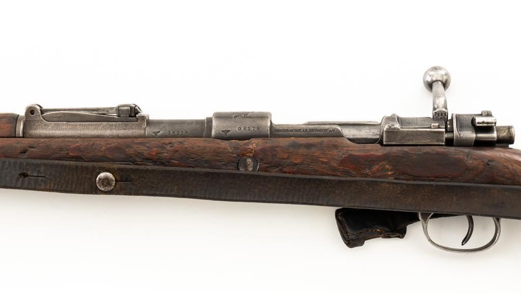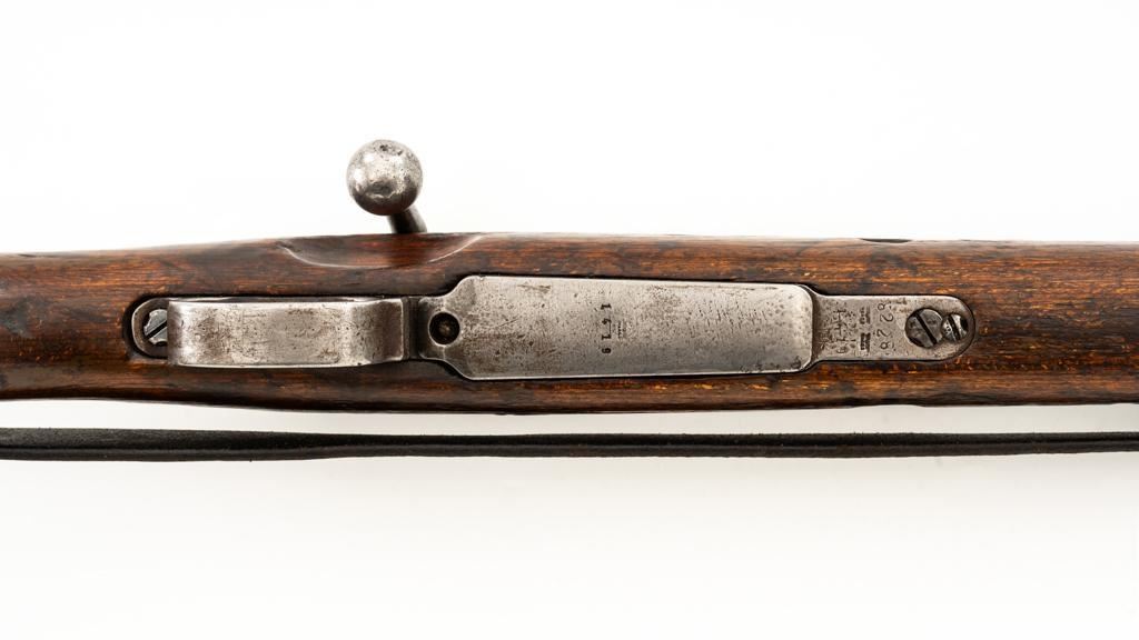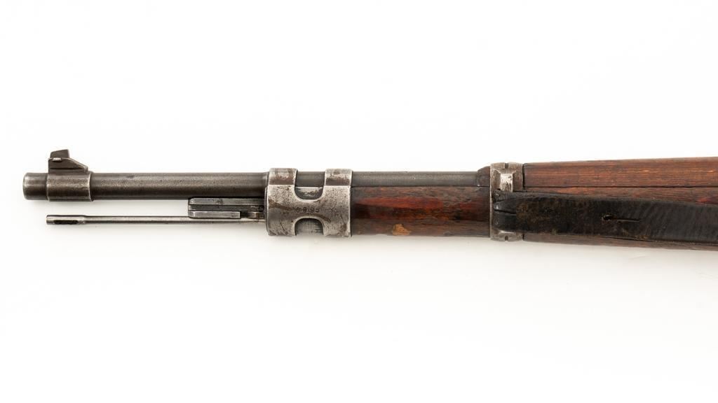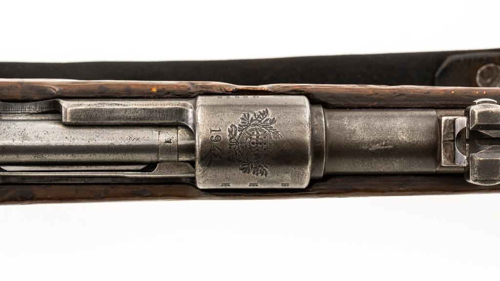 Portuguese Contract Kar 98k Mauser Bolt Action Rifle, #G8228, 8x57mm cal., 23.6'' barrel, blued finish, laminated stock and handguard with cupped buttplate, inverted-''V'' front sight, and adjustable tangent rear sight. Includes cleaning rod and unmarked brown leather sling. Sling is in good condition, showing age and wear, with some cracking to the leather. Rifle is marked on top of the receiver ring with Portuguese crest over ''1941''. Left side receiver rail is marked ''MAUSERWERKE A.G. OBERNDORF AN.'' There are Nazi eagle firing proofs on left side of the barrel and receiver; three ''(eagle)655'' stamps on right side of the receiver; two ''WaA655'' Waffenamts on right side of the barrel. There are no visible markings on the stock. German code ''gqm'' stamped on the buttplate. There are three large Arabic numbers painted on left side of the buttstock. Matching number on the barrel. Other numbered parts do not match. No visible import marks. Condition overall is good, retaining approx. 60% thinning and toning blue. Factory markings are clear. Wood is fair with spliced repairs to the buttstock comb, putty repair to left side of the forend, and has an overall rough appearance. Action operates smoothly but the safety lever is stuck in the ''fire'' position, will not turn over, and needs to be repaired. Bore rates good overall; grooves are dark, rifling is clearly defined. Est.: $600-$800. (C&R)