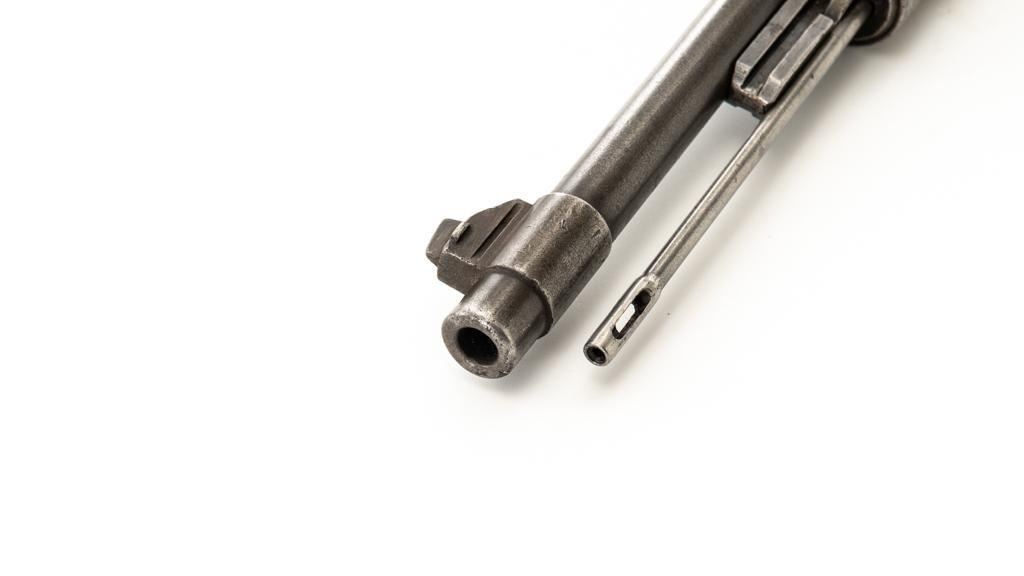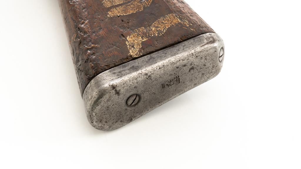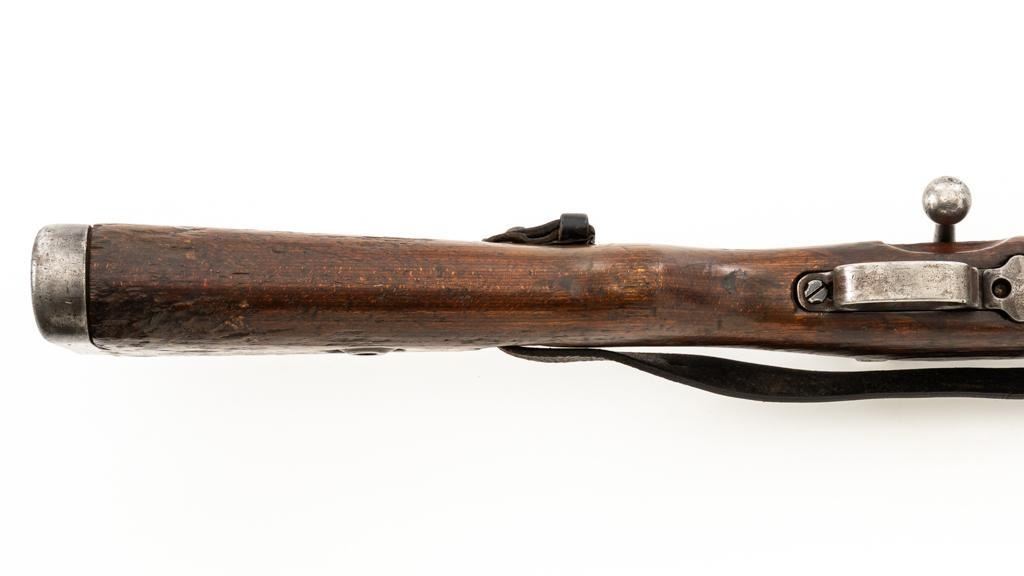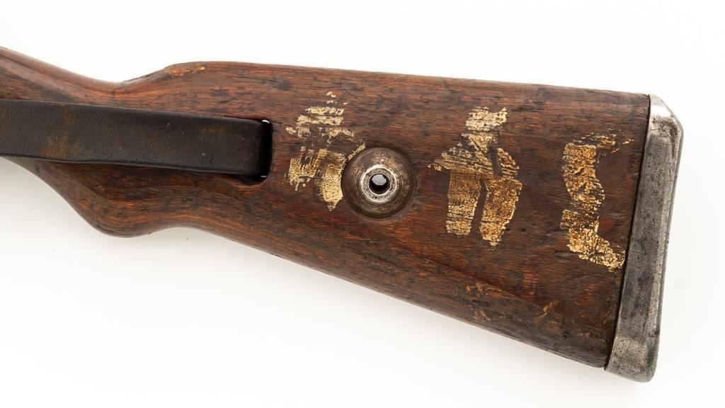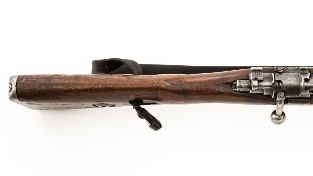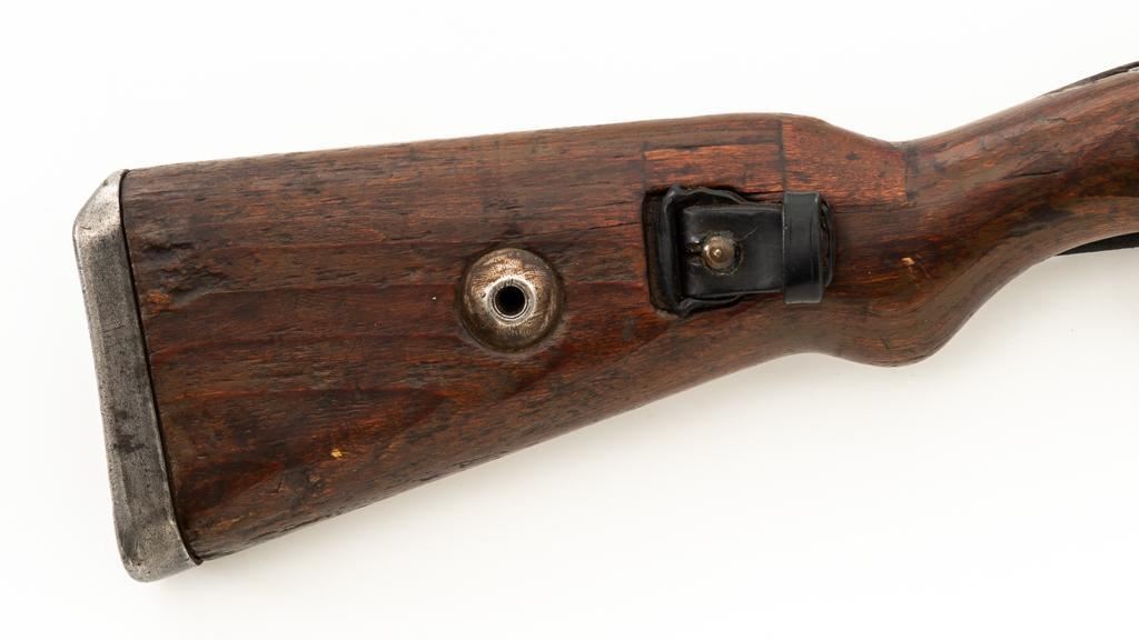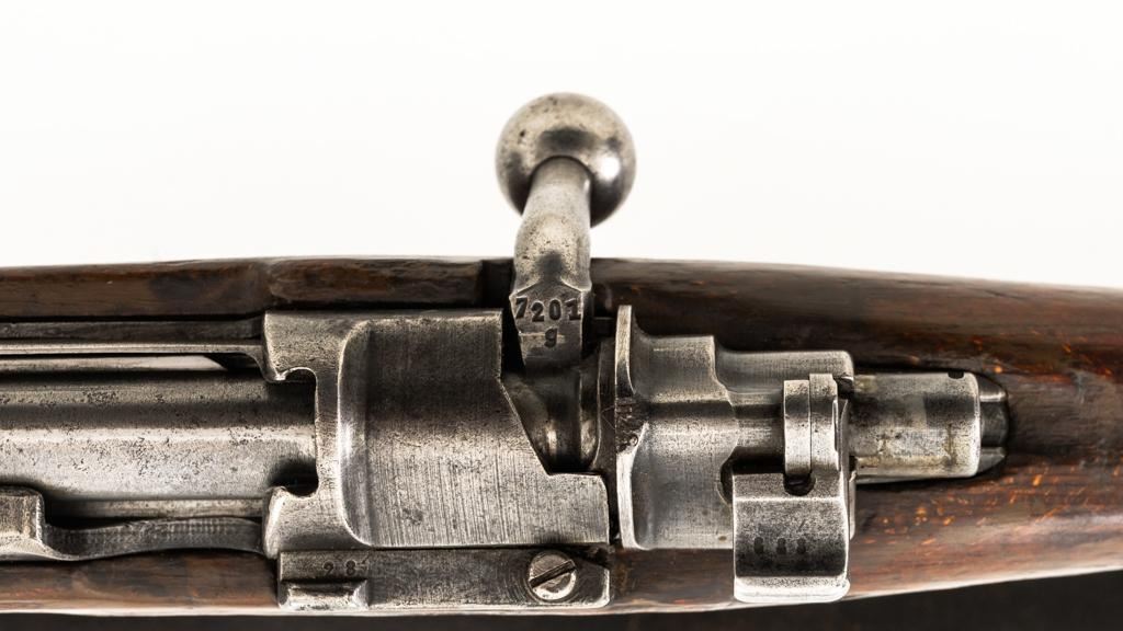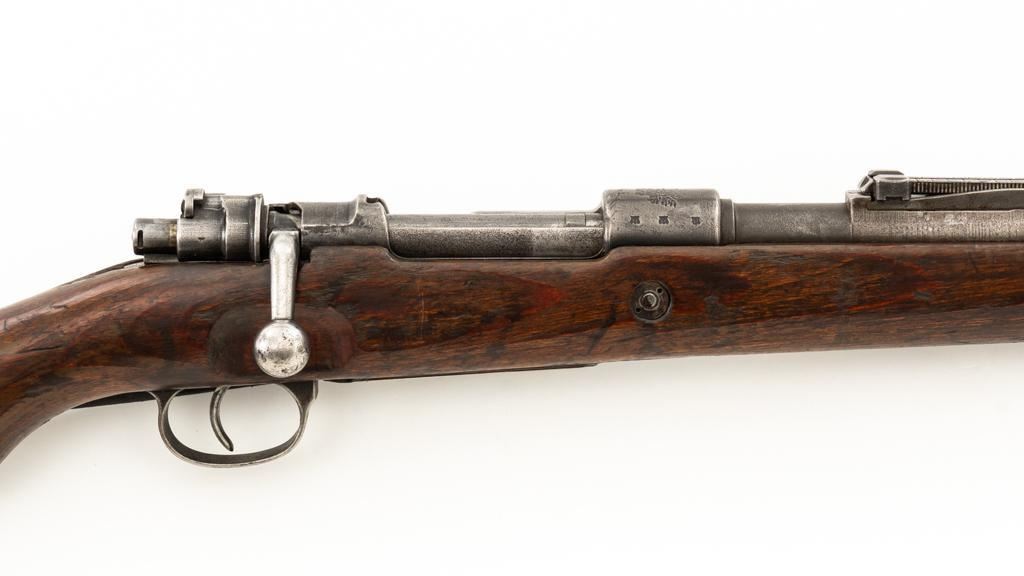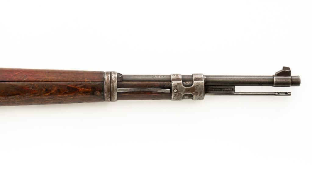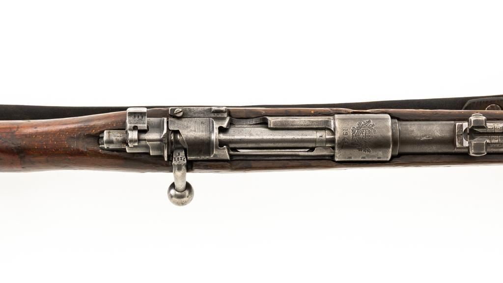 Portuguese Contract Kar 98k Mauser Bolt Action Rifle, #G8228, 8x57mm cal., 23.6'' barrel, blued finish, laminated stock and handguard with cupped buttplate, inverted-''V'' front sight, and adjustable tangent rear sight. Includes cleaning rod and unmarked brown leather sling. Sling is in good condition, showing age and wear, with some cracking to the leather. Rifle is marked on top of the receiver ring with Portuguese crest over ''1941''. Left side receiver rail is marked ''MAUSERWERKE A.G. OBERNDORF AN.'' There are Nazi eagle firing proofs on left side of the barrel and receiver; three ''(eagle)655'' stamps on right side of the receiver; two ''WaA655'' Waffenamts on right side of the barrel. There are no visible markings on the stock. German code ''gqm'' stamped on the buttplate. There are three large Arabic numbers painted on left side of the buttstock. Matching number on the barrel. Other numbered parts do not match. No visible import marks. Condition overall is good, retaining approx. 60% thinning and toning blue. Factory markings are clear. Wood is fair with spliced repairs to the buttstock comb, putty repair to left side of the forend, and has an overall rough appearance. Action operates smoothly but the safety lever is stuck in the ''fire'' position, will not turn over, and needs to be repaired. Bore rates good overall; grooves are dark, rifling is clearly defined. Est.: $600-$800. (C&R)