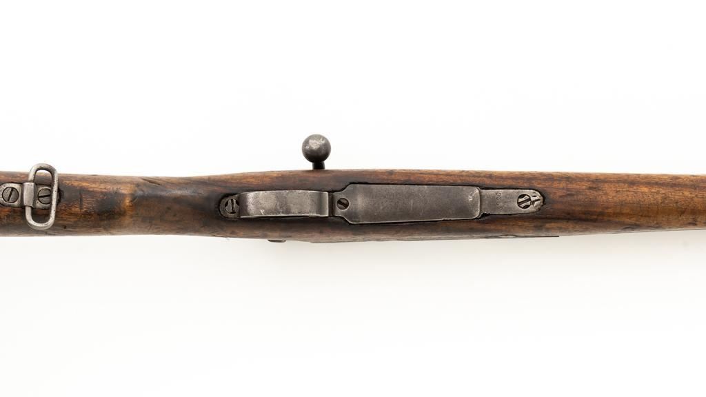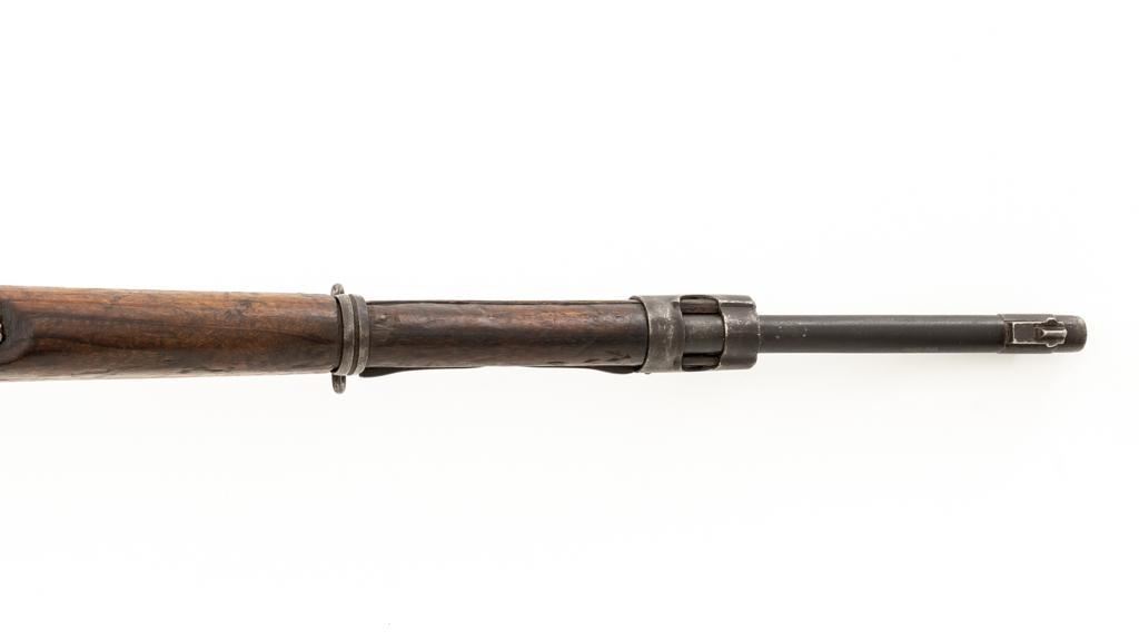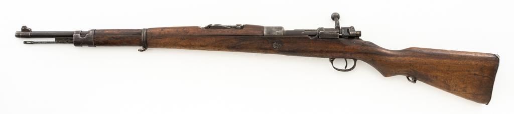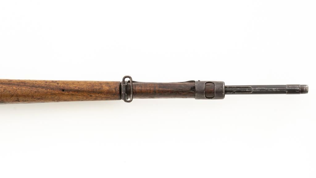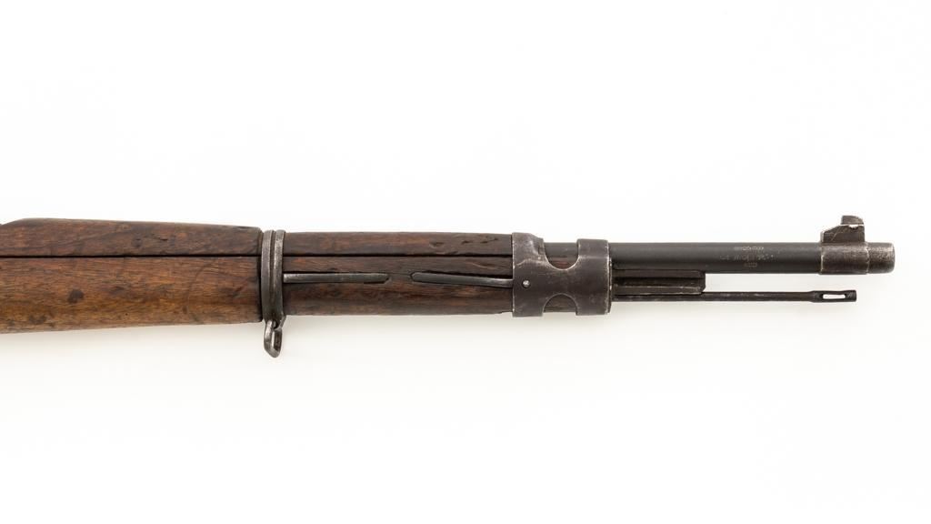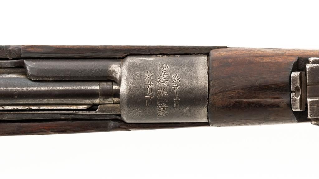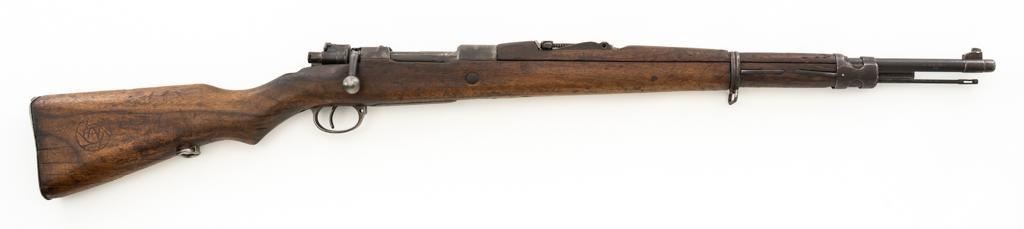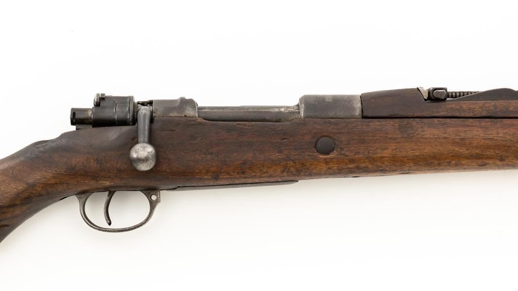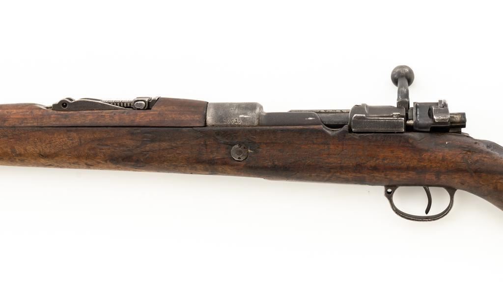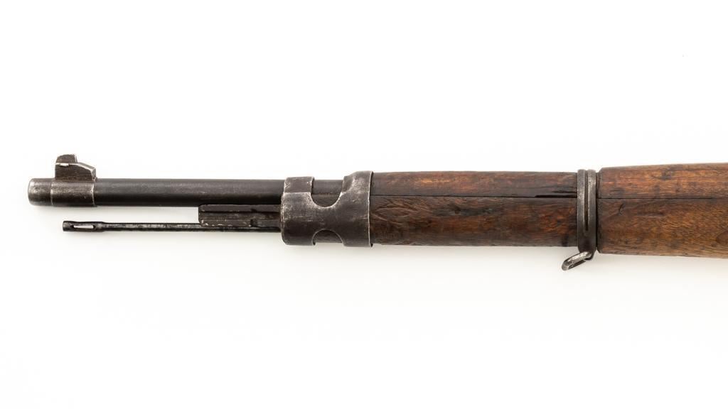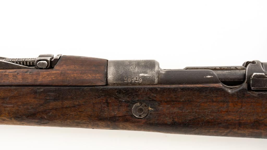Chinese Model 21 Mauser Bolt Action Short Rifle, #10719, 8mm cal., 23.6'' barrel, blue finish, hardwood stock and handguard, inverted-''V'' front sight, adjustable tangent rear sight with ''V''-notched groove, graduated to 2000 meters. Includes steel cleaning rod. Top of the receiver ring is marked with Chinese characters for Model 21 rifle; circular Chinese stamp on right side of the buttstock. Import marked on right side of the barrel. Metal shows evidence of cleaning and has a mostly dark patina. Wood is in poor condition and has numerous dents and scratches throughout, with several cracks at the toe, and crack on top of the wrist. Action functions well. Bore is dark, frosted, and in poor condition; rifling is visible. Est.: $200-$300. (C&R/PPT)