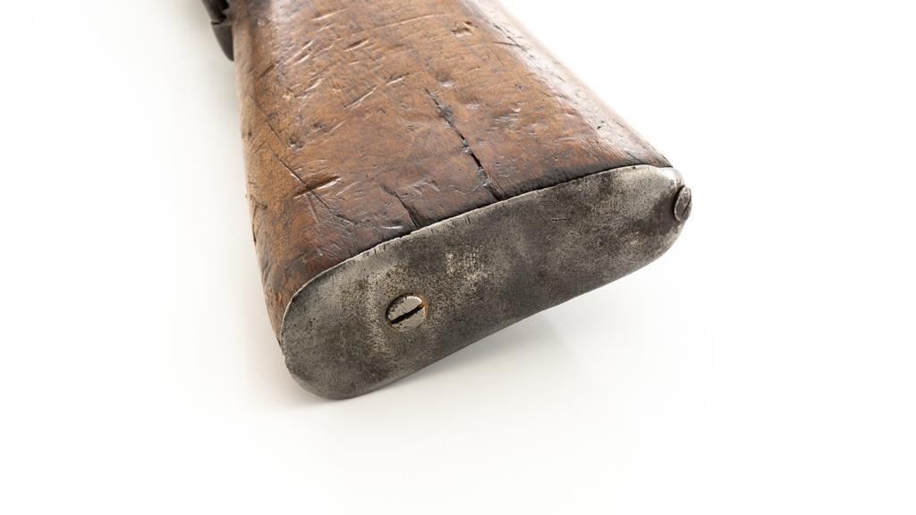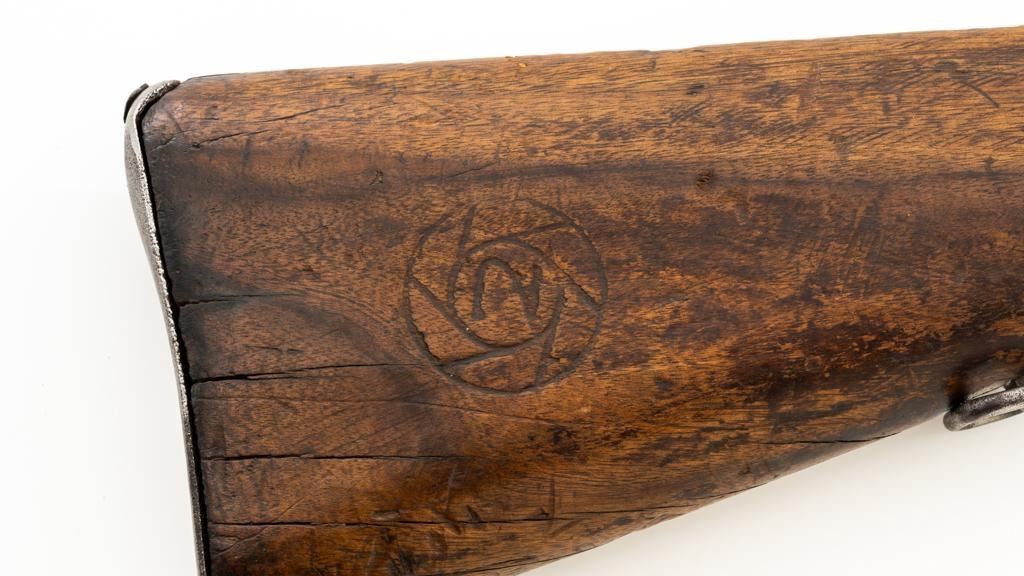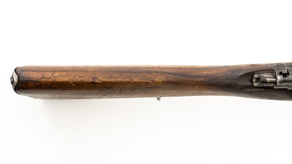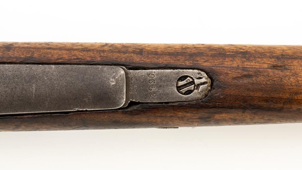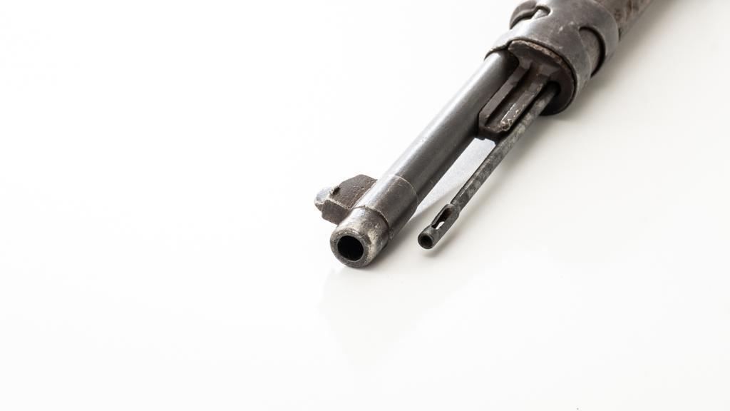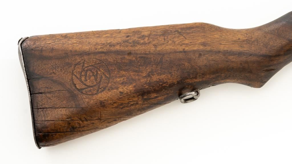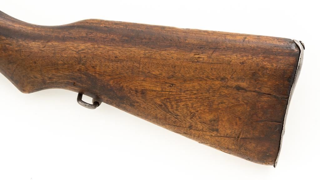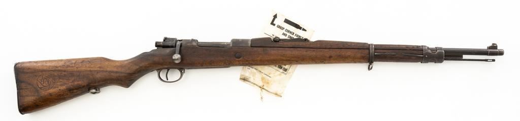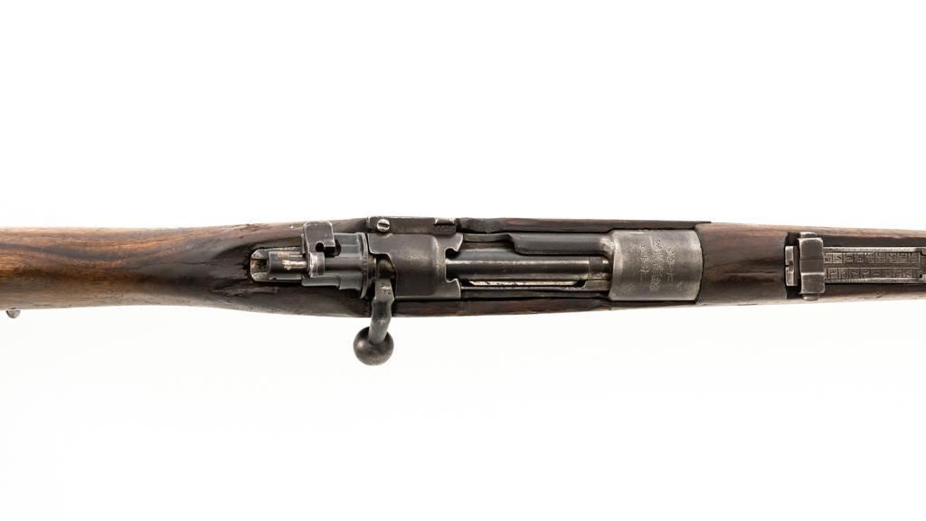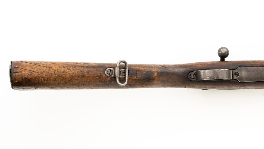 Chinese Model 21 Mauser Bolt Action Short Rifle, #10719, 8mm cal., 23.6'' barrel, blue finish, hardwood stock and handguard, inverted-''V'' front sight, adjustable tangent rear sight with ''V''-notched groove, graduated to 2000 meters. Includes steel cleaning rod. Top of the receiver ring is marked with Chinese characters for Model 21 rifle; circular Chinese stamp on right side of the buttstock. Import marked on right side of the barrel. Metal shows evidence of cleaning and has a mostly dark patina. Wood is in poor condition and has numerous dents and scratches throughout, with several cracks at the toe, and crack on top of the wrist. Action functions well. Bore is dark, frosted, and in poor condition; rifling is visible. Est.: $200-$300. (C&R/PPT)