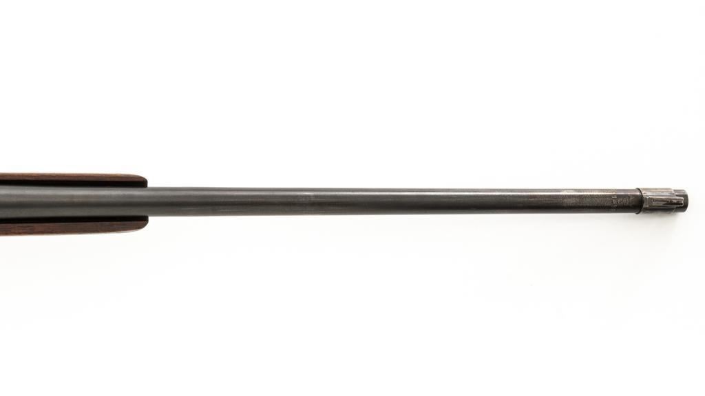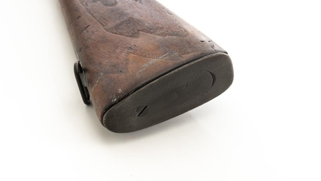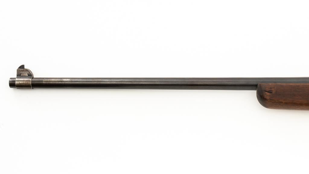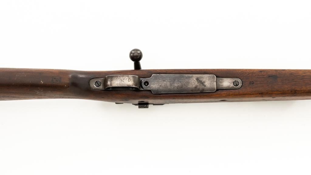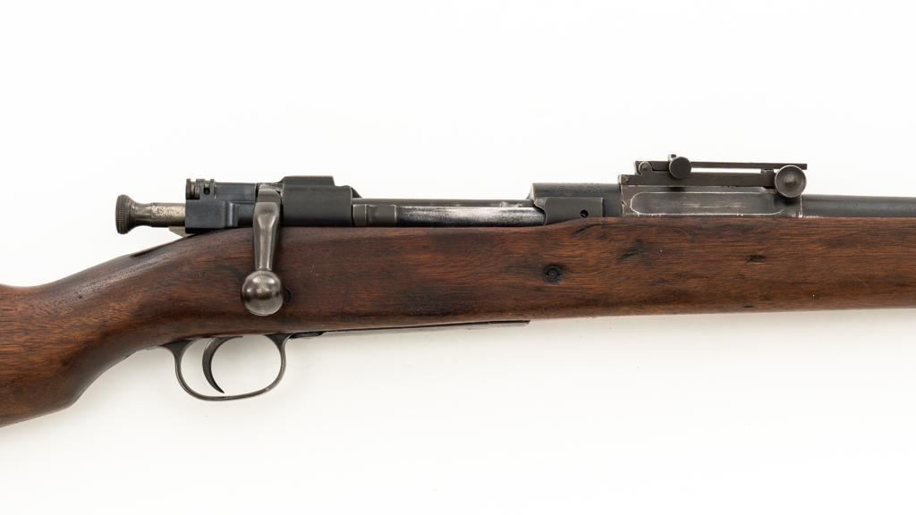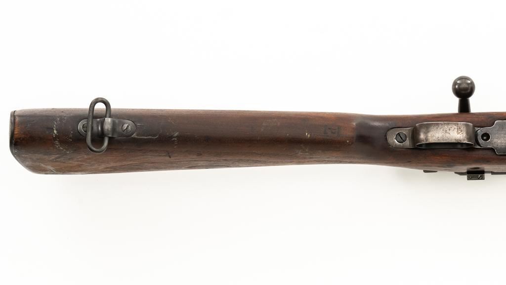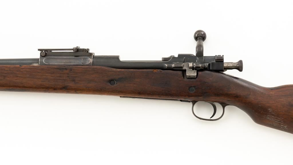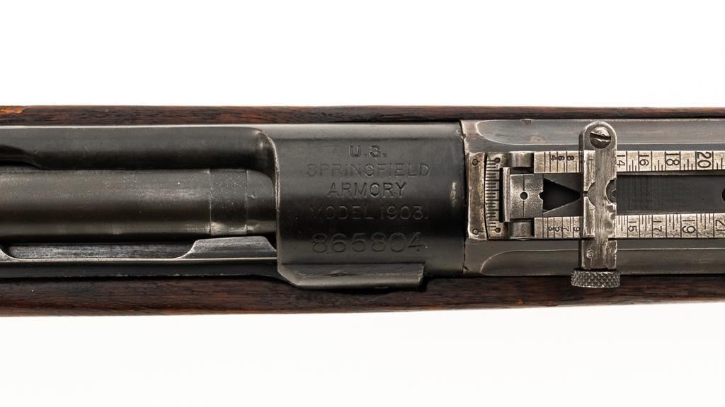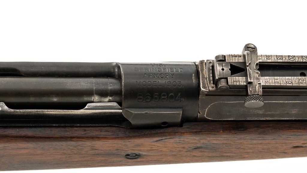 Springfield Armory U.S. Model 1903 Bolt Action Rifle, #865804, .30-06 cal., 24'' barrel, blued finish, walnut stock, blade front sight, and model 1905 ''U''-notch adjustable rear sight. Receiver is marked ''U.S./SPRINGFIELD/ARMORY/MODEL 1903/865804''. Avis barrel is marked ''AV/Flaming Bomb/11-18''. Rifle is in good overall condition. Finish on the receiver and barrel is approx. 75%-80% thinning and toning blue, with wear on the front sight. Checkered buttplate is like new but the trigger housing is lacking finish. Scant stock has a boxed ''P'' at the scant grip but was cut near the barrel band area so the handguard and associated parts are missing. Action works properly. Bore is very good with sharp rifling. No visible import marks. Est.: $500-$800. (C&R)