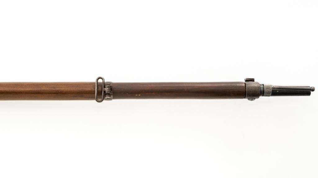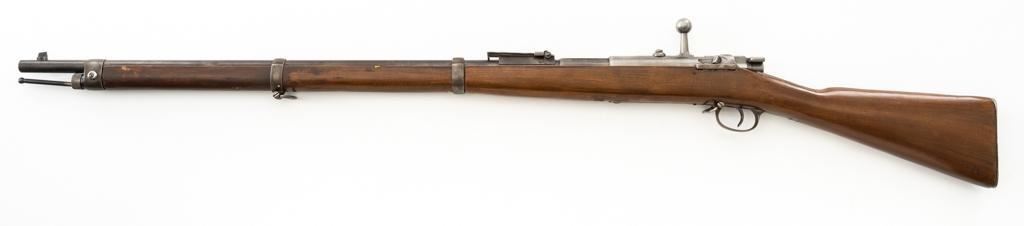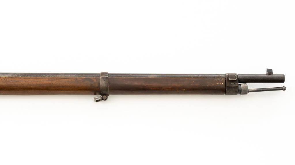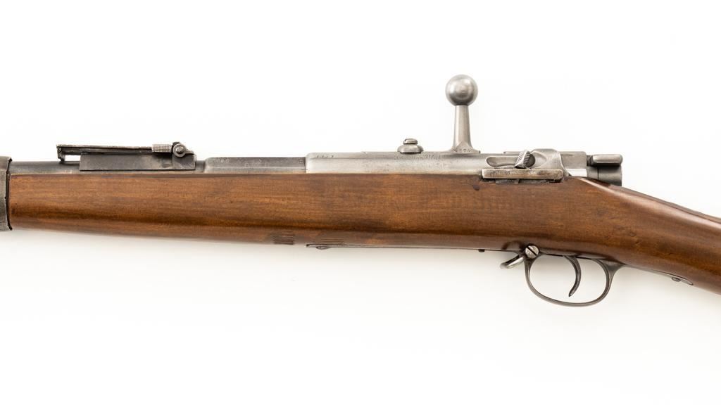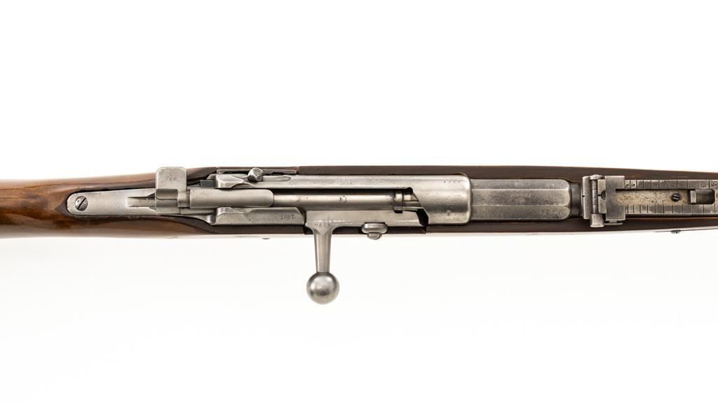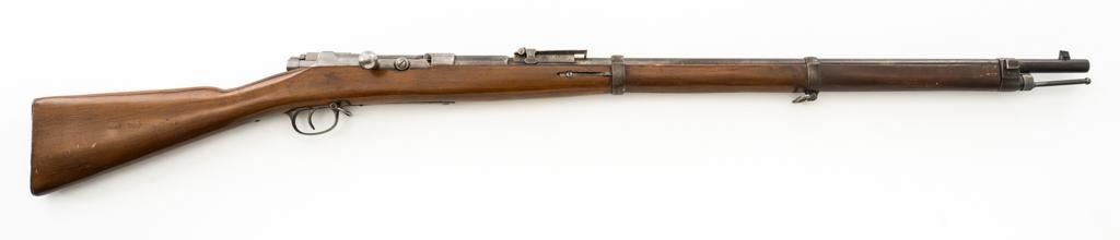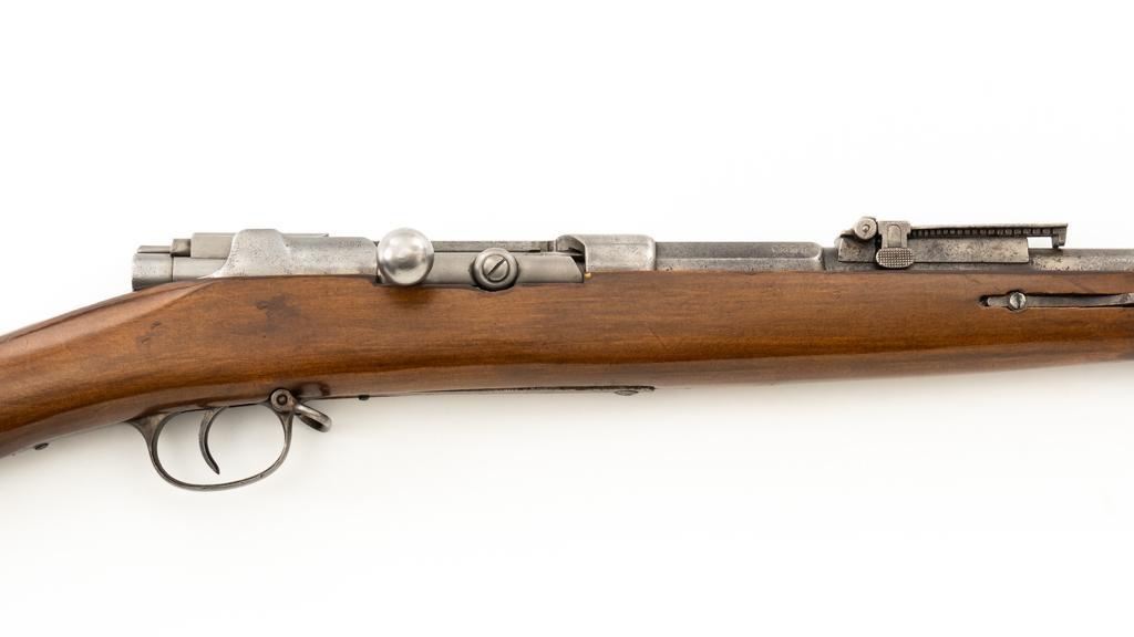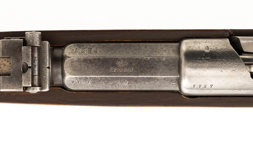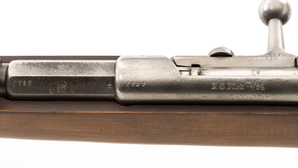 German GEW 71/84 Mauser Bolt Action Rifle, #7727, 11mm Mauser cal., 31.5'' barrel, bright finish, hardwood stock, dovetailed inverted-''V'' front sight, and adjustable folding leaf rear sight with ''V'' notches, graduated to 1600 meters. Left side of the receiver is marked ''I.G.Mod.71/84'', and the right side with ''1887'' production date. Top of the barrel shank is marked ''(Crown)SPANDAU'' and the left side with a ''(Crown)F.W.''. There are crowned inspection stamps on the right side of the receiver and barrel; faint acceptance stamps on the right and underside of the buttstock. Matching number on the barrel; other numbers do not match. Metal surfaces rate fair and have been cleaned, removing the finish, now showing areas of light pitting to the receiver, barrel, and buttplate. Stock has had a coat of brown varnish applied, now in very good condition, with a few small chips and an area of impressions to the underside of the forend. Action is a little stiff but functions correctly. Bore rates fair with areas of pitting and fair to good rifling. Est.: $400-$600. (Antique)