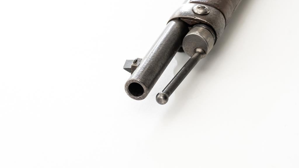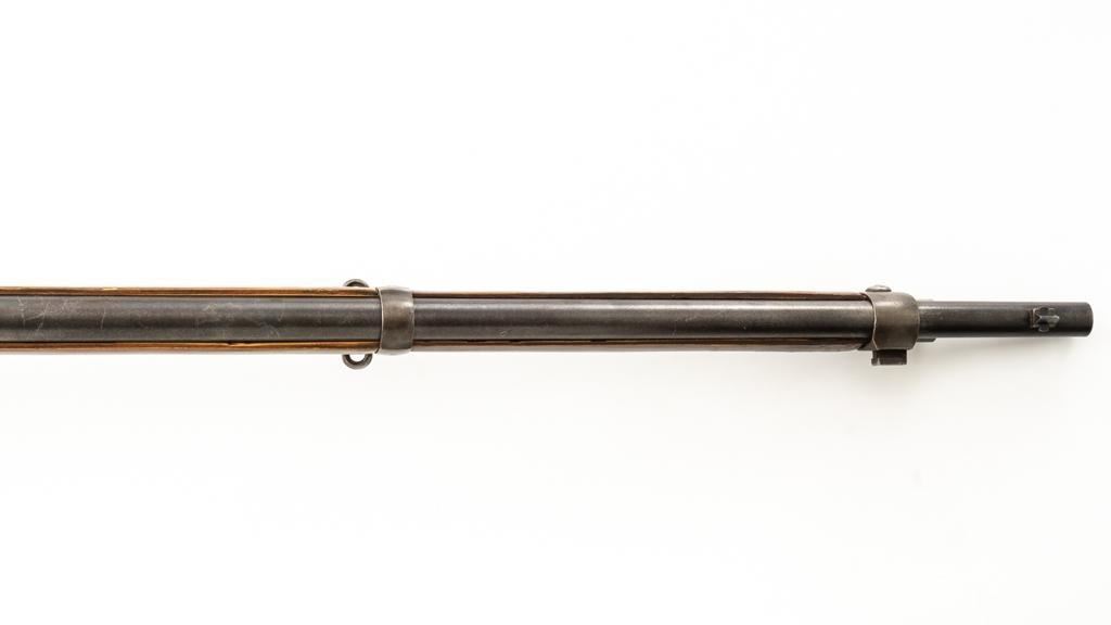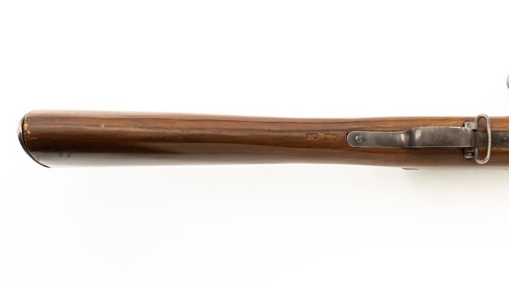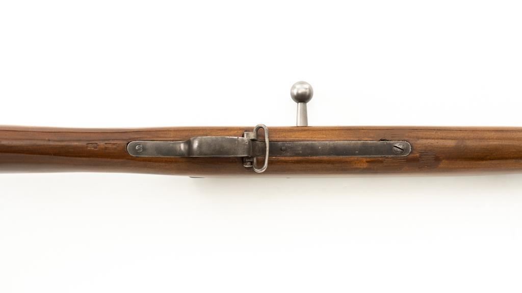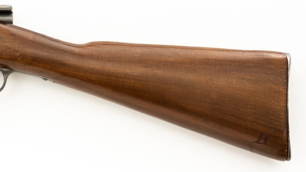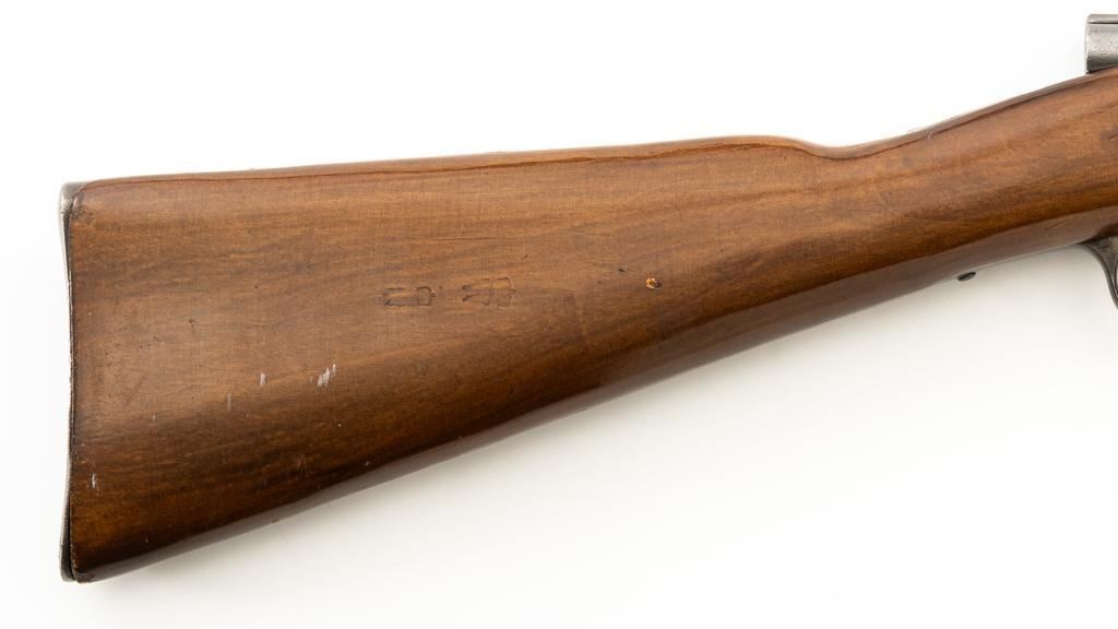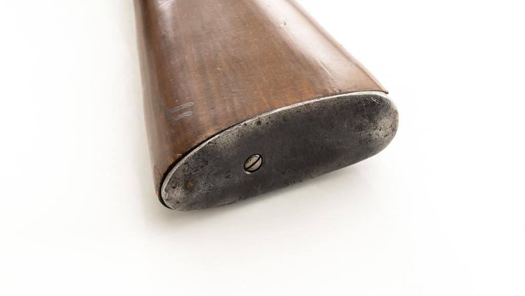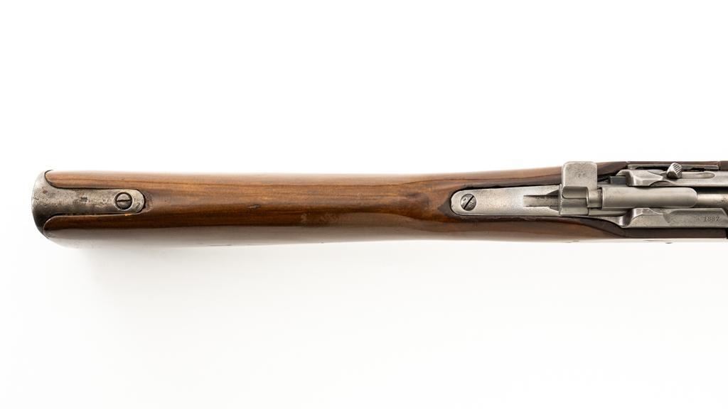 German GEW 71/84 Mauser Bolt Action Rifle, #7727, 11mm Mauser cal., 31.5'' barrel, bright finish, hardwood stock, dovetailed inverted-''V'' front sight, and adjustable folding leaf rear sight with ''V'' notches, graduated to 1600 meters. Left side of the receiver is marked ''I.G.Mod.71/84'', and the right side with ''1887'' production date. Top of the barrel shank is marked ''(Crown)SPANDAU'' and the left side with a ''(Crown)F.W.''. There are crowned inspection stamps on the right side of the receiver and barrel; faint acceptance stamps on the right and underside of the buttstock. Matching number on the barrel; other numbers do not match. Metal surfaces rate fair and have been cleaned, removing the finish, now showing areas of light pitting to the receiver, barrel, and buttplate. Stock has had a coat of brown varnish applied, now in very good condition, with a few small chips and an area of impressions to the underside of the forend. Action is a little stiff but functions correctly. Bore rates fair with areas of pitting and fair to good rifling. Est.: $400-$600. (Antique)