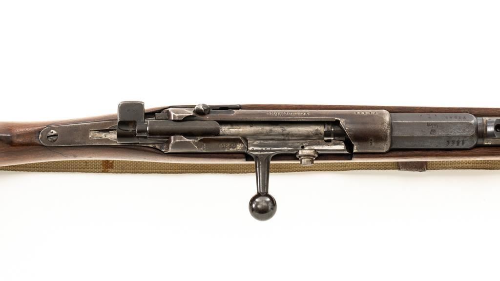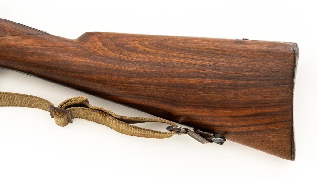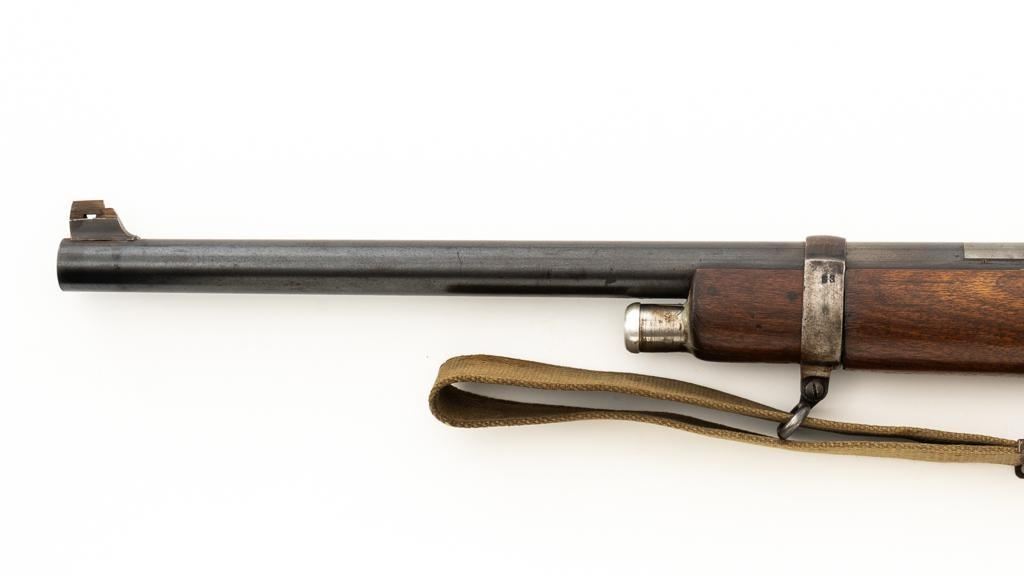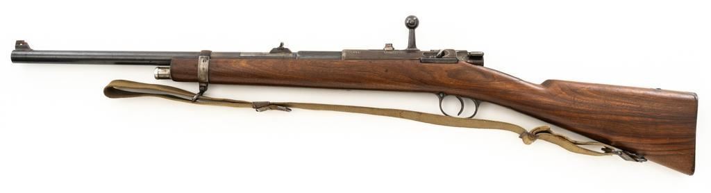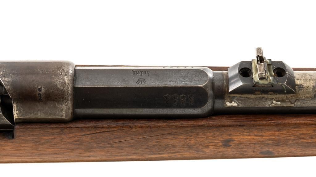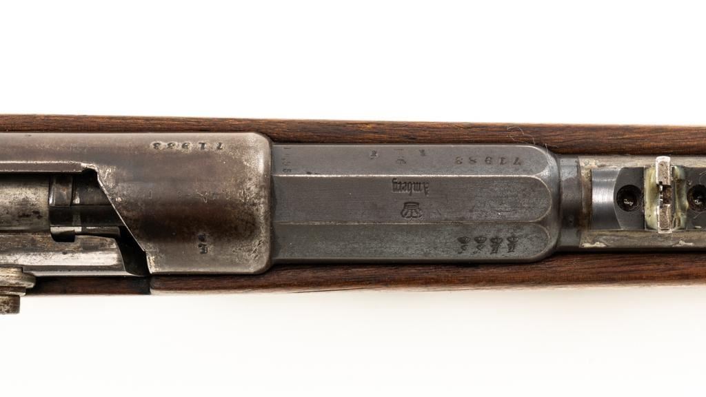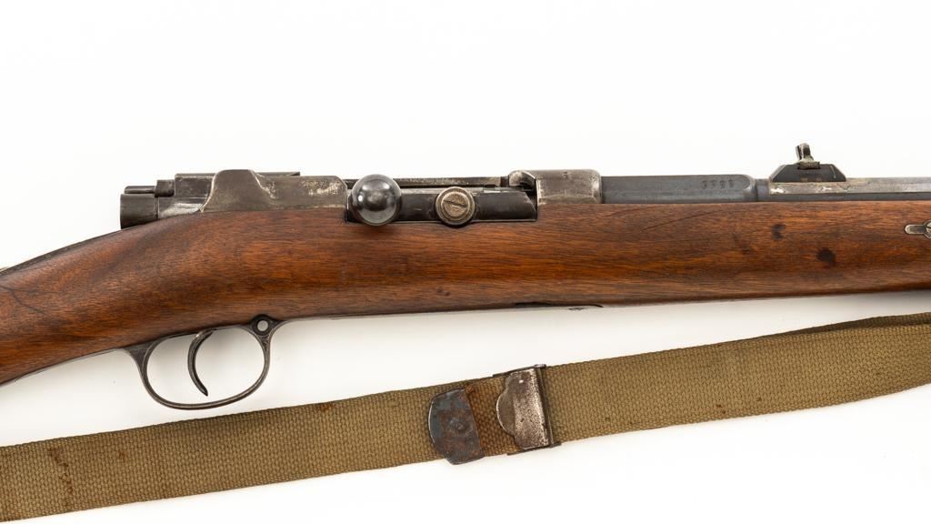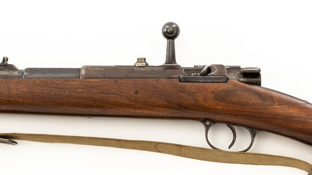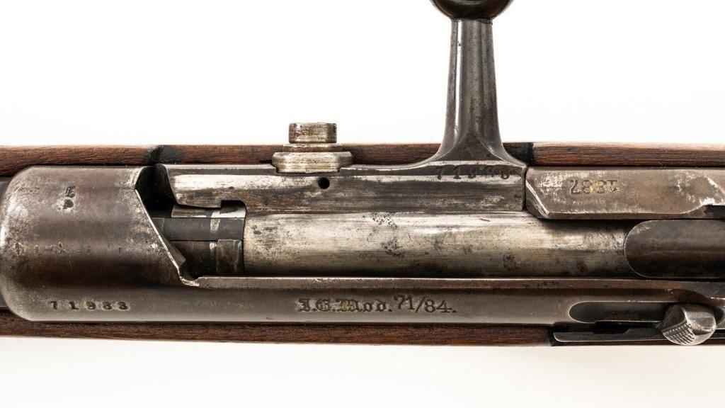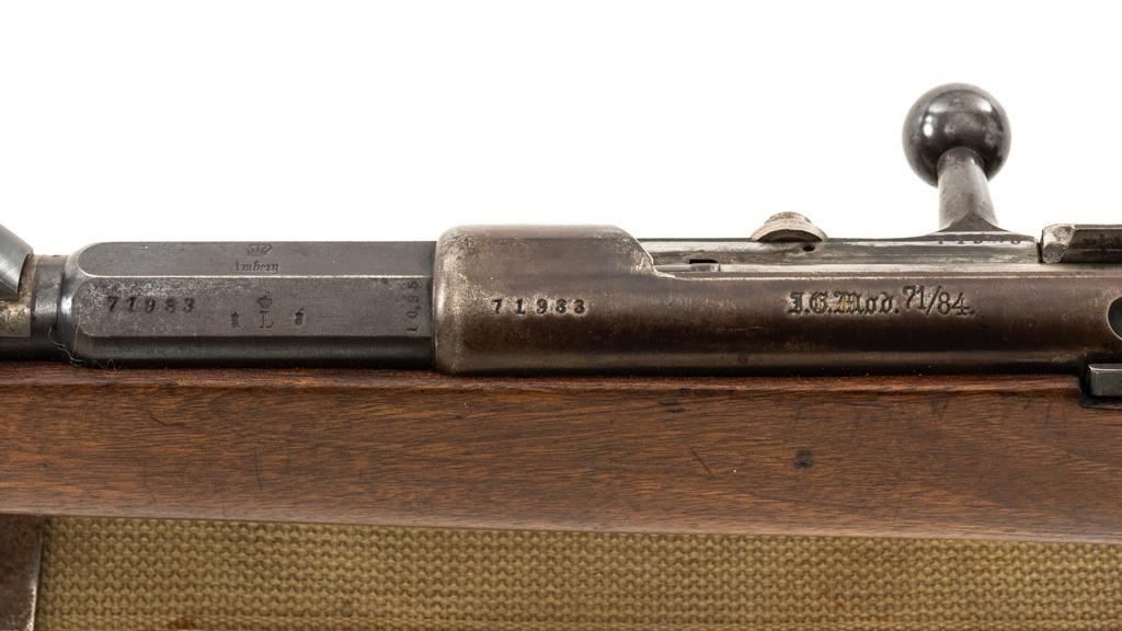 Modified Antique German GEW 71/84 Mauser Bolt Action Rifle, #71983, 11mm Mauser cal., 19.75'' barrel, blued finish, with straight grip hardwood stock. The original sights have been removed, now fitted with a blade on ramp front sight and a fixed leaf rear sight with ''U''-notched groove. Includes a U.S. M1 cotton sling, in good used condition. Rifle has been modified by shortening the barrel, magazine, stock, and removing the associated military hardware. Left side of the receiver is marked ''I.G. Mod. 71/84.'', and the right side with ''1887'' production date. Top of the barrel shank is marked ''(crown)Amberg'' and the left side with a ''(crown)L''. There are crowned inspection stamps on right side of the receiver and barrel. Matching visible numbers. There are no markings visible on the stock. Condition overall is good as modified, the metal parts have a mostly dark patina, mixed with blue finish. Wood is fair, stain has been applied, and the wrist has been reshaped and has fine cracks on both sides. Action functions well. Bore has some spots of visible patina, rifling is good. Est.: $300-$400. (Antique)