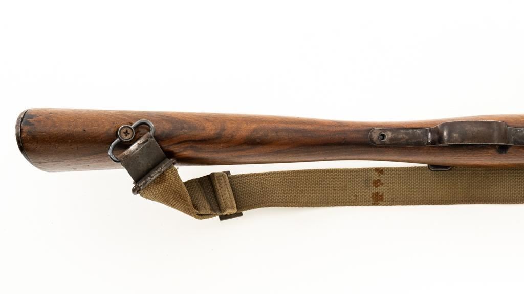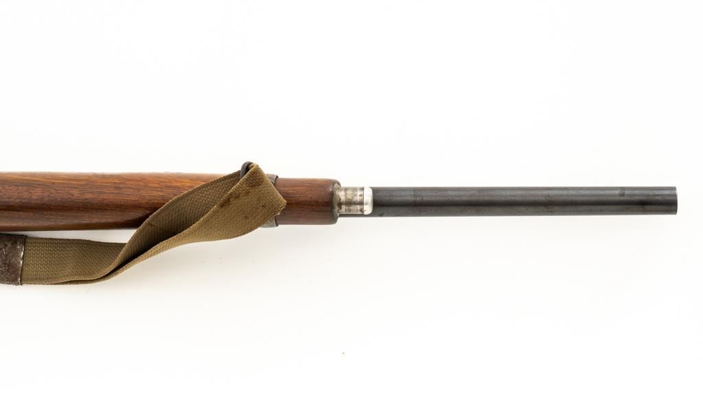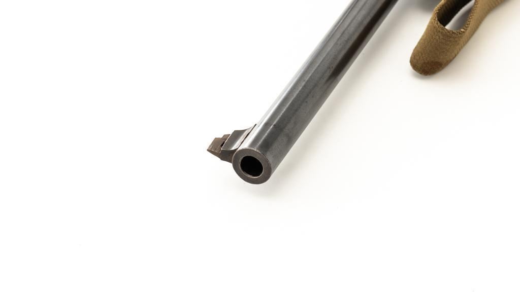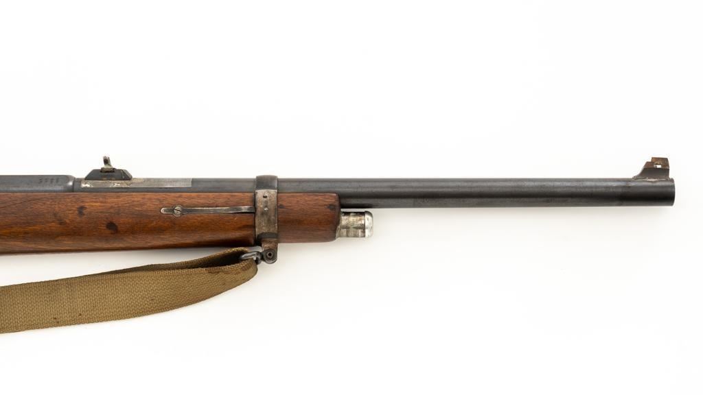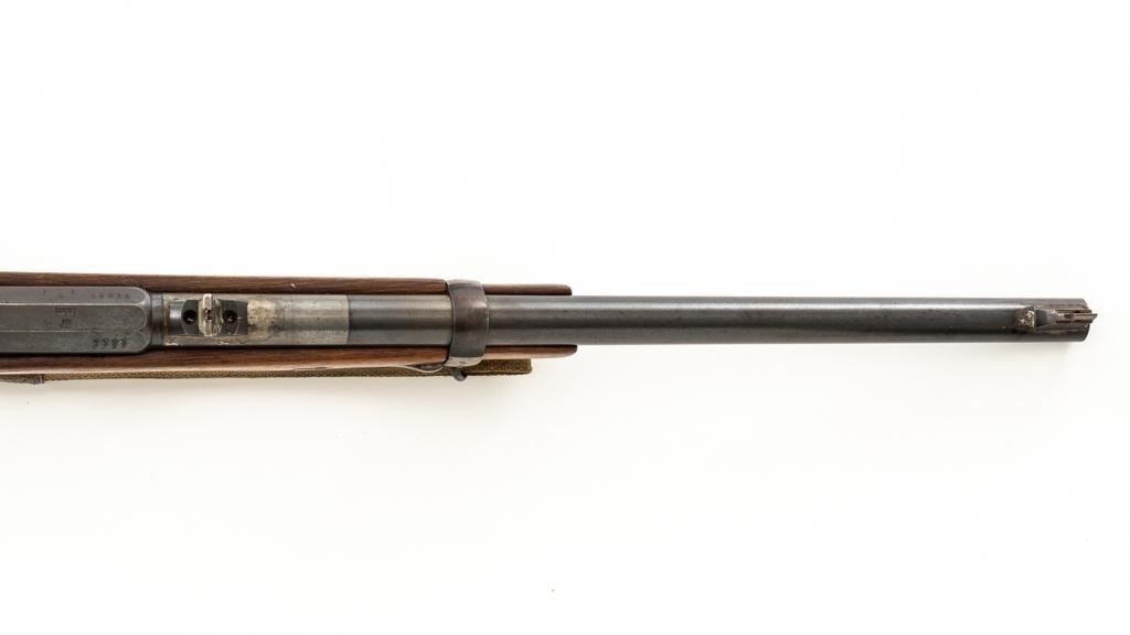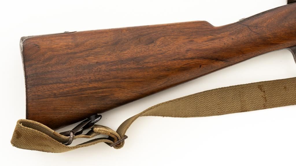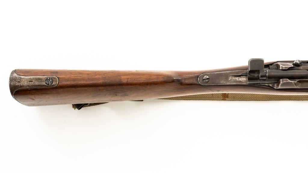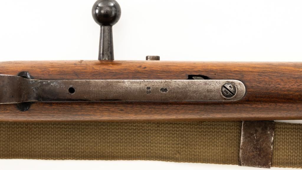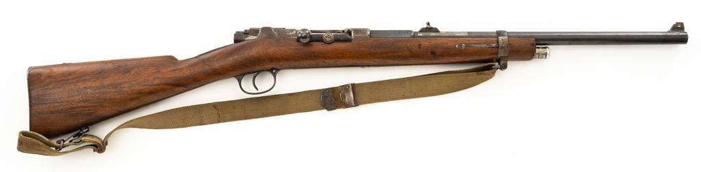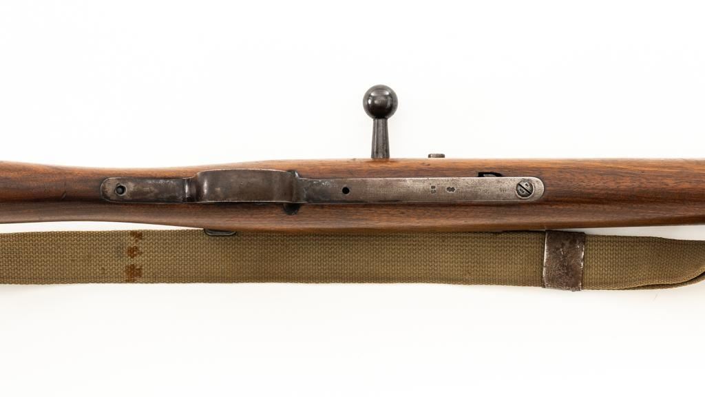Modified Antique German GEW 71/84 Mauser Bolt Action Rifle, #71983, 11mm Mauser cal., 19.75'' barrel, blued finish, with straight grip hardwood stock. The original sights have been removed, now fitted with a blade on ramp front sight and a fixed leaf rear sight with ''U''-notched groove. Includes a U.S. M1 cotton sling, in good used condition. Rifle has been modified by shortening the barrel, magazine, stock, and removing the associated military hardware. Left side of the receiver is marked ''I.G. Mod. 71/84.'', and the right side with ''1887'' production date. Top of the barrel shank is marked ''(crown)Amberg'' and the left side with a ''(crown)L''. There are crowned inspection stamps on right side of the receiver and barrel. Matching visible numbers. There are no markings visible on the stock. Condition overall is good as modified, the metal parts have a mostly dark patina, mixed with blue finish. Wood is fair, stain has been applied, and the wrist has been reshaped and has fine cracks on both sides. Action functions well. Bore has some spots of visible patina, rifling is good. Est.: $300-$400. (Antique)