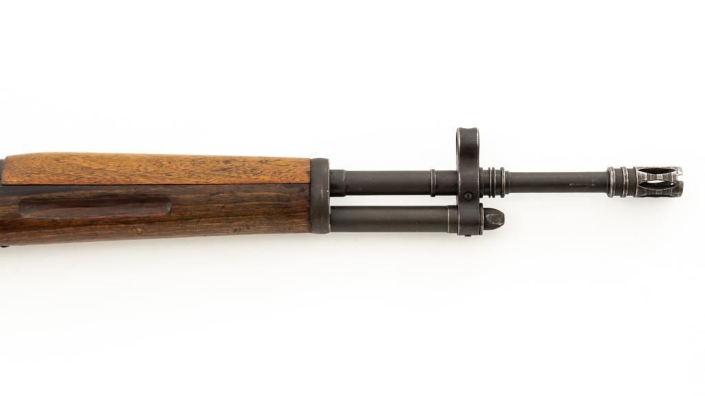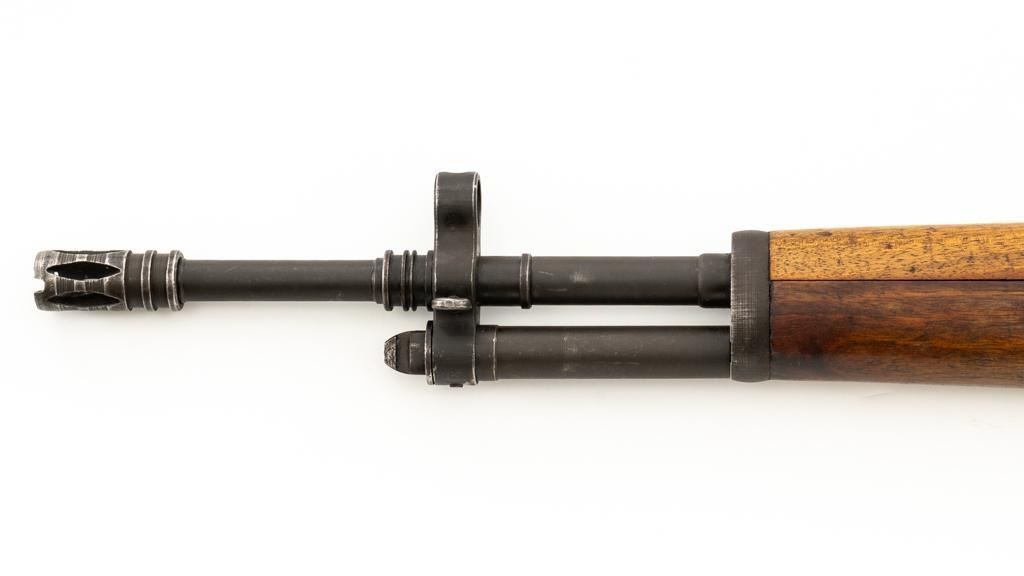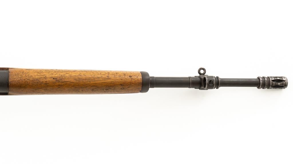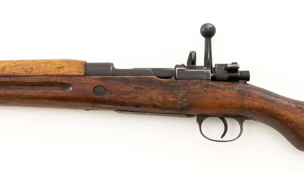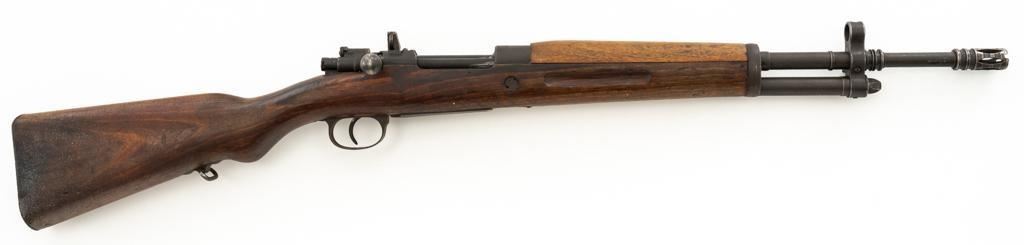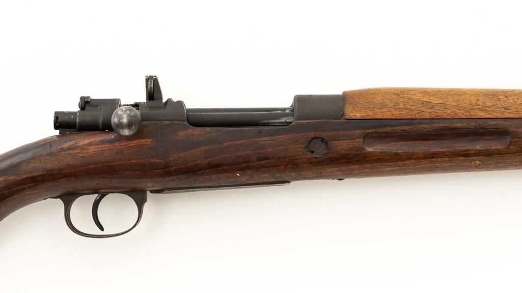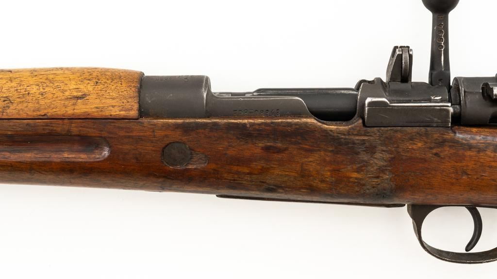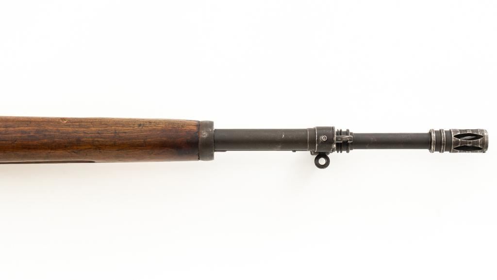 Spanish FR8 Mauser Bolt Action Rifle, #08948, 7.62x51mm cal., 19.5'' barrel with muzzle device, phosphate finish, hardwood stock and handguard, hooded post front sight, and adjustable diopter rear sight with ''V''-notch and apertures. Rifle was arsenal converted from a Model 1943 Mauser and is marked with the original ''FABRICA DE ARMAS/(Spanish crest)/LA CORUNA/1954'' on top of the receiver ring. Left side of the receiver rail is marked ''FR8-08948''; ''CAL 762'' on the right side. Matching numbered bolt. Import marked on right side of the barrel. Condition overall is very good, showing mild toning to the metal, retaining approx. 85% finish. Wear to the muzzle device and buttplate accounts for much of the finish loss. Wood with general dents and scratches, heavier on the left side below the receiver, and there is some light paint over spray on the buttstock. Action operates smoothly. Bore is bright with very good, defined rifling. Est.: $450-$650. (C&R/PPT)