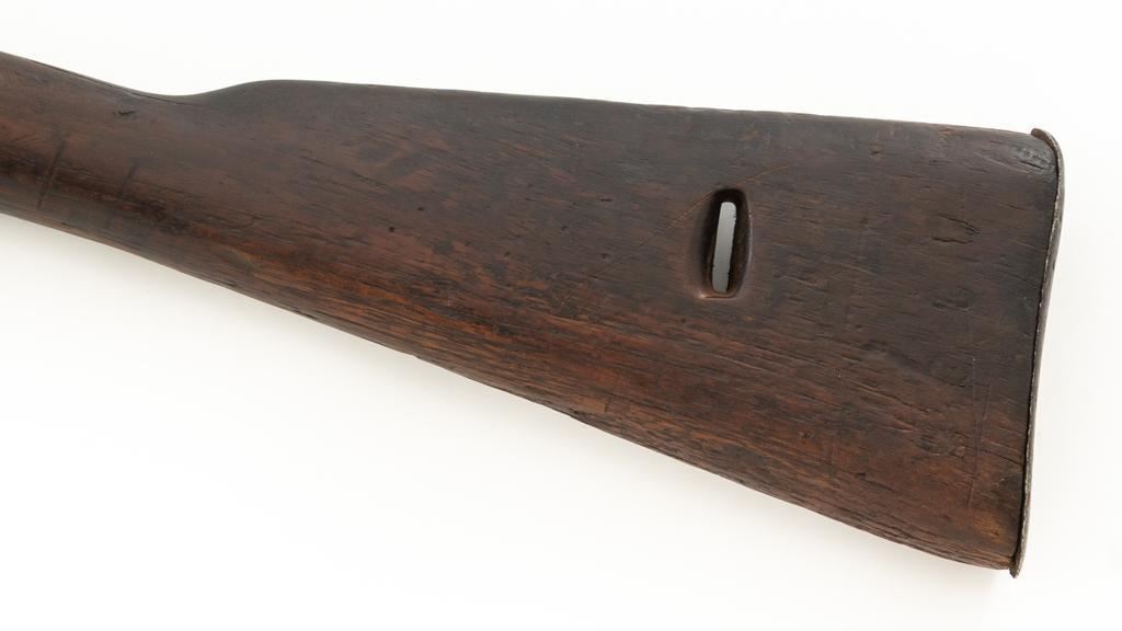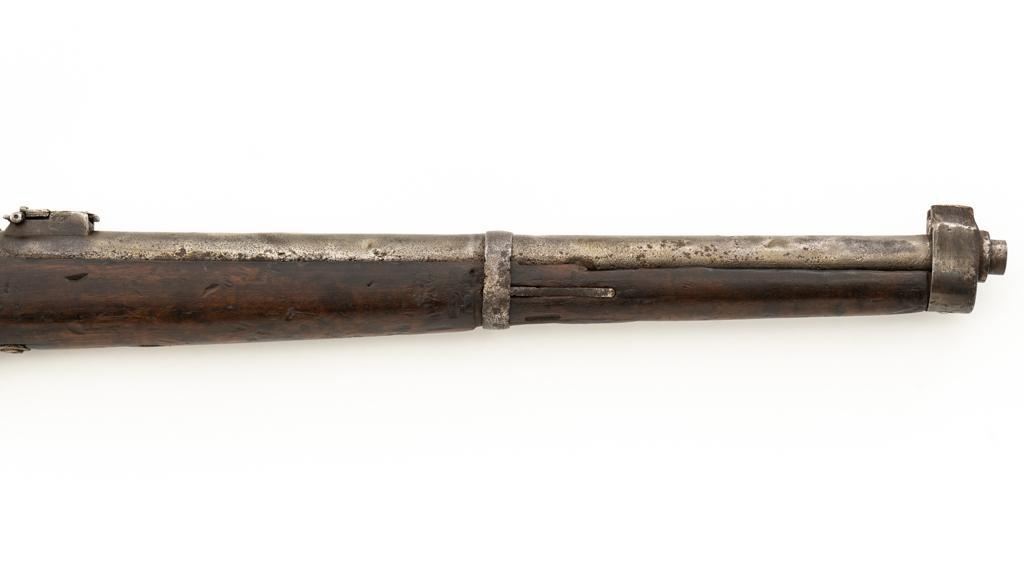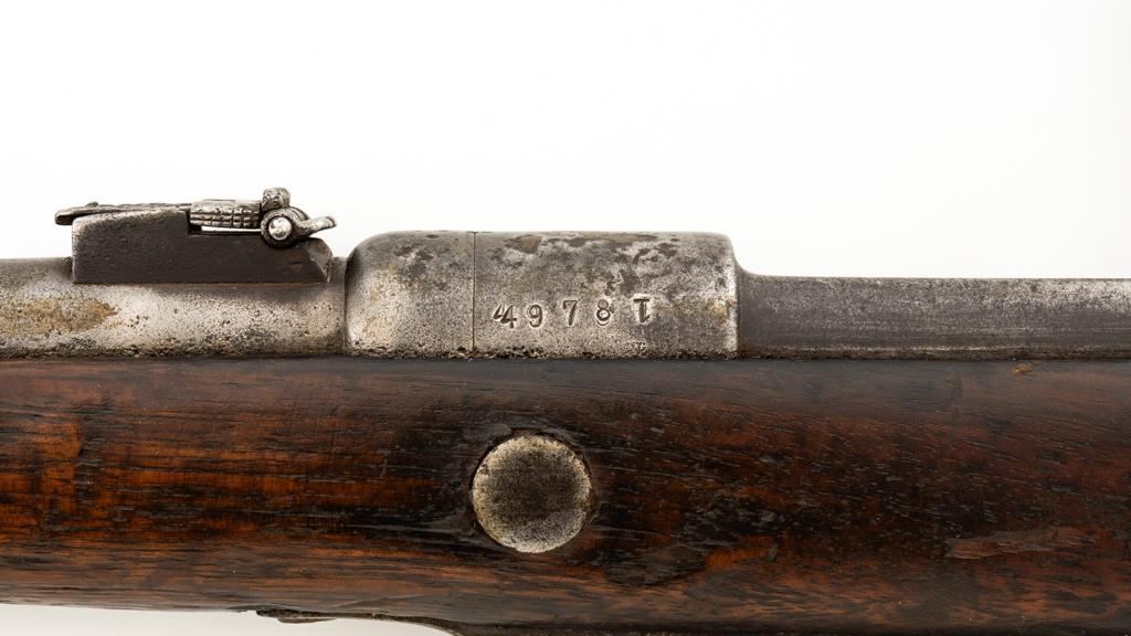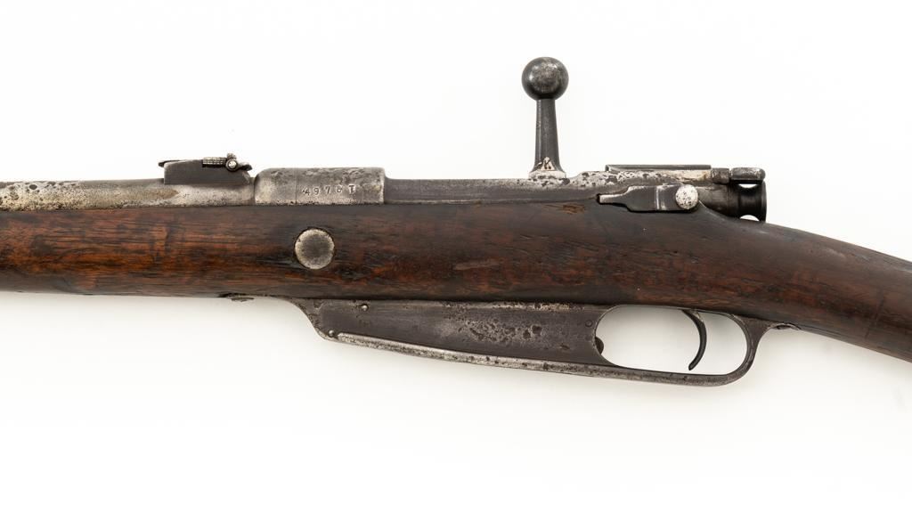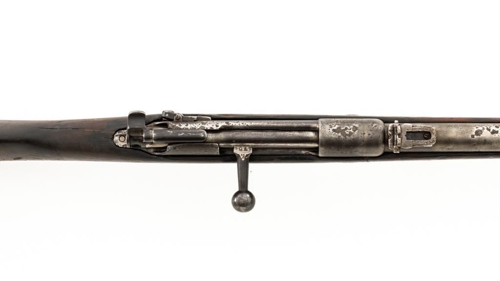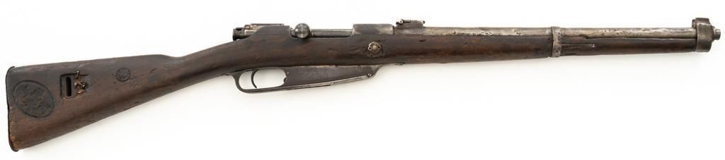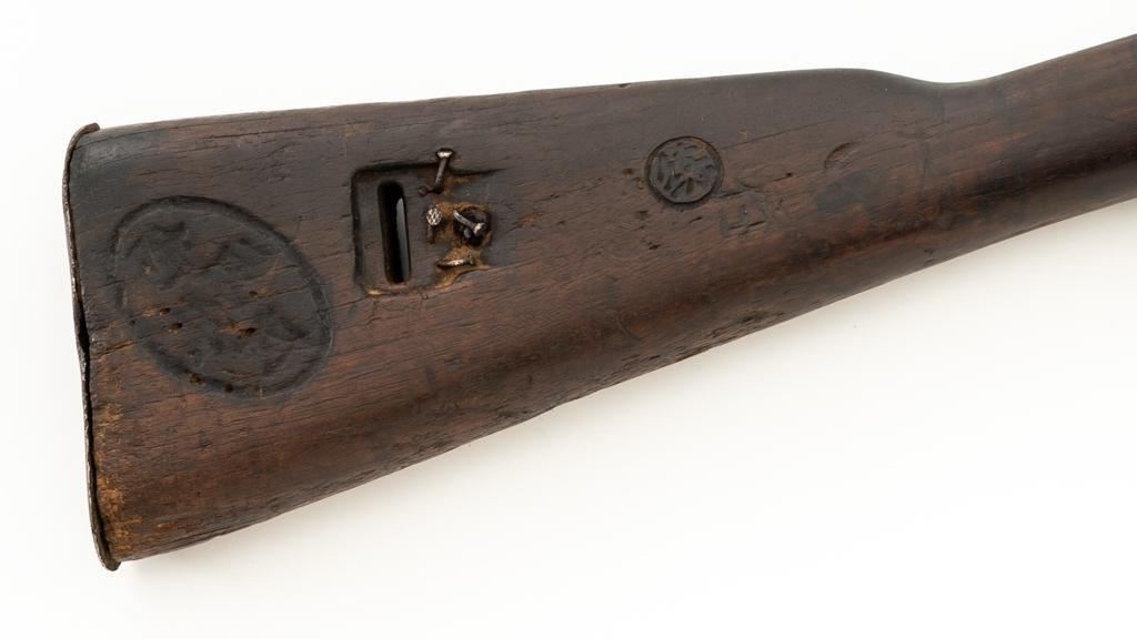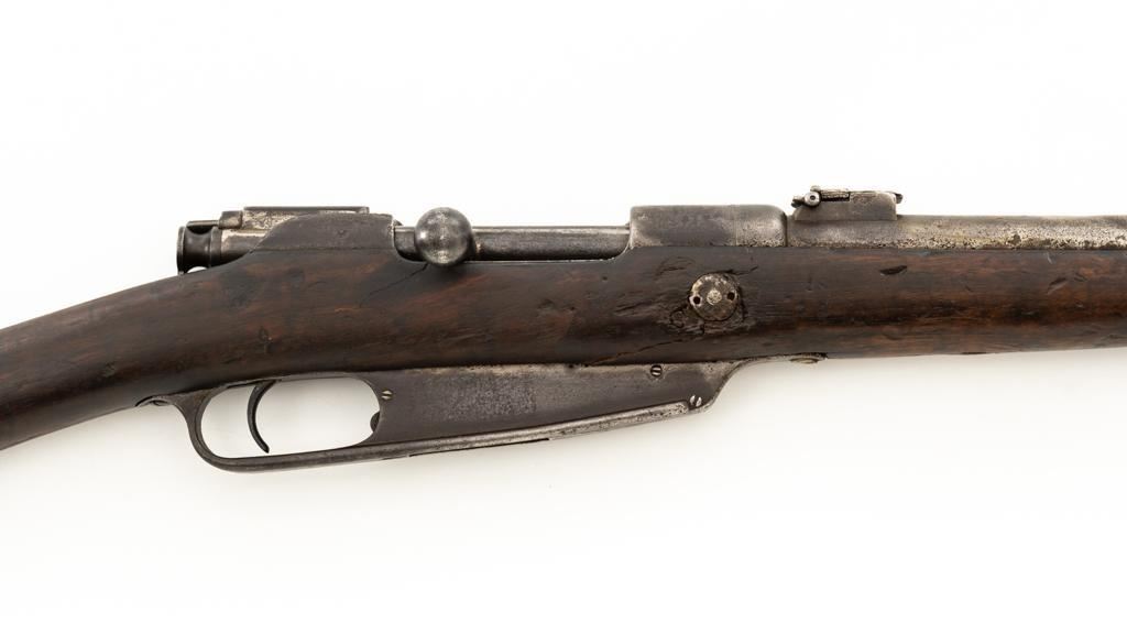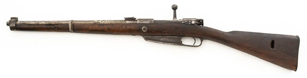 Chinese Hanyang 88 Bolt Action Carbine, #49781, 8x57mm cal., 18.25'' barrel, blued finish, straight grip hardwood stock, blade front sight with protectors, and adjustable folding leaf rear sight with ''U'' notch, graduated to 1200 meters. The only markings on the receiver are the serial number. Right side of the buttstock is stamped with two sets of large Chinese characters. Numbers do not match. Condition overall is poor, showing cleaning to the metal, and several areas of considerable erosion to the receiver and barrel jacket. Stock is cracked at the top of the wrist and right side near the recoil bolt. Additionally, there are chips to the left edge of the forend, dents and scratches throughout. Action functions well. Bore is dark, with areas of erosion, and the rifling is barely visible. Est.: $100-$200. (Antique)