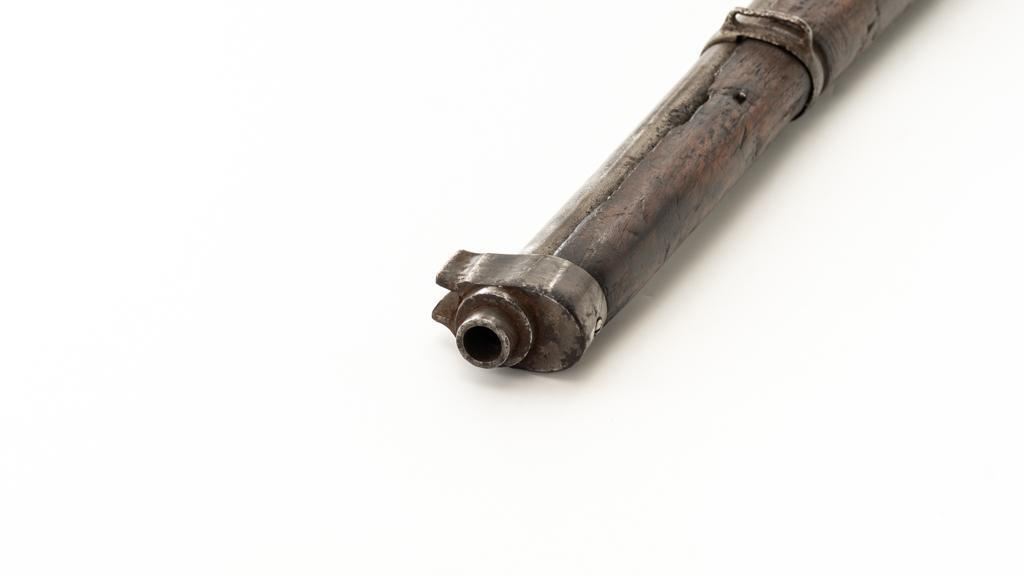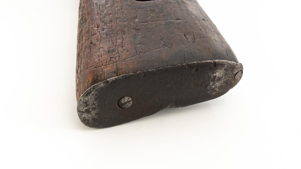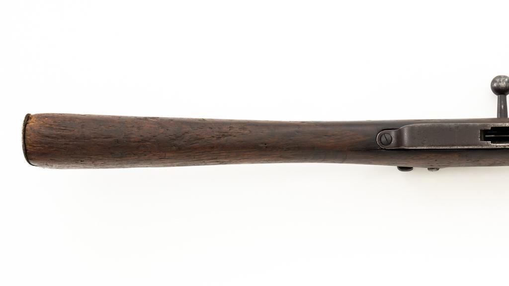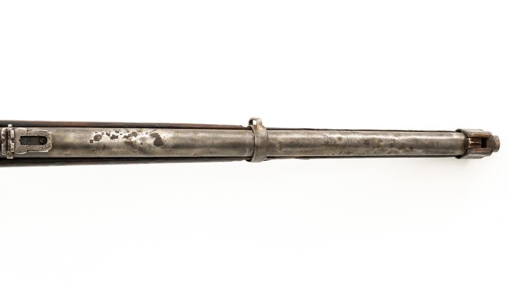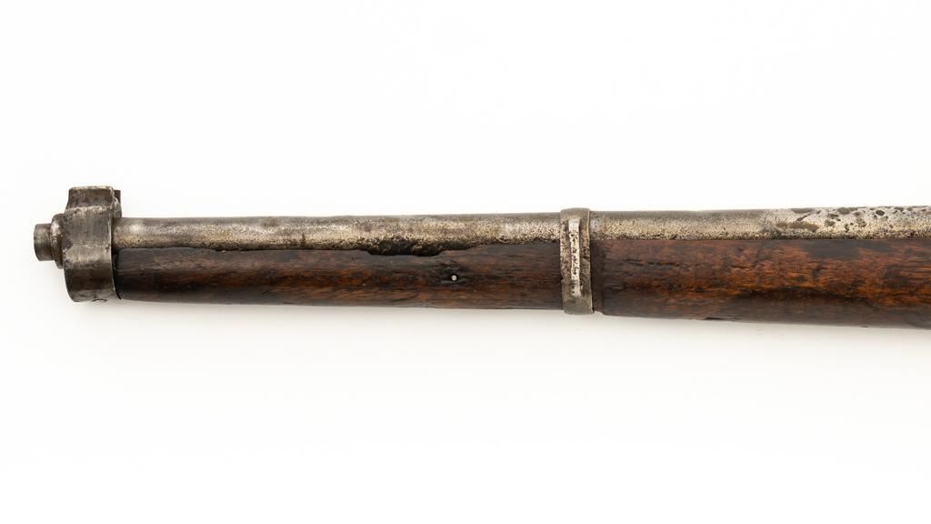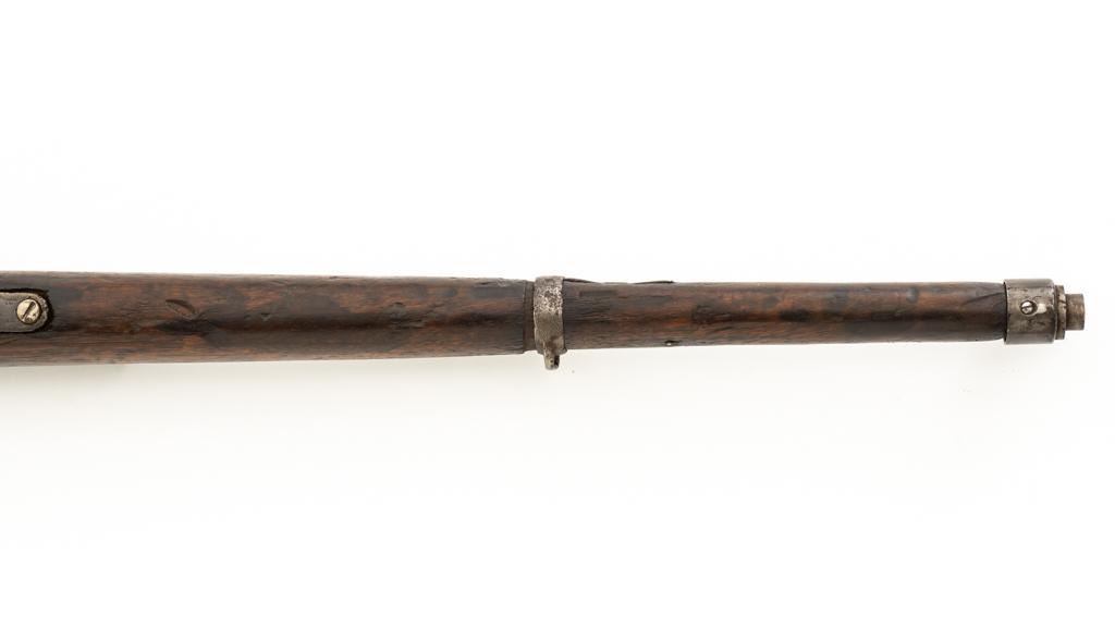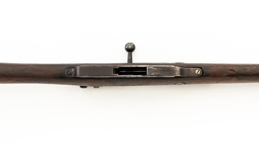 Chinese Hanyang 88 Bolt Action Carbine, #49781, 8x57mm cal., 18.25'' barrel, blued finish, straight grip hardwood stock, blade front sight with protectors, and adjustable folding leaf rear sight with ''U'' notch, graduated to 1200 meters. The only markings on the receiver are the serial number. Right side of the buttstock is stamped with two sets of large Chinese characters. Numbers do not match. Condition overall is poor, showing cleaning to the metal, and several areas of considerable erosion to the receiver and barrel jacket. Stock is cracked at the top of the wrist and right side near the recoil bolt. Additionally, there are chips to the left edge of the forend, dents and scratches throughout. Action functions well. Bore is dark, with areas of erosion, and the rifling is barely visible. Est.: $100-$200. (Antique)
