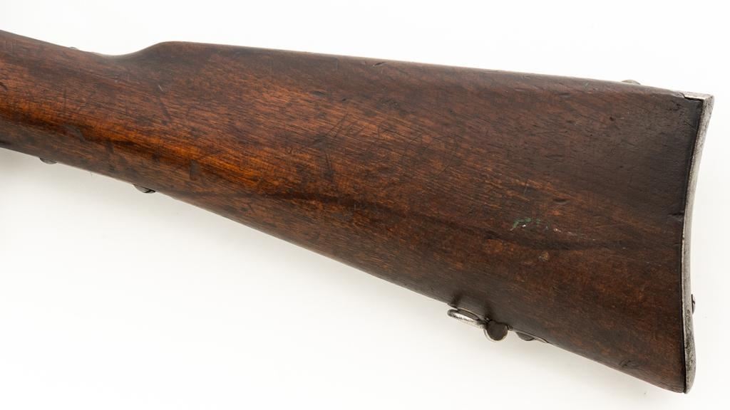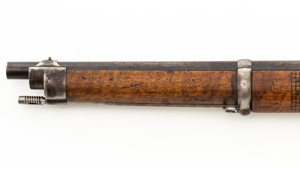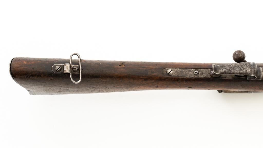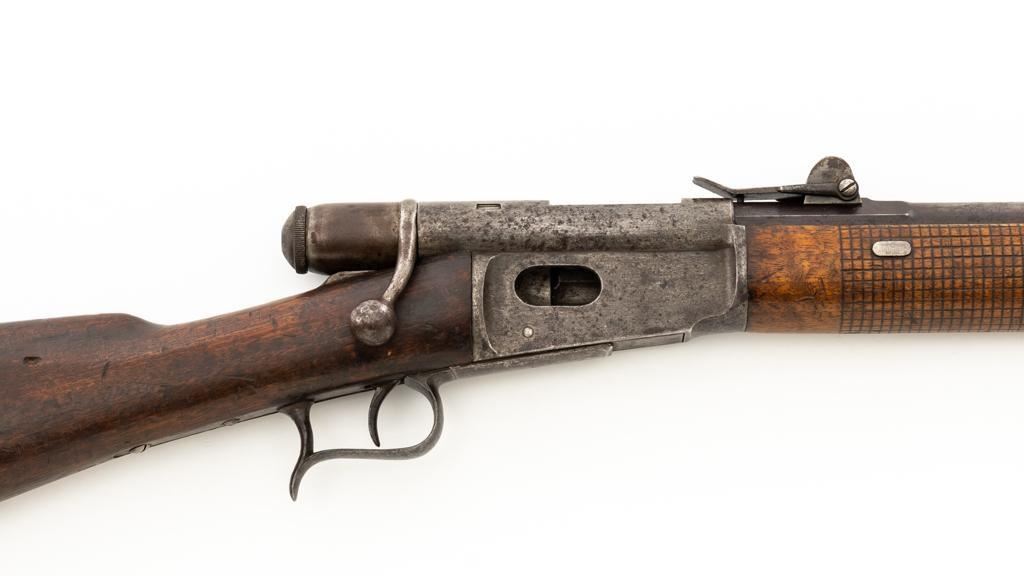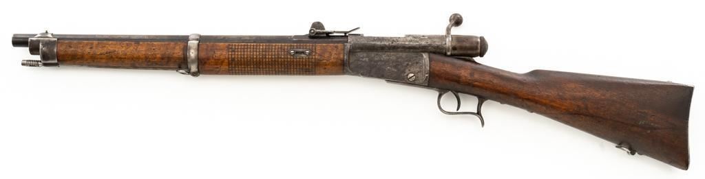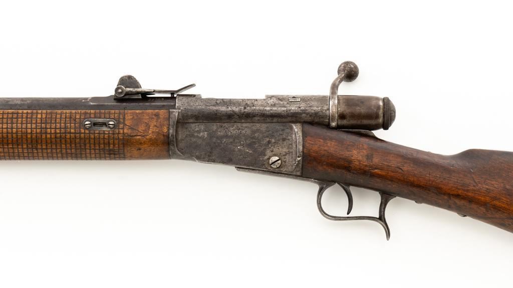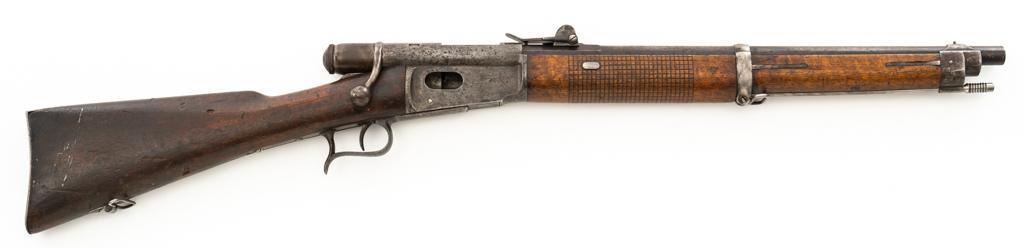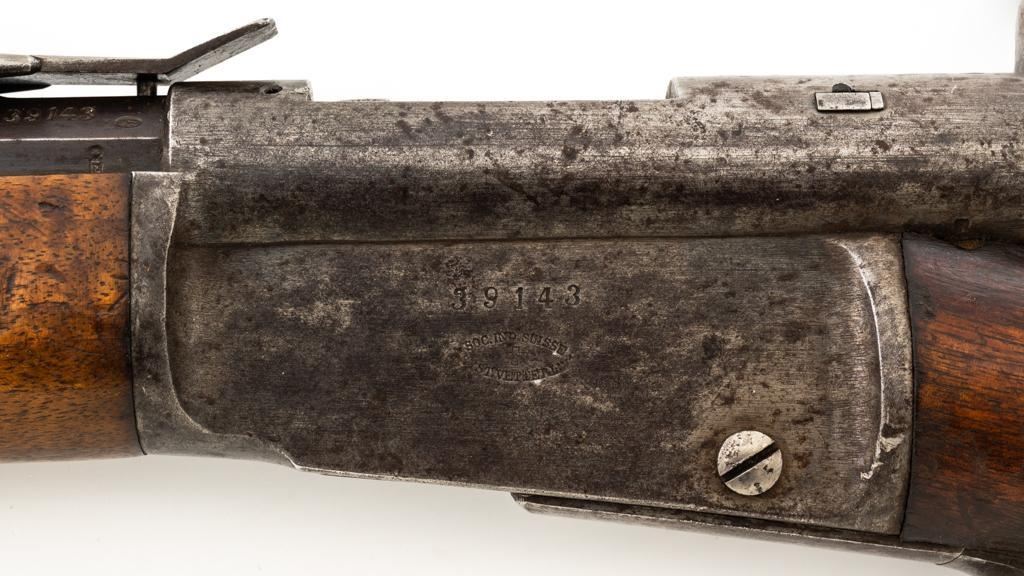Modified Swiss 1869/71 Vetterli Bolt Action Rifle, #39143, .41 Swiss RF cal., 19.4'' barrel, blued finish, hardwood stock with checkered forend, bead front sight, and adjustable leaf rear sight with ''U''-notch, graduated to 1000 meters. Includes shortened steel cleaning rod. Left side of the receiver is marked ''39143/SOC.IND.SUISSE(Swiss Cross)SYST.VETTERLI''. There is a Swiss cross over a Shield symbol stamped on right side of the buttstock. Bolt does not match. Rifle has been modified by shortening the barrel and forend; fitting a bead sight onto the front barrel band. Condition overall is good as modified; metal shows general wear and patina. Wood is good with bruises and handling marks scattered throughout. Initials have been lightly carved into left side of the buttstock. Action operates smoothly. Bore with an area of patina behind the muzzle; rifling is good. Est.: $200-$300. (Antique)