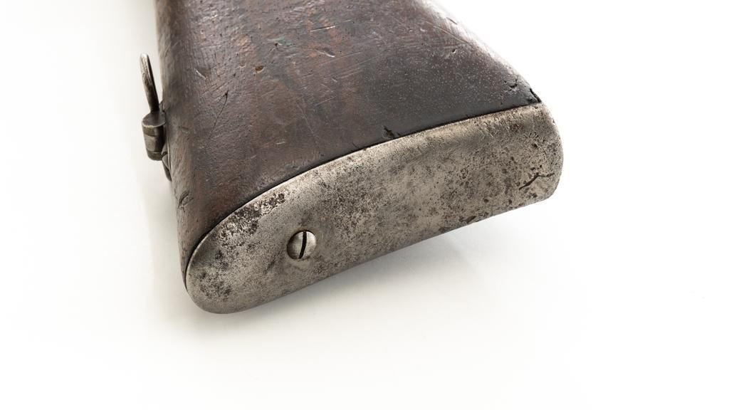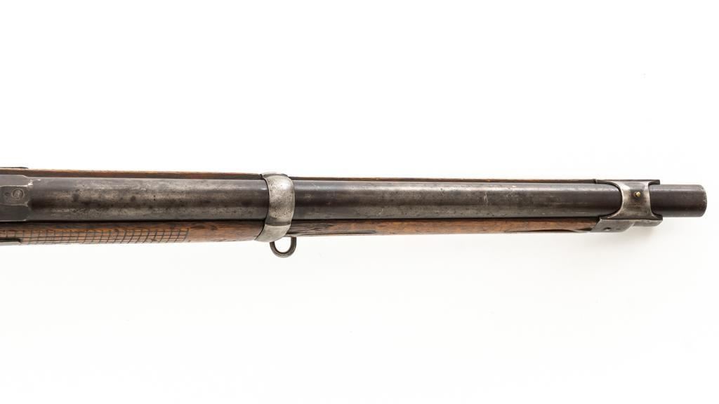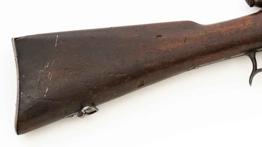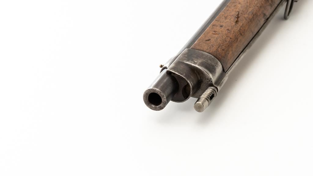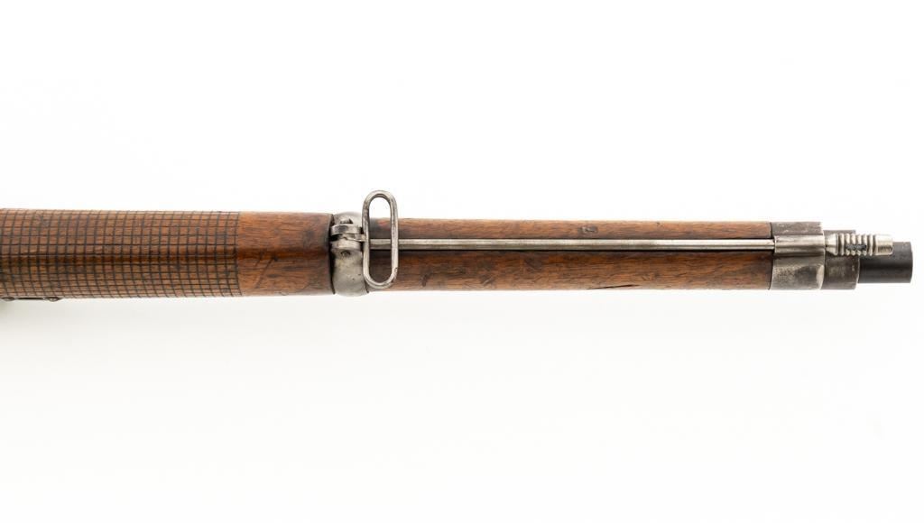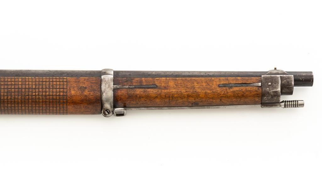 Modified Swiss 1869/71 Vetterli Bolt Action Rifle, #39143, .41 Swiss RF cal., 19.4'' barrel, blued finish, hardwood stock with checkered forend, bead front sight, and adjustable leaf rear sight with ''U''-notch, graduated to 1000 meters. Includes shortened steel cleaning rod. Left side of the receiver is marked ''39143/SOC.IND.SUISSE(Swiss Cross)SYST.VETTERLI''. There is a Swiss cross over a Shield symbol stamped on right side of the buttstock. Bolt does not match. Rifle has been modified by shortening the barrel and forend; fitting a bead sight onto the front barrel band. Condition overall is good as modified; metal shows general wear and patina. Wood is good with bruises and handling marks scattered throughout. Initials have been lightly carved into left side of the buttstock. Action operates smoothly. Bore with an area of patina behind the muzzle; rifling is good. Est.: $200-$300. (Antique)