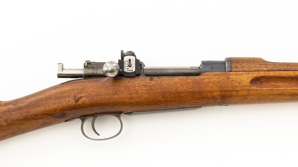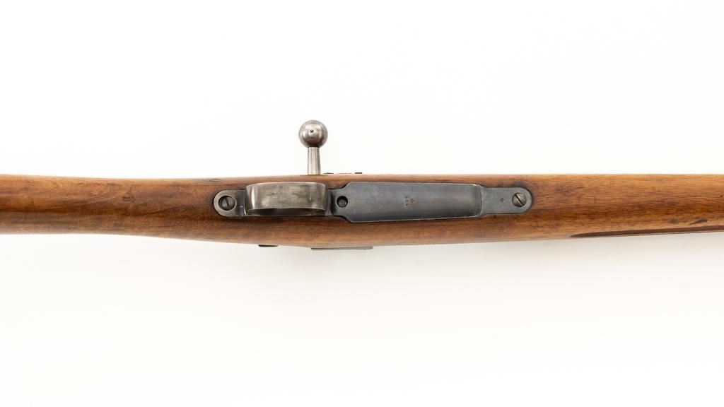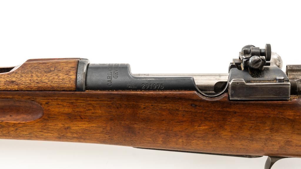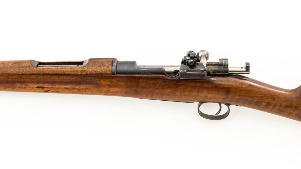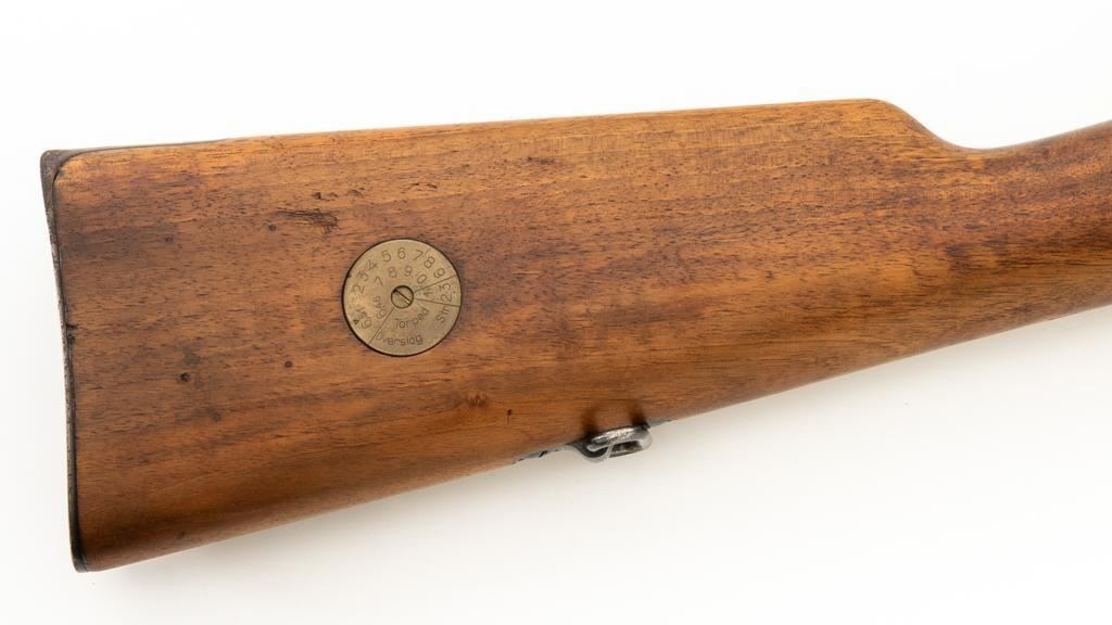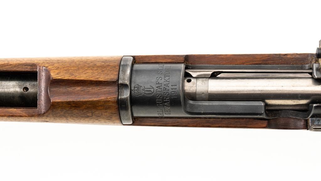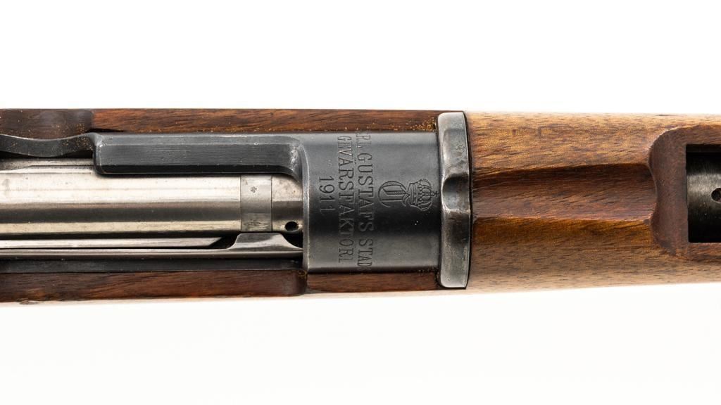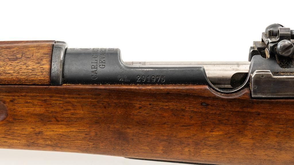 Target Modified Swedish M1896 Mauser Bolt Action Rifle, #291975, 6.5x55mm cal., 24'' barrel, blued finish, hardwood stock, and handguard. Issue sights have been removed. Now with a dovetailed blade front sight mounted to the barrel band and Lyman aperture target sight mounted to the rear receiver bridge. A brass disc is screwed to the right side butt stock showing bore and throat wear. Rifle has been modified by shortening the barrel and forend; removing the associated military hardware. Top of the receiver ring is marked ''(Crowned Swedish crest)/CARL GUSTAFS STADS/GEVARSFAKTORI/1911''. Matching bolt handle. Other numbers do not match. No visible import marks. Condition overall is very good as modified, retaining approx. 80%-85% blue, with thinning and toning to the trigger guard and nose cap. There is also an area of rust on the buttplate tang. Wood has been sanded and stained, now in very good condition, with a few scattered dents and a crack to the handguard. Action operates smoothly. Floorplate has been modified and the bolt will close on an empty chamber. Bright bore rates excellent with well-defined rifling. Est.: $400-$600. (C&R/PPT)