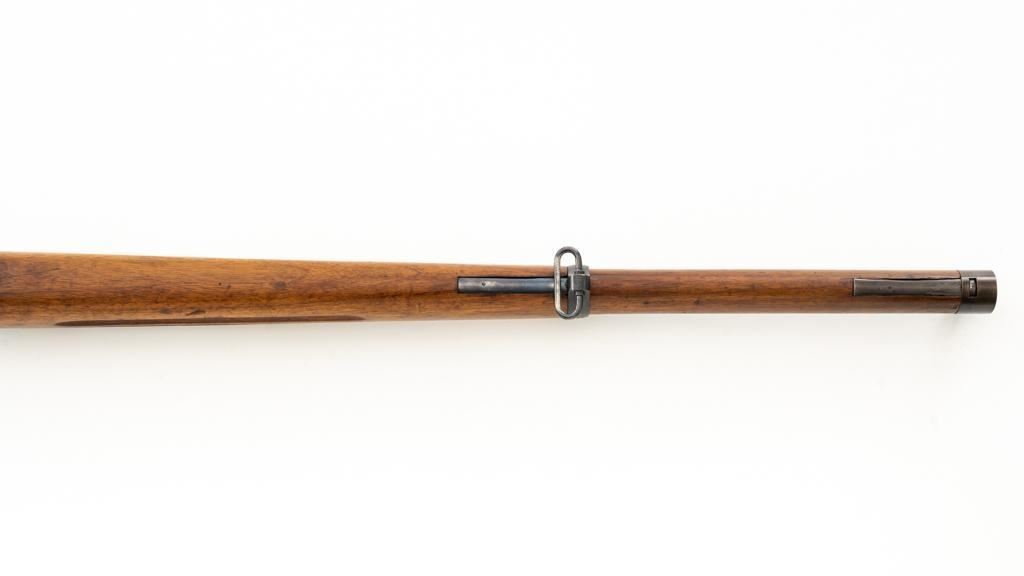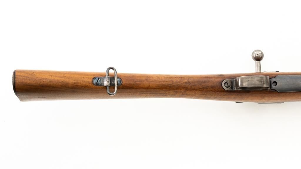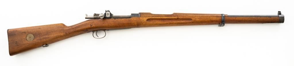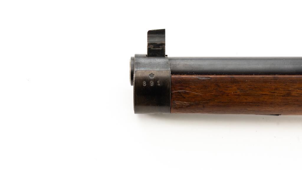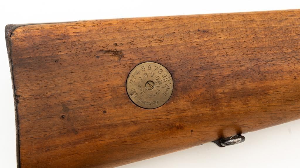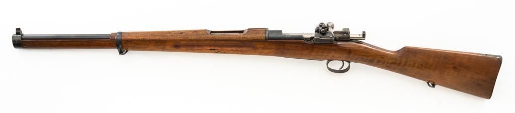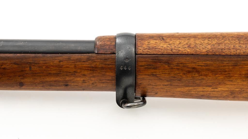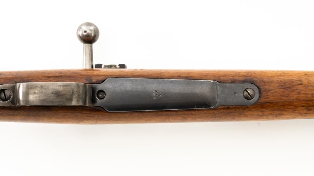 Target Modified Swedish M1896 Mauser Bolt Action Rifle, #291975, 6.5x55mm cal., 24'' barrel, blued finish, hardwood stock, and handguard. Issue sights have been removed. Now with a dovetailed blade front sight mounted to the barrel band and Lyman aperture target sight mounted to the rear receiver bridge. A brass disc is screwed to the right side butt stock showing bore and throat wear. Rifle has been modified by shortening the barrel and forend; removing the associated military hardware. Top of the receiver ring is marked ''(Crowned Swedish crest)/CARL GUSTAFS STADS/GEVARSFAKTORI/1911''. Matching bolt handle. Other numbers do not match. No visible import marks. Condition overall is very good as modified, retaining approx. 80%-85% blue, with thinning and toning to the trigger guard and nose cap. There is also an area of rust on the buttplate tang. Wood has been sanded and stained, now in very good condition, with a few scattered dents and a crack to the handguard. Action operates smoothly. Floorplate has been modified and the bolt will close on an empty chamber. Bright bore rates excellent with well-defined rifling. Est.: $400-$600. (C&R/PPT)