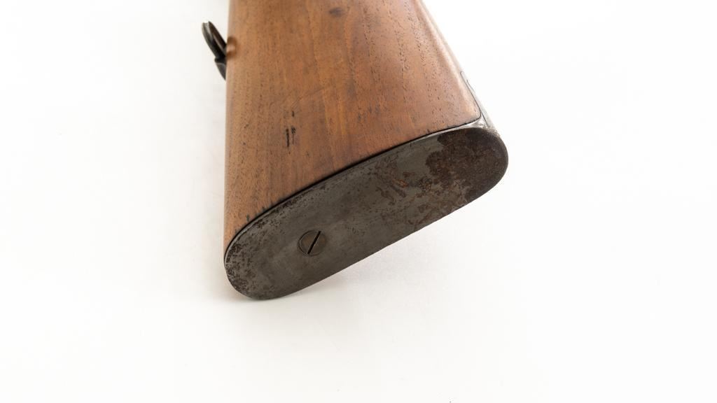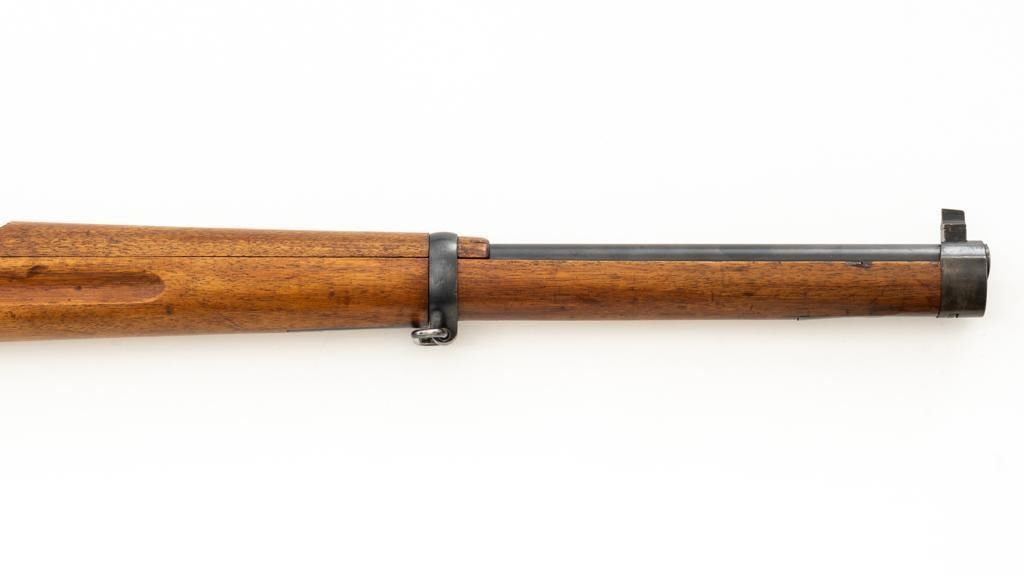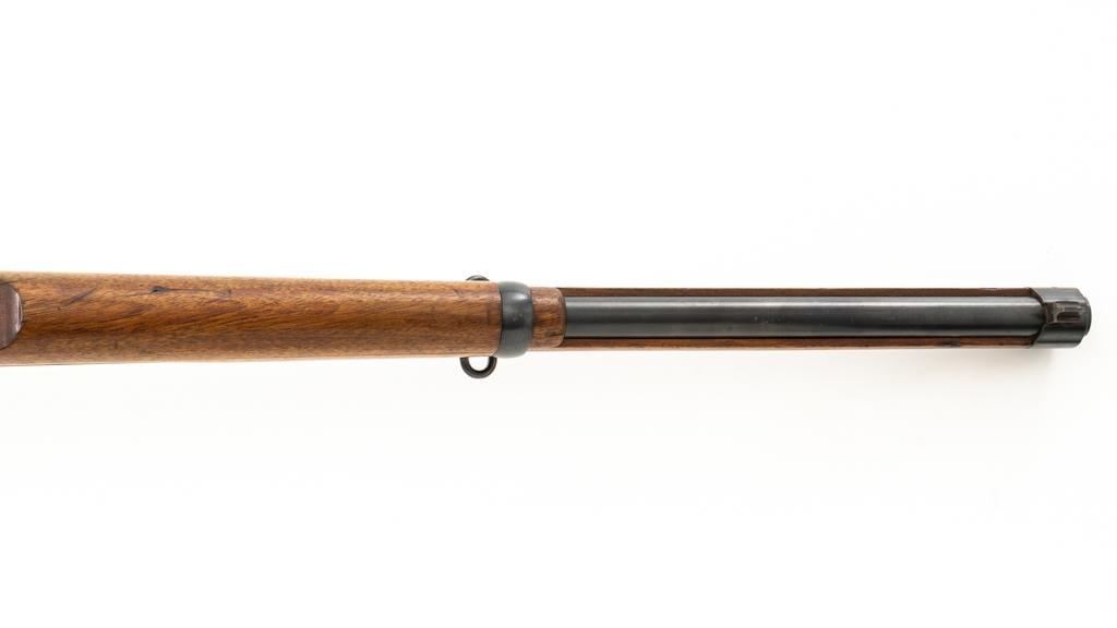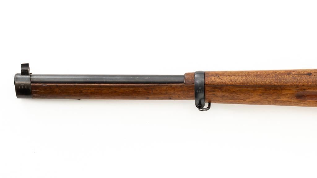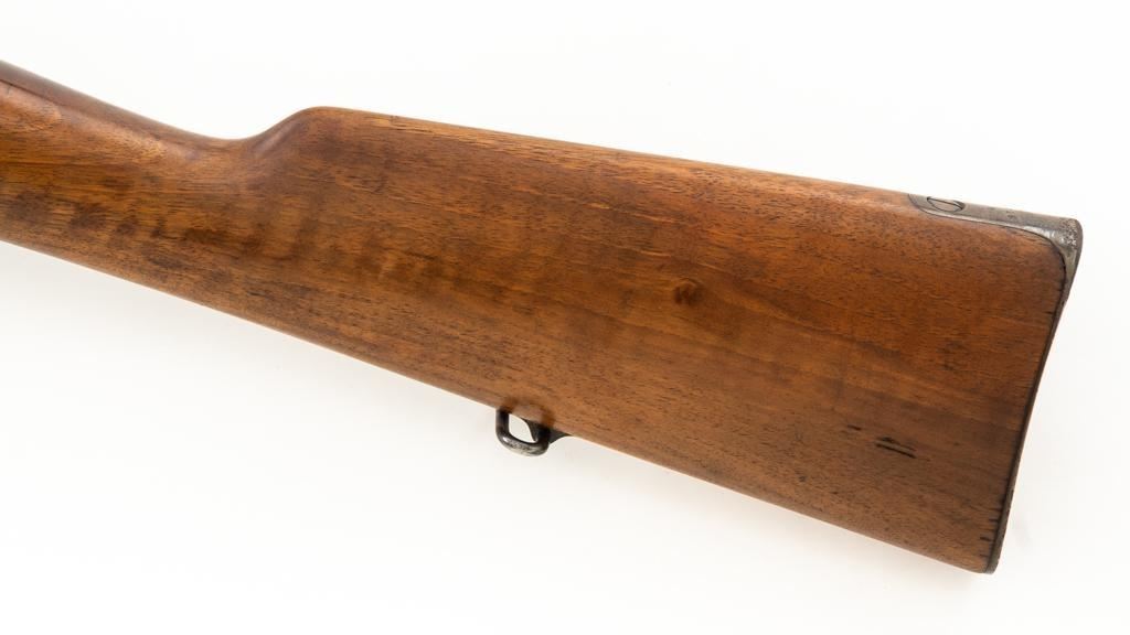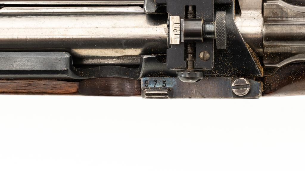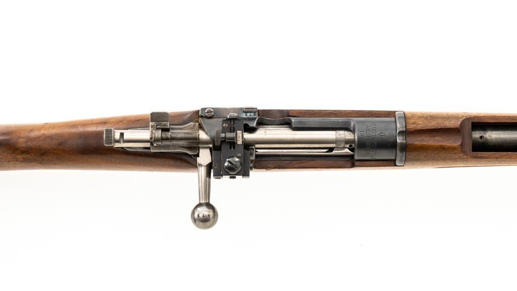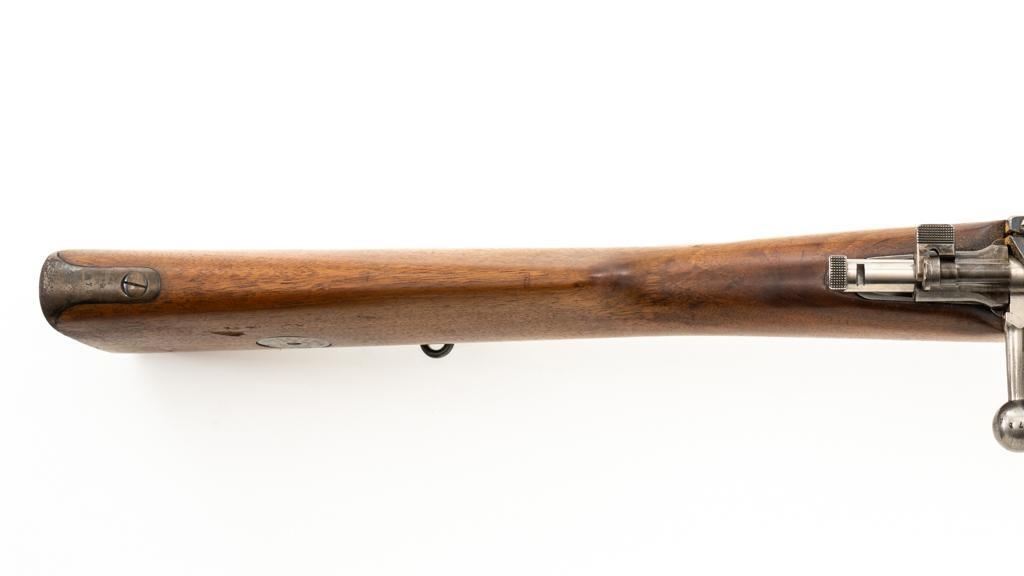 Target Modified Swedish M1896 Mauser Bolt Action Rifle, #291975, 6.5x55mm cal., 24'' barrel, blued finish, hardwood stock, and handguard. Issue sights have been removed. Now with a dovetailed blade front sight mounted to the barrel band and Lyman aperture target sight mounted to the rear receiver bridge. A brass disc is screwed to the right side butt stock showing bore and throat wear. Rifle has been modified by shortening the barrel and forend; removing the associated military hardware. Top of the receiver ring is marked ''(Crowned Swedish crest)/CARL GUSTAFS STADS/GEVARSFAKTORI/1911''. Matching bolt handle. Other numbers do not match. No visible import marks. Condition overall is very good as modified, retaining approx. 80%-85% blue, with thinning and toning to the trigger guard and nose cap. There is also an area of rust on the buttplate tang. Wood has been sanded and stained, now in very good condition, with a few scattered dents and a crack to the handguard. Action operates smoothly. Floorplate has been modified and the bolt will close on an empty chamber. Bright bore rates excellent with well-defined rifling. Est.: $400-$600. (C&R/PPT)