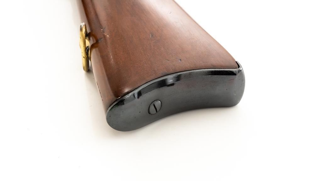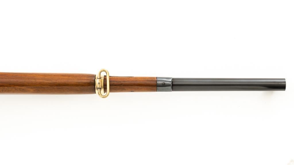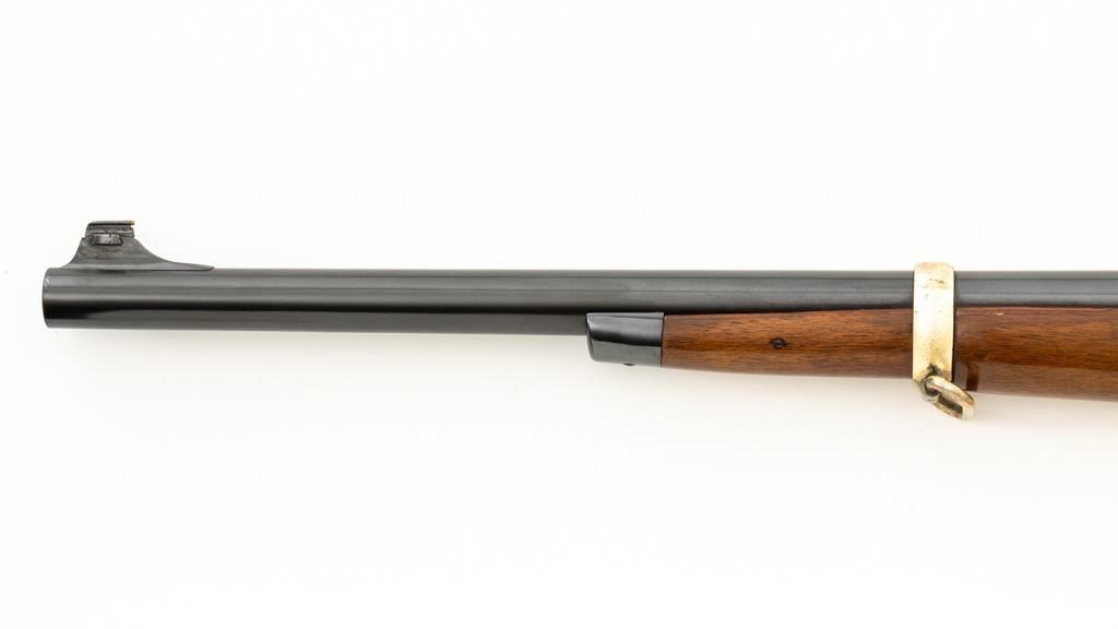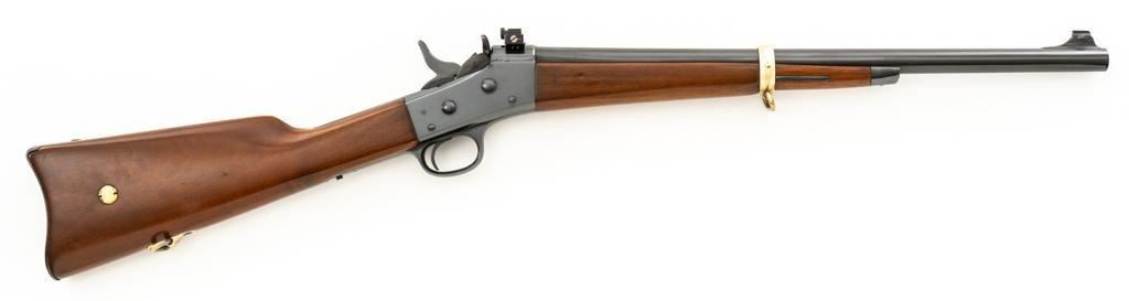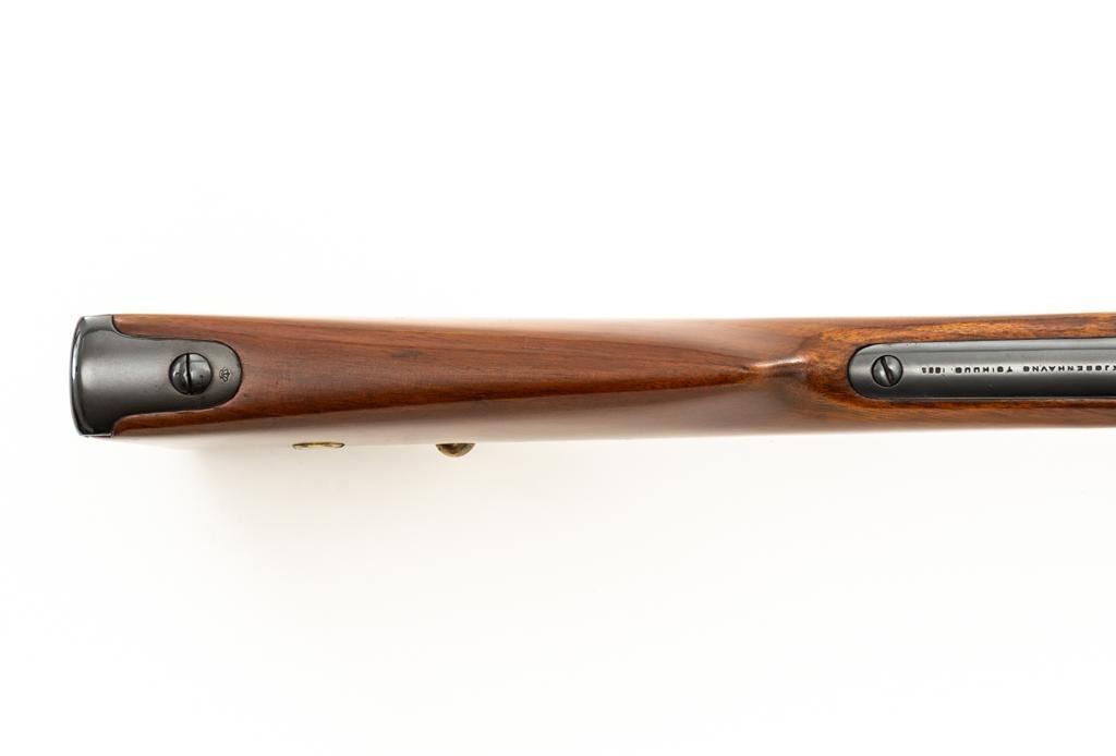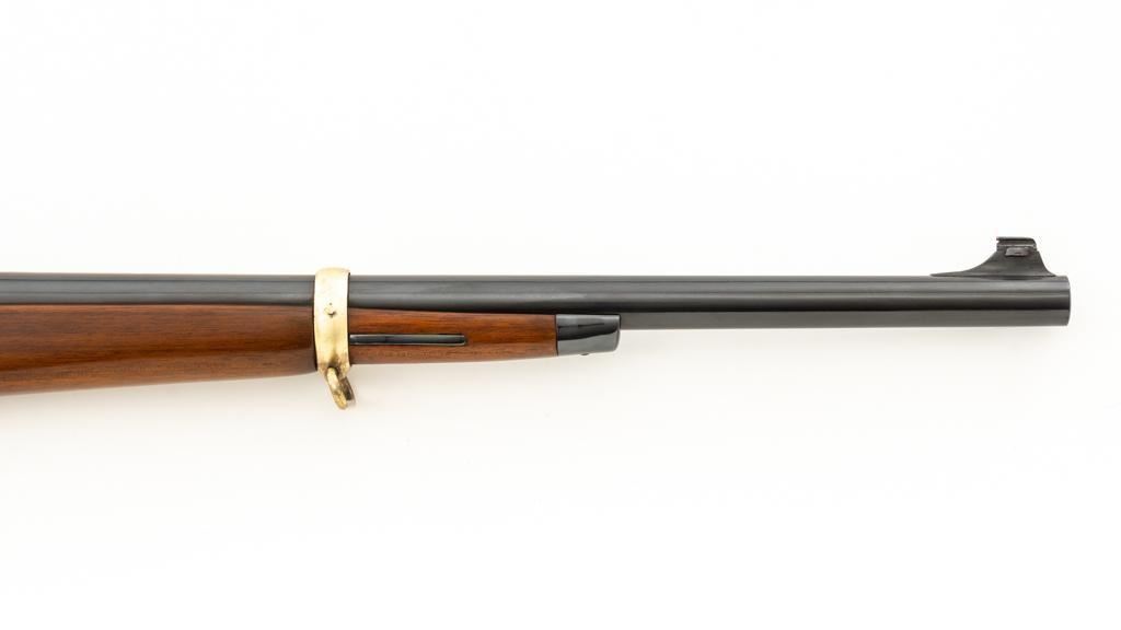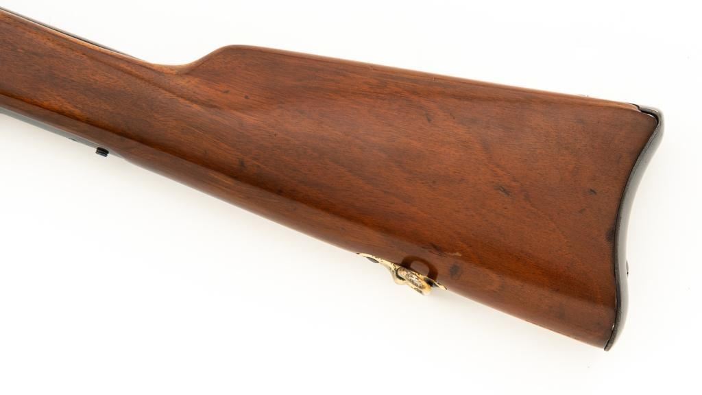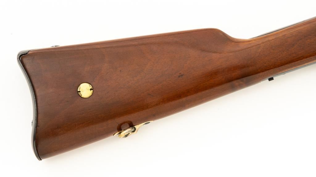 Modified Antique Danish Kjobenhavns Toihuus Model 1867 Rolling Block Carbine, #61343, 11.7mm cal., 20'' barrel, refinished blue; gold colored barrel band, sling swivel base at rear of buttstock, and dime-size disc inset at the rear right side of the buttstock. Forend with added black forend cap. Replacement brass beaded front sight on ramped base with added Williams adjustable peep sight at left rear of the receiver. Upper tang is marked ''Kjobenhavns Toihuus 1882''. Condition of this rifle is fine as refinished, presenting approx. 98% blue and gold colored finish, with some mild pitting to left side of the receiver. Markings are sharp. Wood with scattered small dents and scratches. Action is crisp. Bore is excellent with defined rifling. Est.: $300-$500. (Antique)