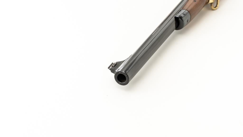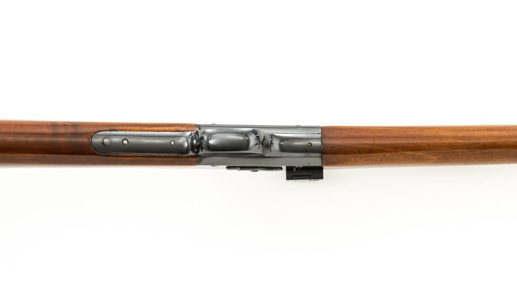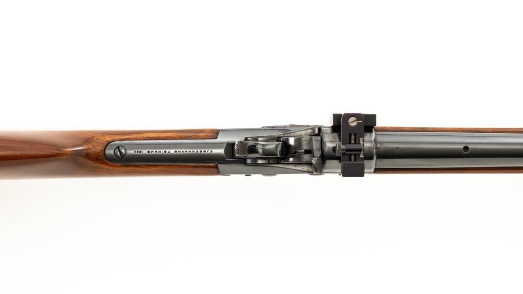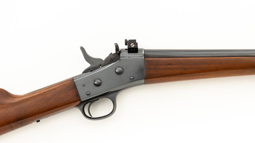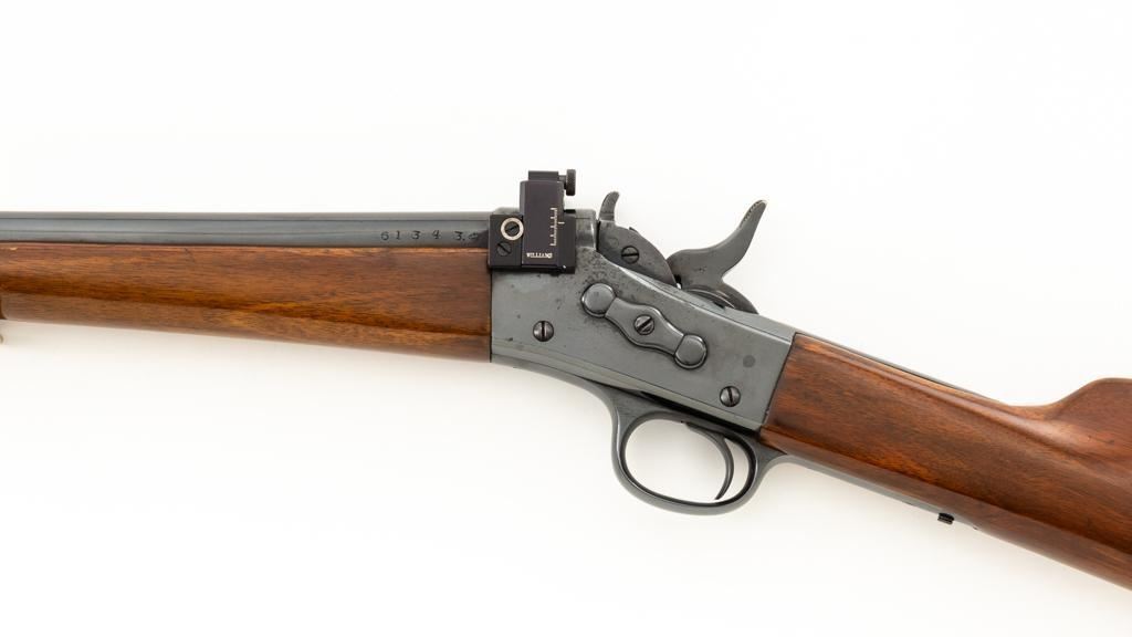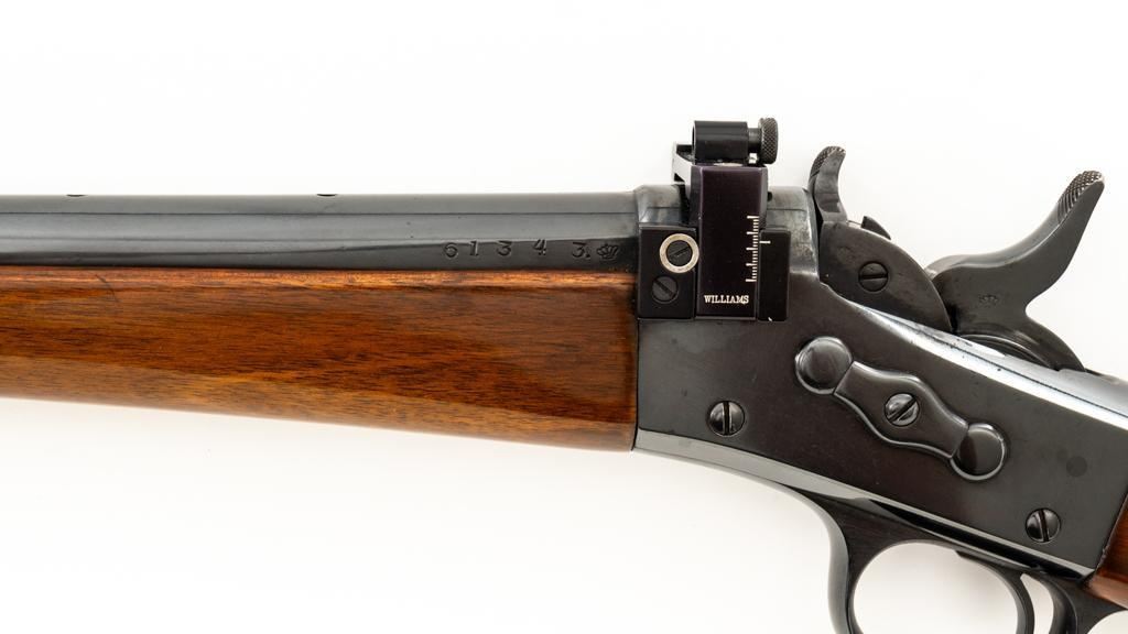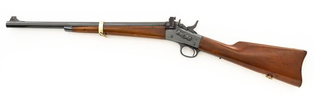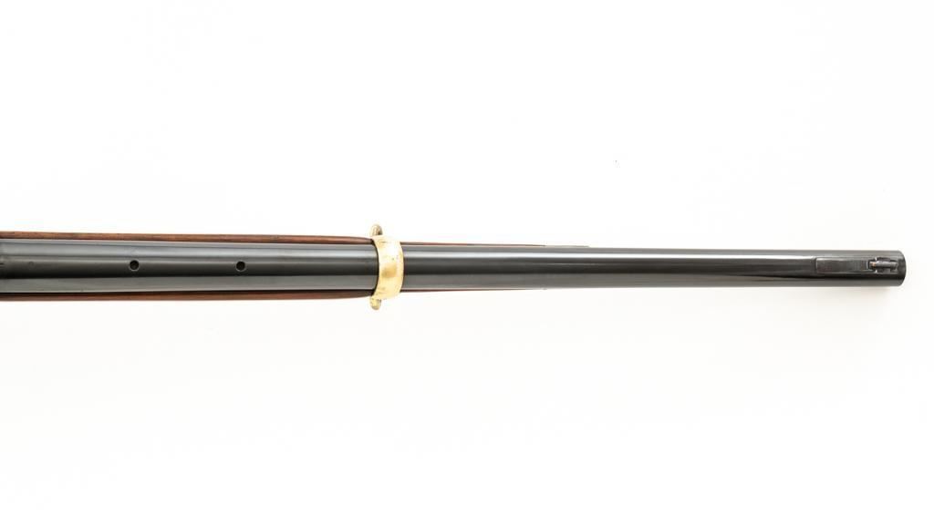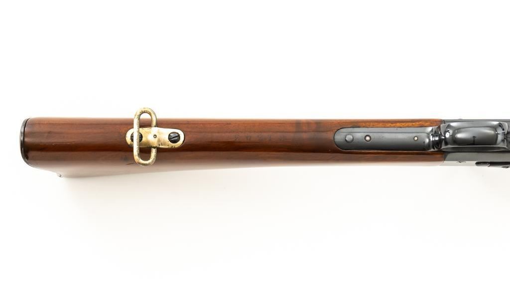 Modified Antique Danish Kjobenhavns Toihuus Model 1867 Rolling Block Carbine, #61343, 11.7mm cal., 20'' barrel, refinished blue; gold colored barrel band, sling swivel base at rear of buttstock, and dime-size disc inset at the rear right side of the buttstock. Forend with added black forend cap. Replacement brass beaded front sight on ramped base with added Williams adjustable peep sight at left rear of the receiver. Upper tang is marked ''Kjobenhavns Toihuus 1882''. Condition of this rifle is fine as refinished, presenting approx. 98% blue and gold colored finish, with some mild pitting to left side of the receiver. Markings are sharp. Wood with scattered small dents and scratches. Action is crisp. Bore is excellent with defined rifling. Est.: $300-$500. (Antique)