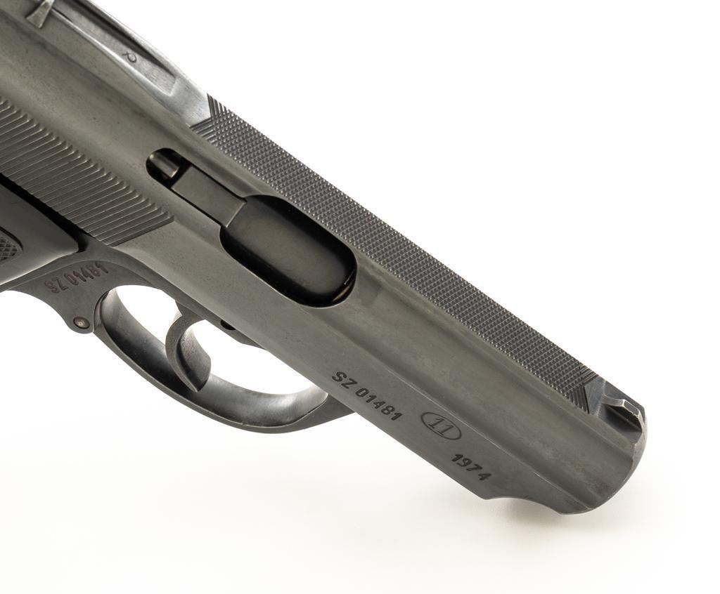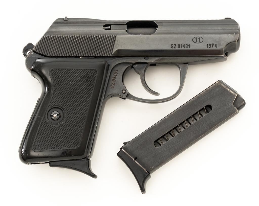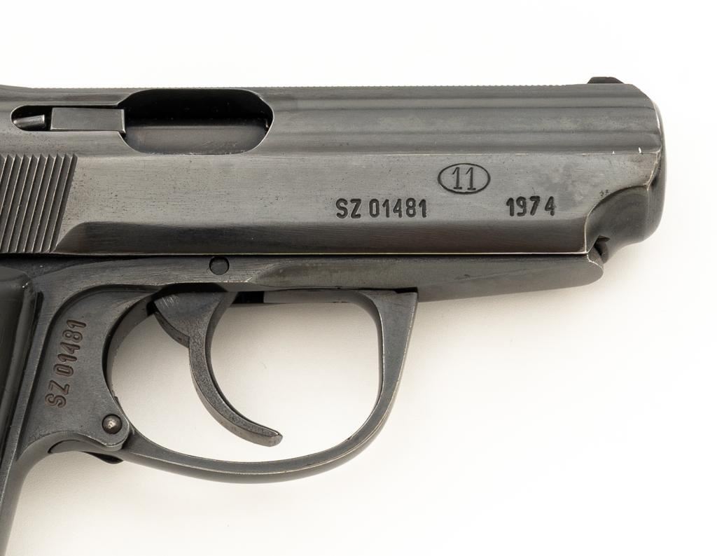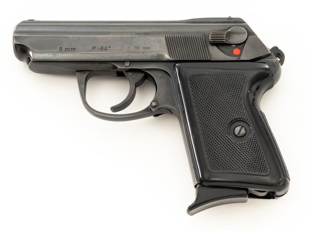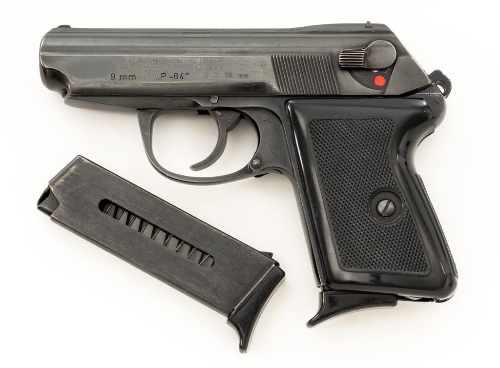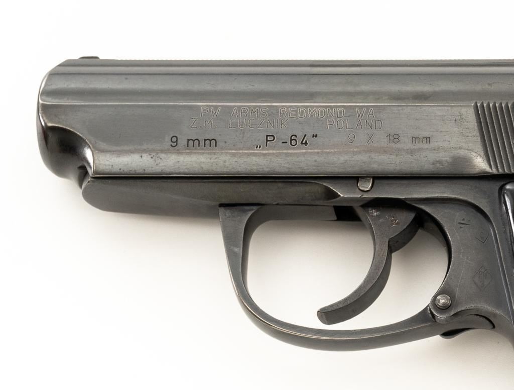 Polish Z.M. Lucznik Model P-64 Double Action Semi-Automatic Pistol, #SZ01481, 9mm Makarov cal., 3.25'' barrel, blue finish, checkered plastic two-piece grips, low profile blade front, and drift adjustable square-notch rear sight, with two (2) 8-round blue steel magazines with finger extensions. Marked ''Z. M. LUCZNIK POLAND'' and import marked on the left side of the slide; right side is dated 1974 with an ''11'' in an oval. Pistol is in fine overall condition, retaining approx. 94%-95% finish, with holster wear at the muzzle and along the slide. Front strap and trigger guard show light edgewear and thinning finish. Grips show moderate handling marks. Action functions well. Bore is very good with some light frosting in the grooves and well-defined rifling. Est.: $300-$400. (C&R)