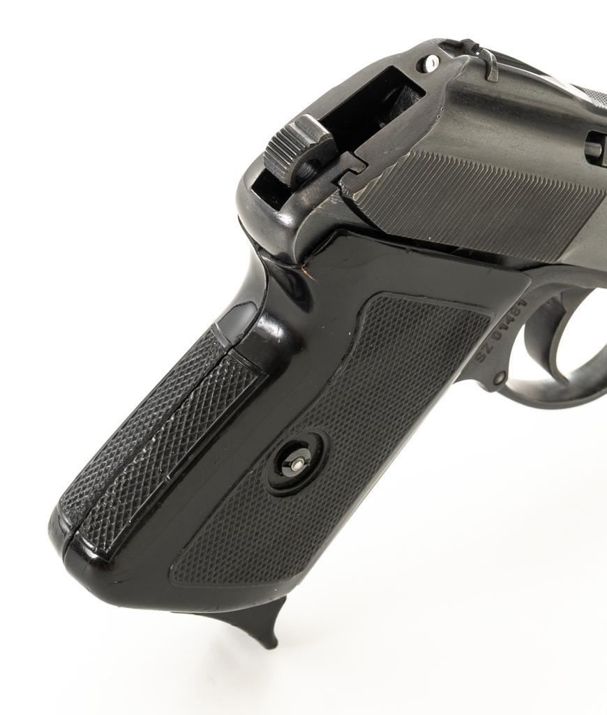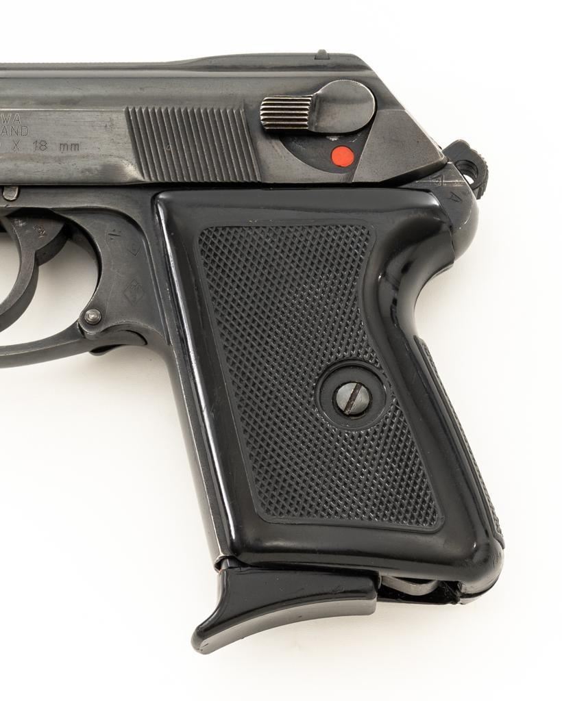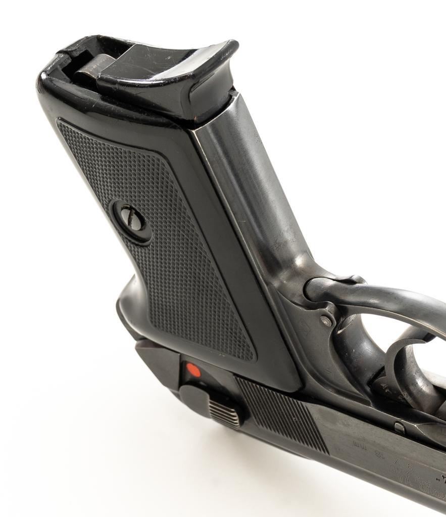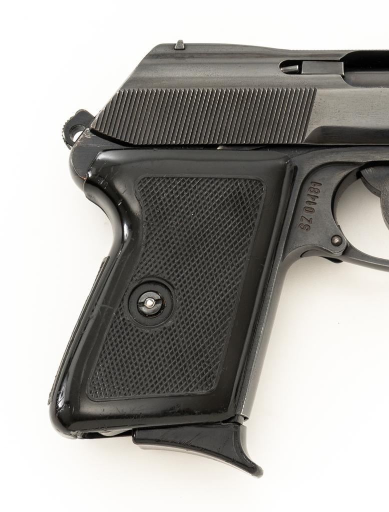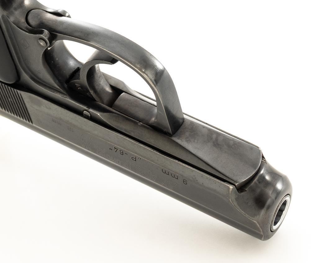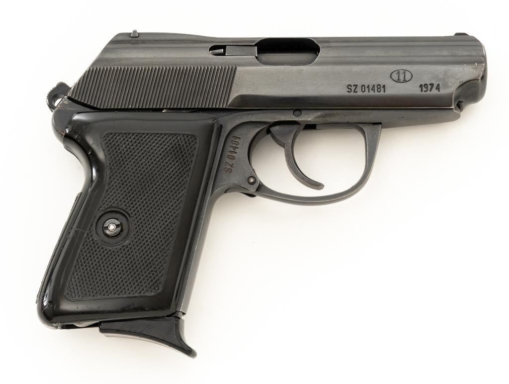 Polish Z.M. Lucznik Model P-64 Double Action Semi-Automatic Pistol, #SZ01481, 9mm Makarov cal., 3.25'' barrel, blue finish, checkered plastic two-piece grips, low profile blade front, and drift adjustable square-notch rear sight, with two (2) 8-round blue steel magazines with finger extensions. Marked ''Z. M. LUCZNIK POLAND'' and import marked on the left side of the slide; right side is dated 1974 with an ''11'' in an oval. Pistol is in fine overall condition, retaining approx. 94%-95% finish, with holster wear at the muzzle and along the slide. Front strap and trigger guard show light edgewear and thinning finish. Grips show moderate handling marks. Action functions well. Bore is very good with some light frosting in the grooves and well-defined rifling. Est.: $300-$400. (C&R)